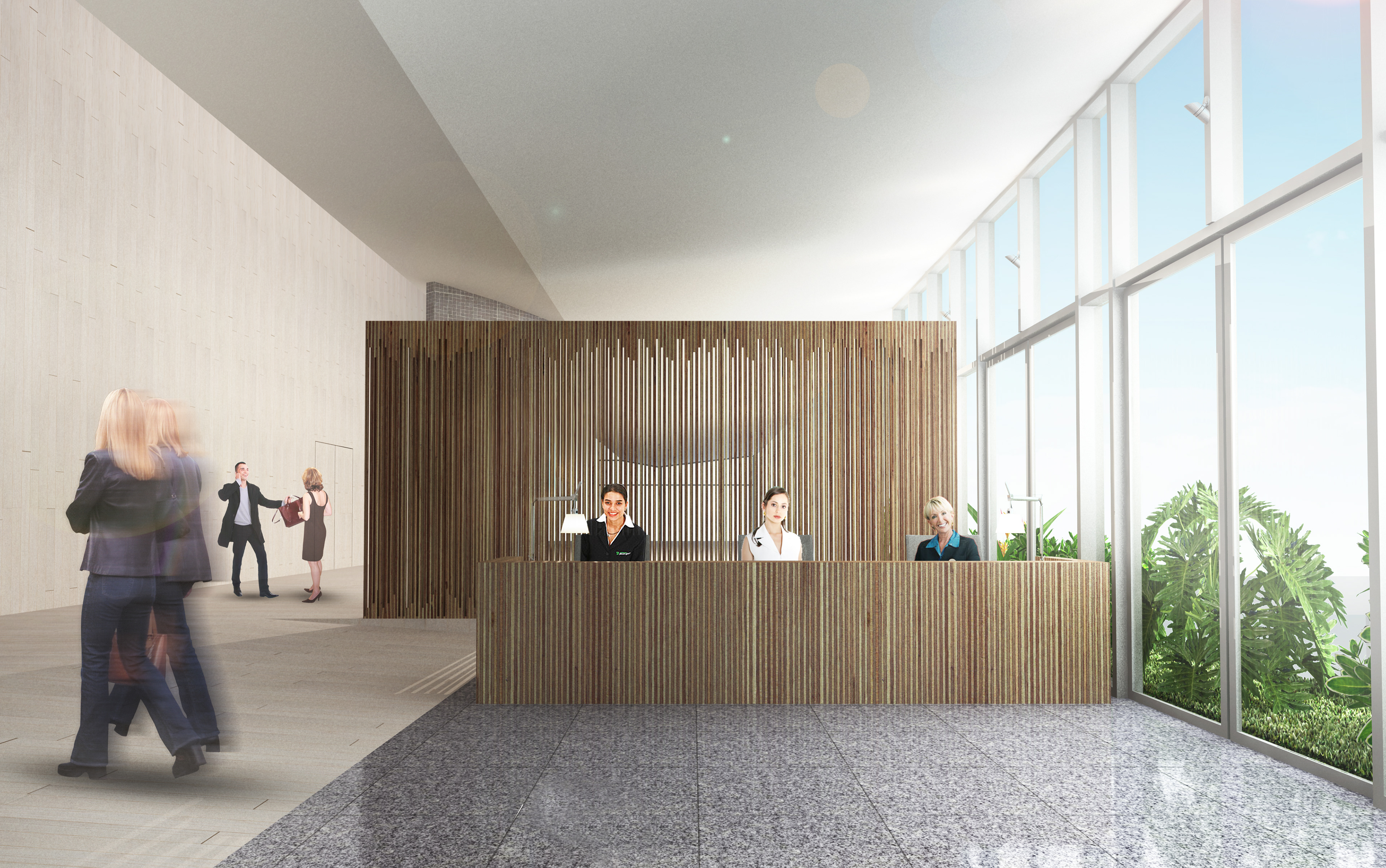 No alinhamento do centro dessas portas definimos um novo eixo com novo balcão de recepção com painel institucional ao fundo. À esquerda de quem entra, uma espera, hoje inexistente, que terá o novo paisagismo ao fundo na área verde proposta. À direita, uma recepção montada específicamente para os eventos que a AMCHAM realiza, com um painel vazado artistico ao fundo, proporcionando alguma transparencia mas nao revelando por completo o amplo ambiente de entrada do Centro de Convenções.