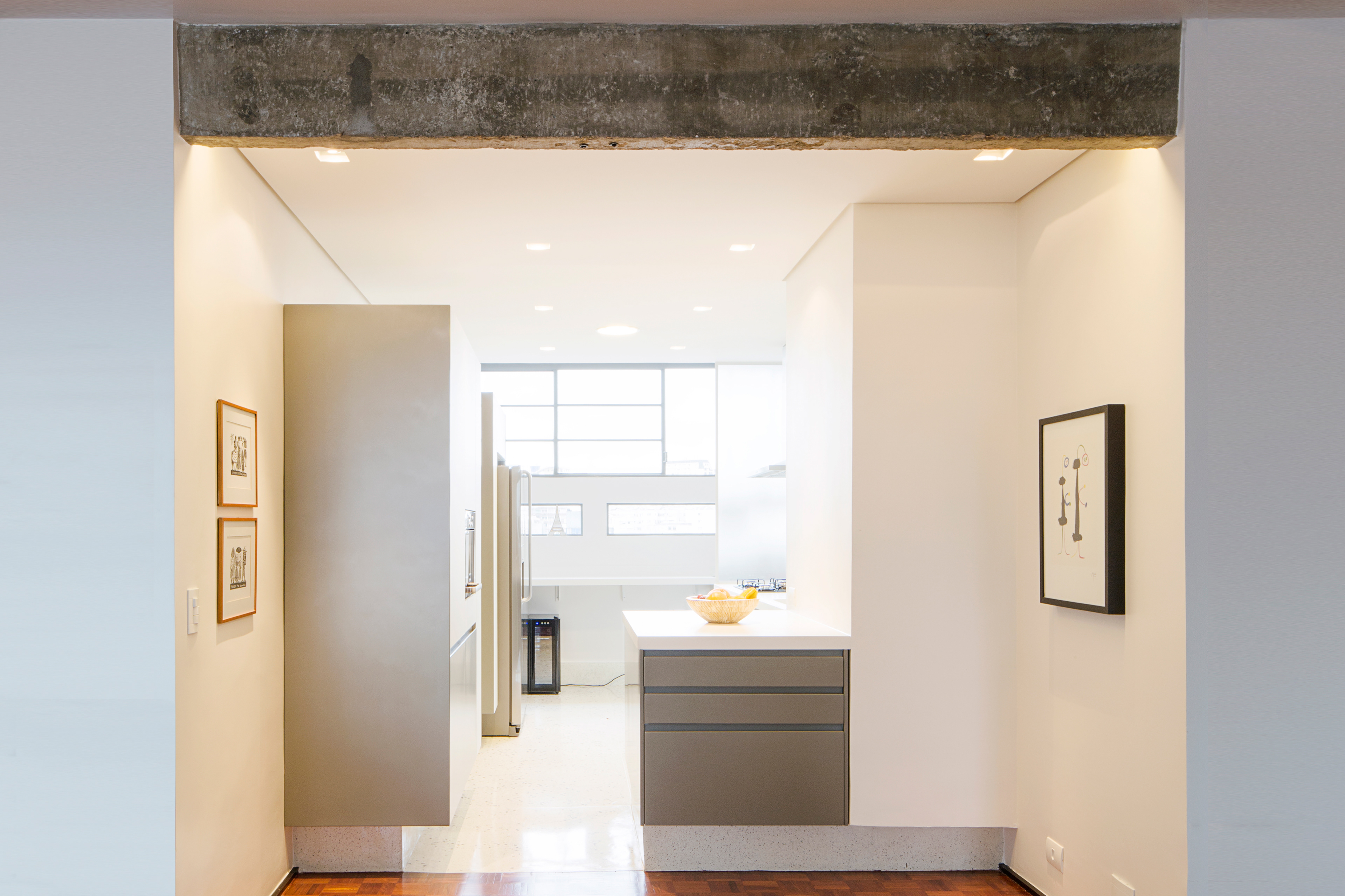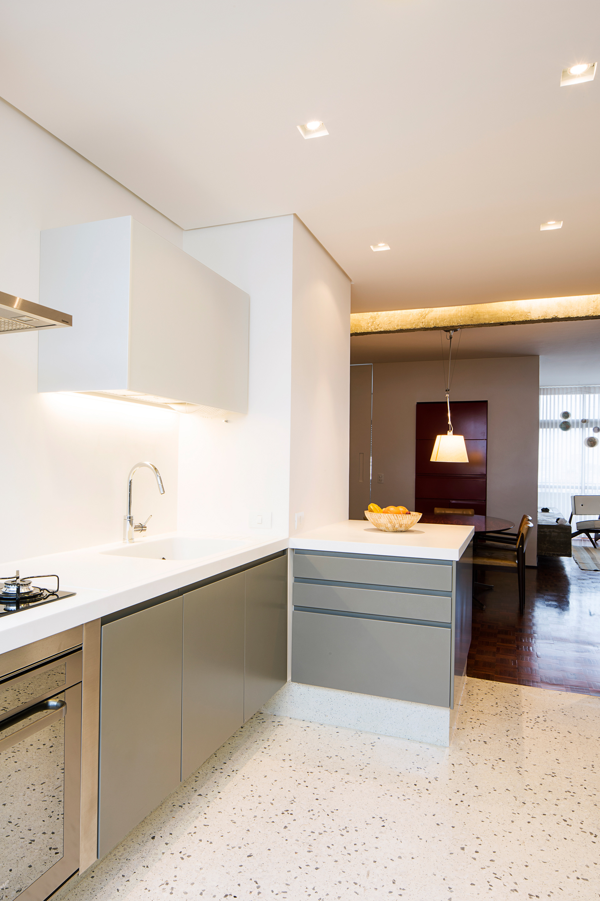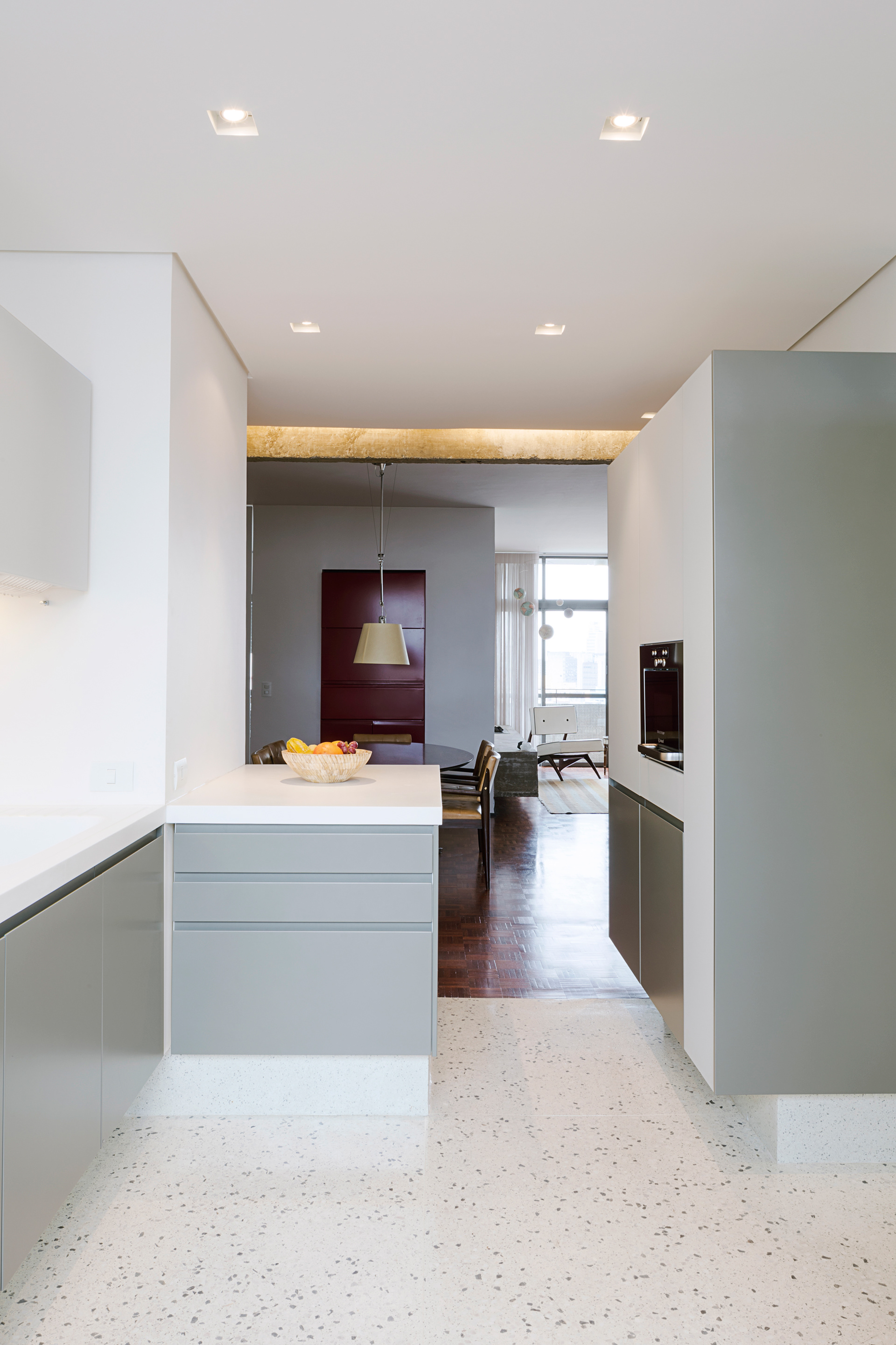 Queriam tudo o mais integrado possivel e o projeto estrutural original do edificio modernista, idealizado pelo arquiteto João Kon, favorece este partido, uma vez que só existe um pilar no meio da planta.