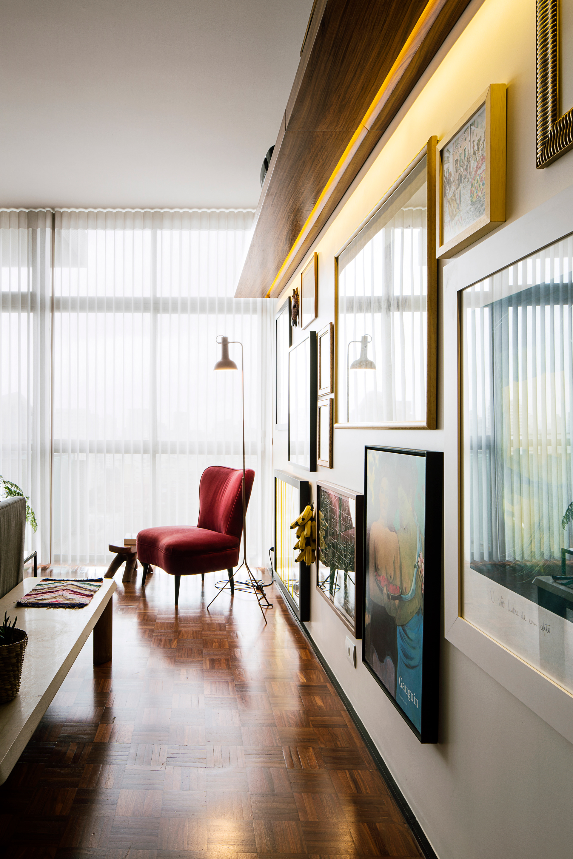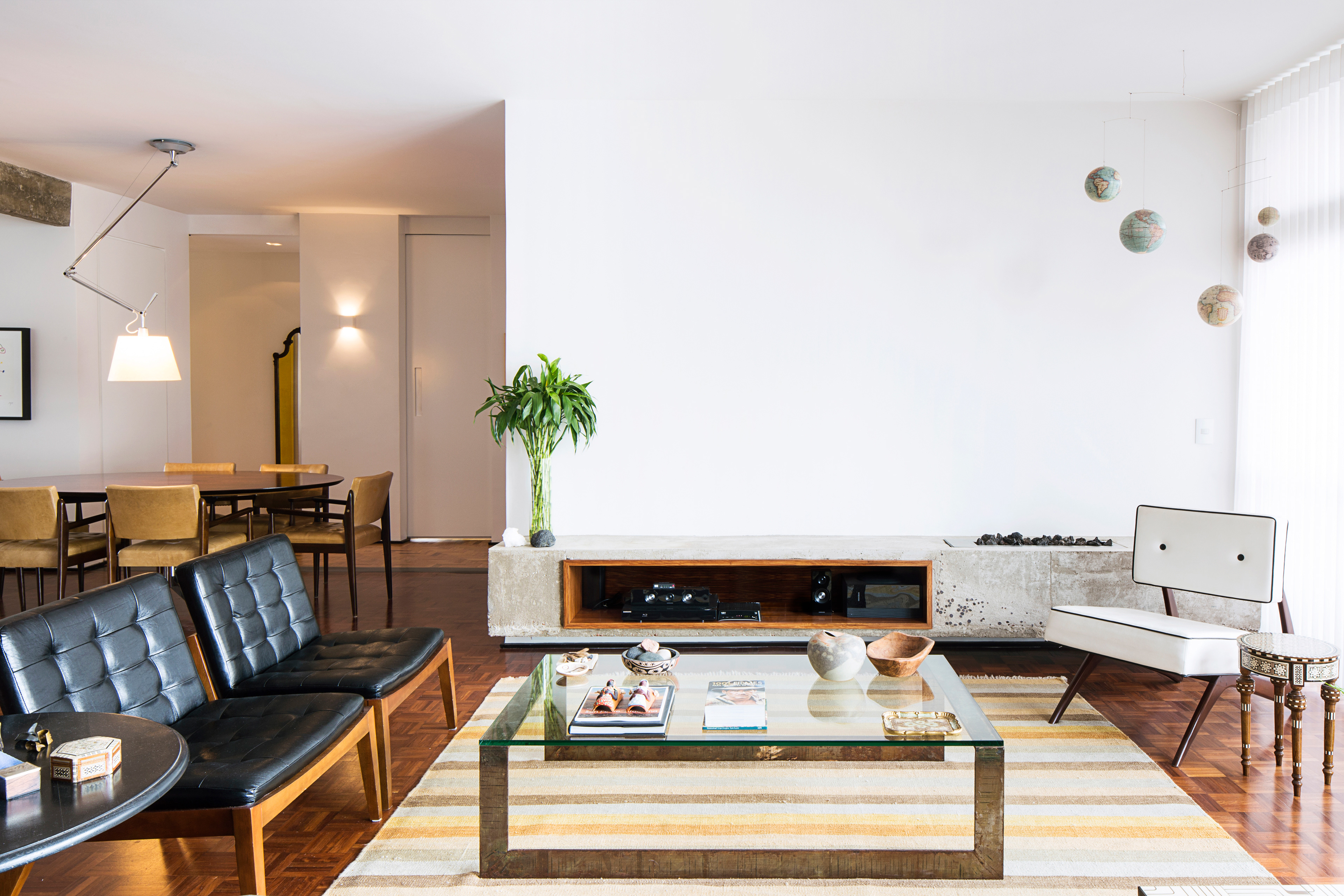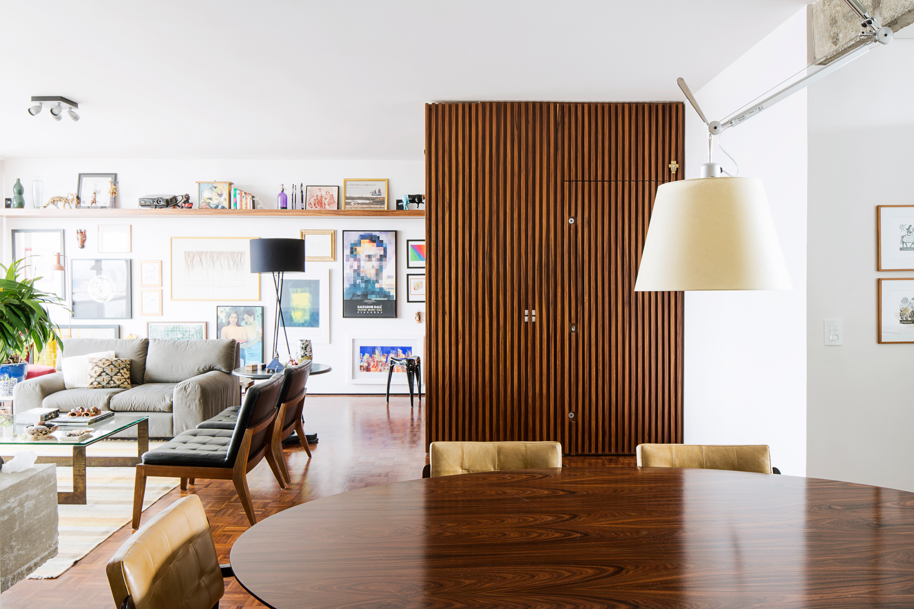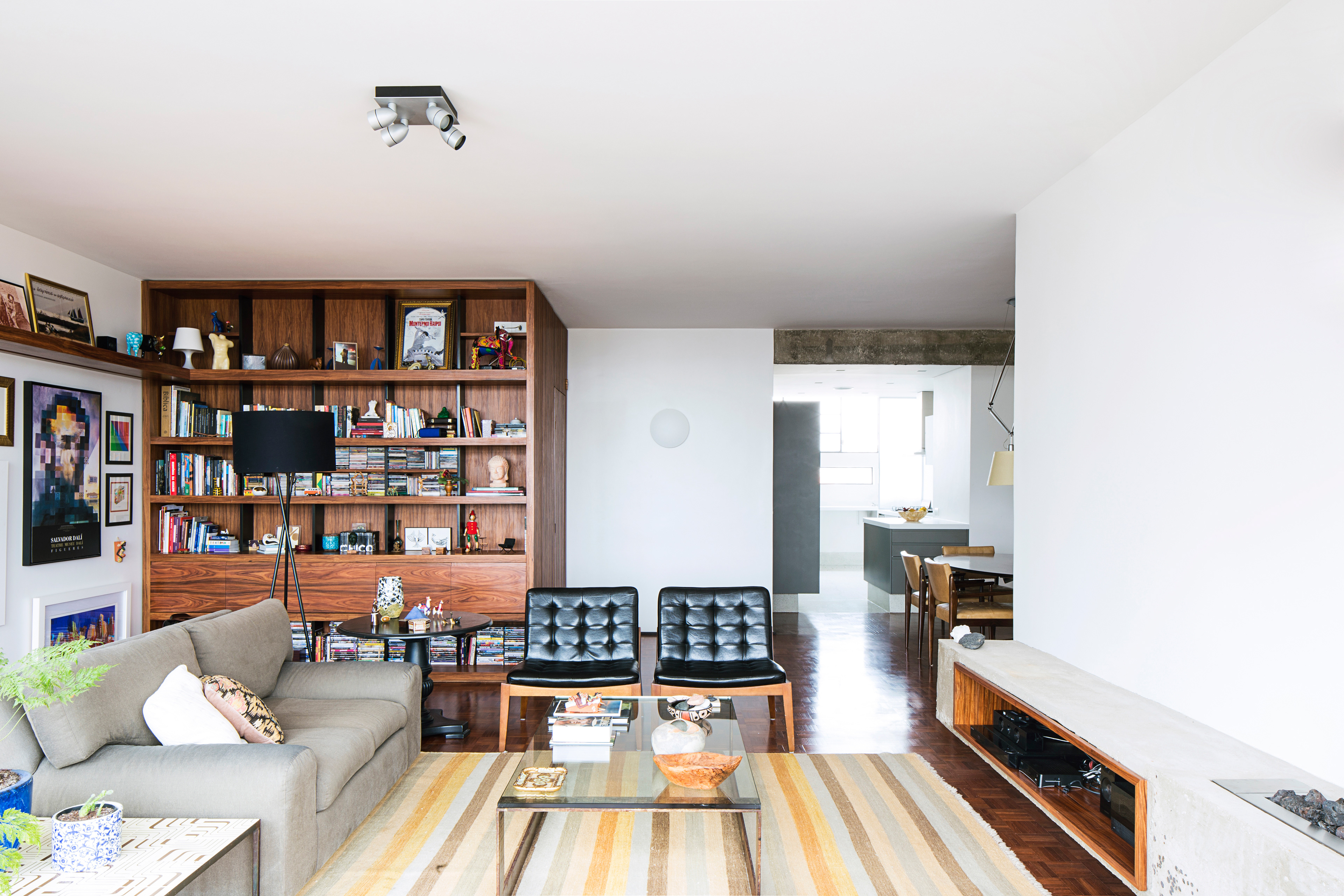 Queriam tudo o mais integrado possivel e o projeto estrutural original do edificio modernista, idealizado pelo arquiteto João Kon, favorece este partido, uma vez que só existe um pilar no meio da planta.