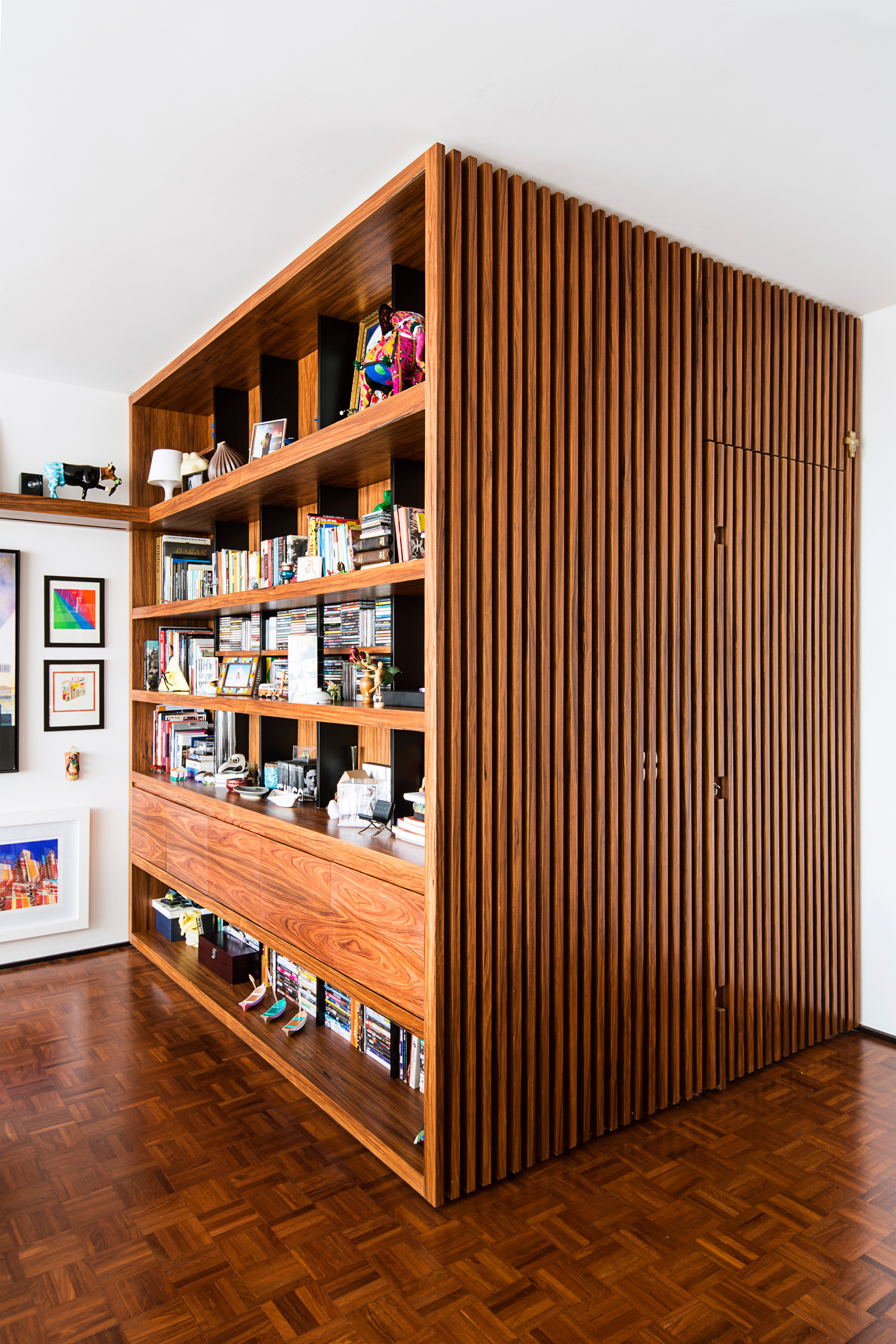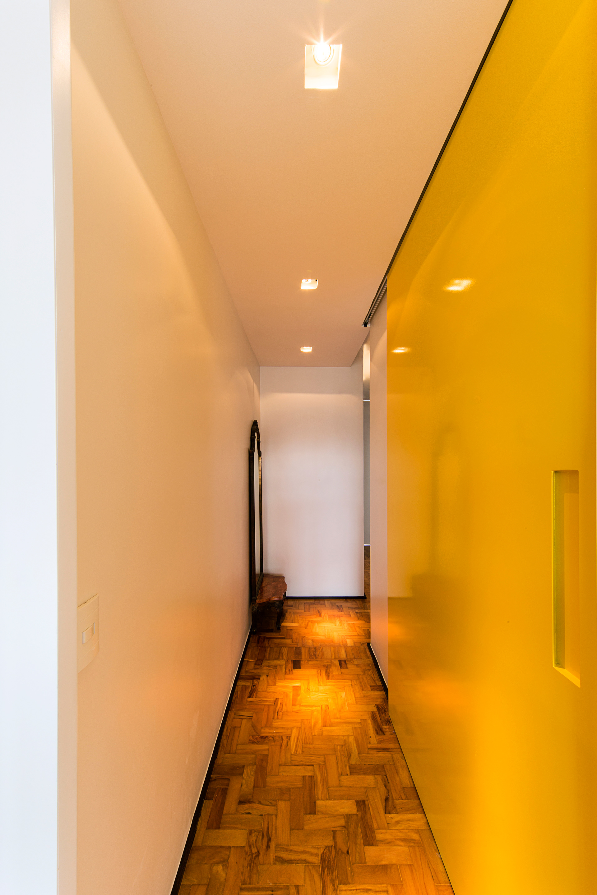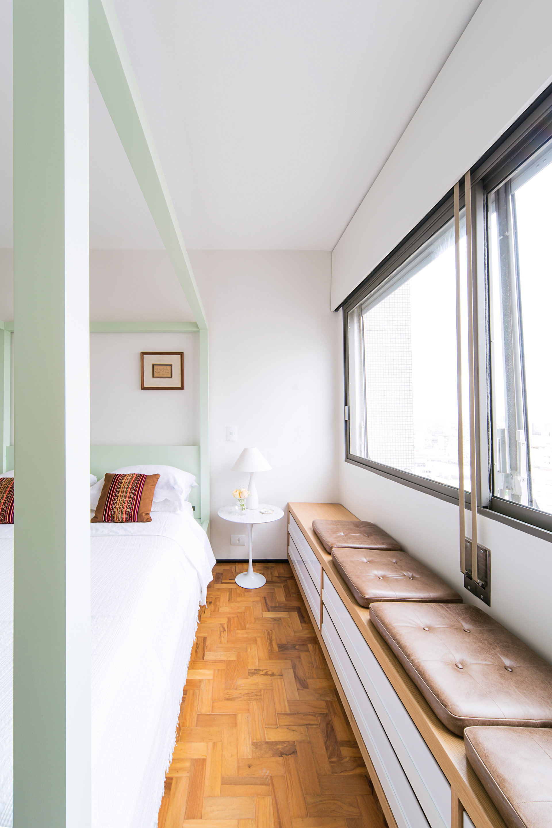 Toda marcenaria foi desenhada pelos arquitetos assim como algumas mobilias, entre elas a cama da suíte com dossel em laca verde-água. A porta de entrada principal fica camuflada entre as ripas de madeira que completam o volume da estante da sala, e todas as outras portas internas vão até o teto uma vez que quase não há vigas e não foi adotado forro de gesso em todos ambientes, apenas na cozinha e na pequena circulação de acesso a um dos quartos.
