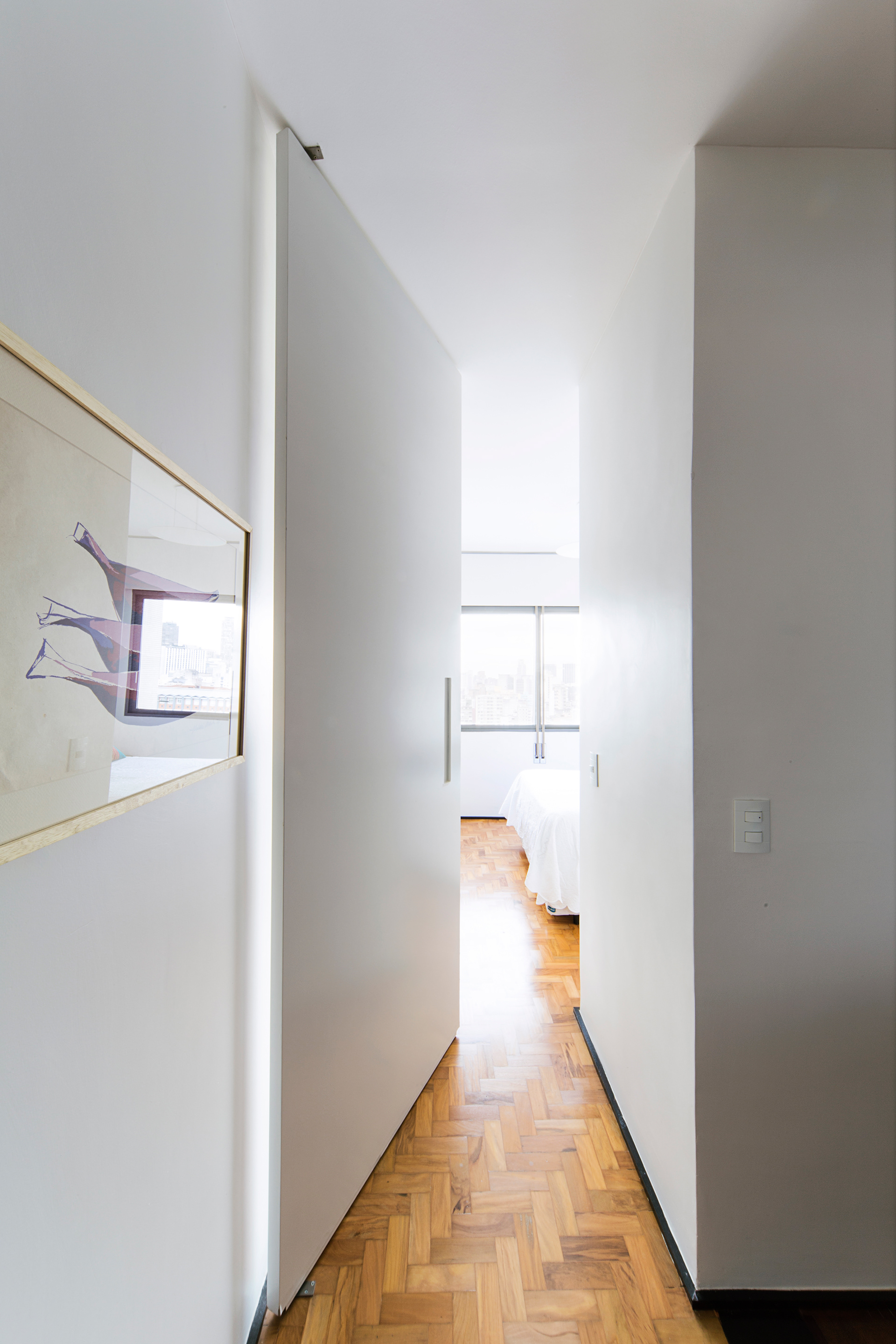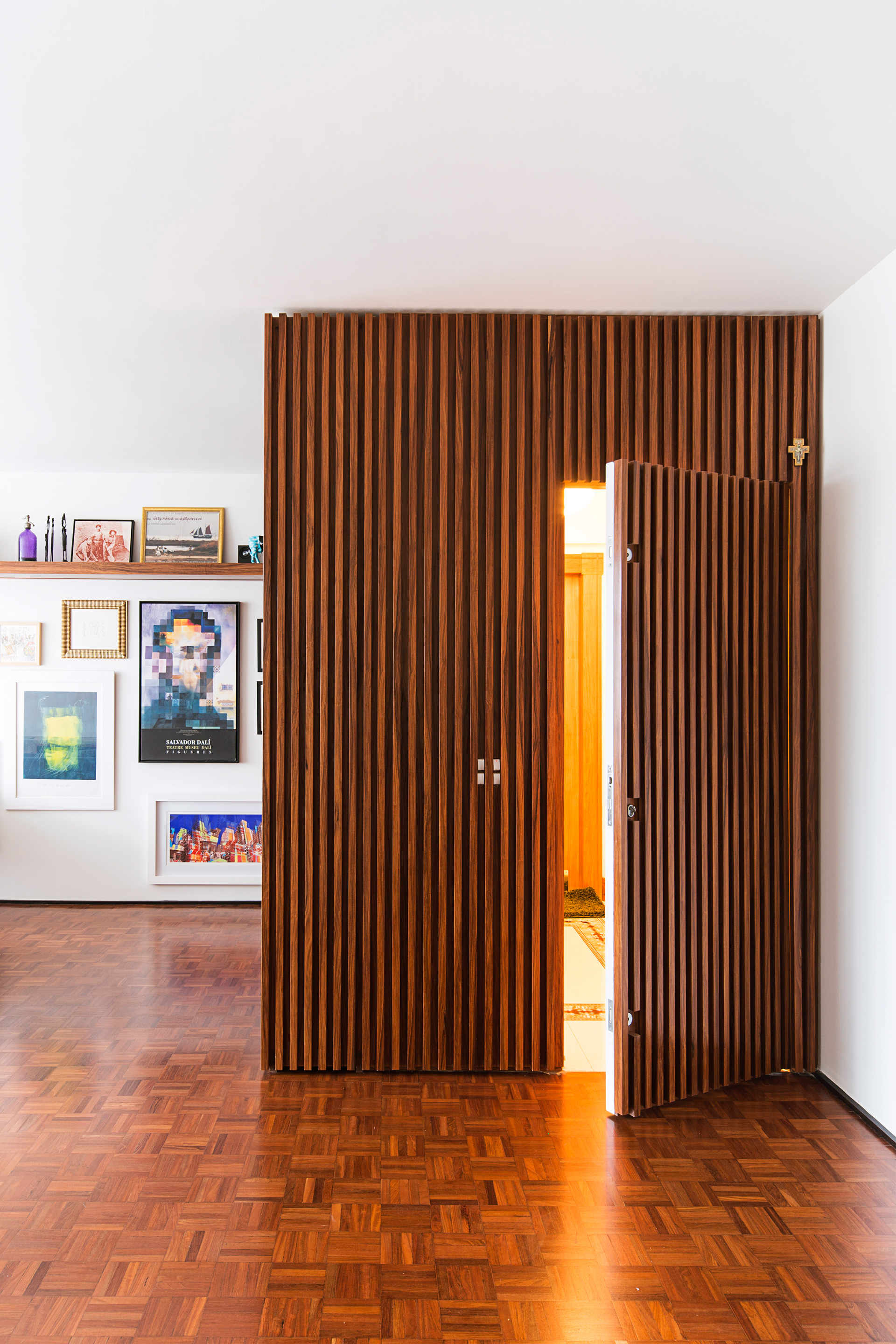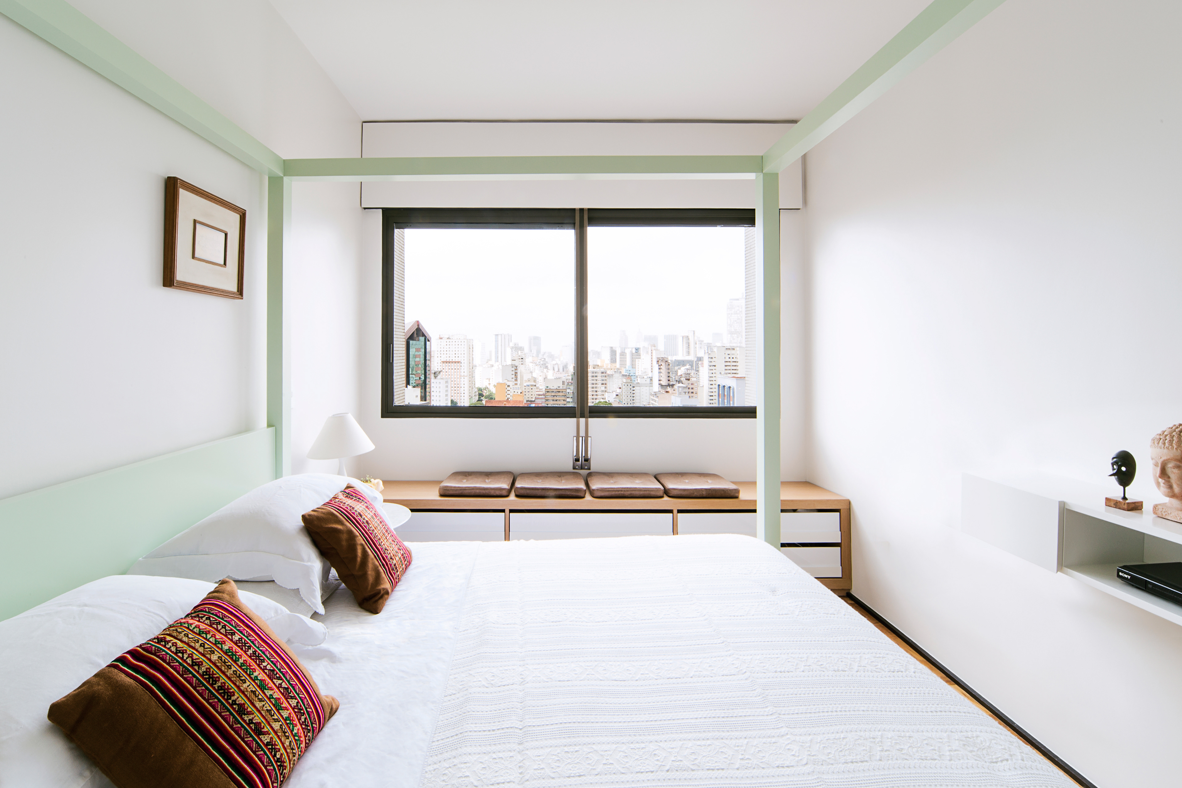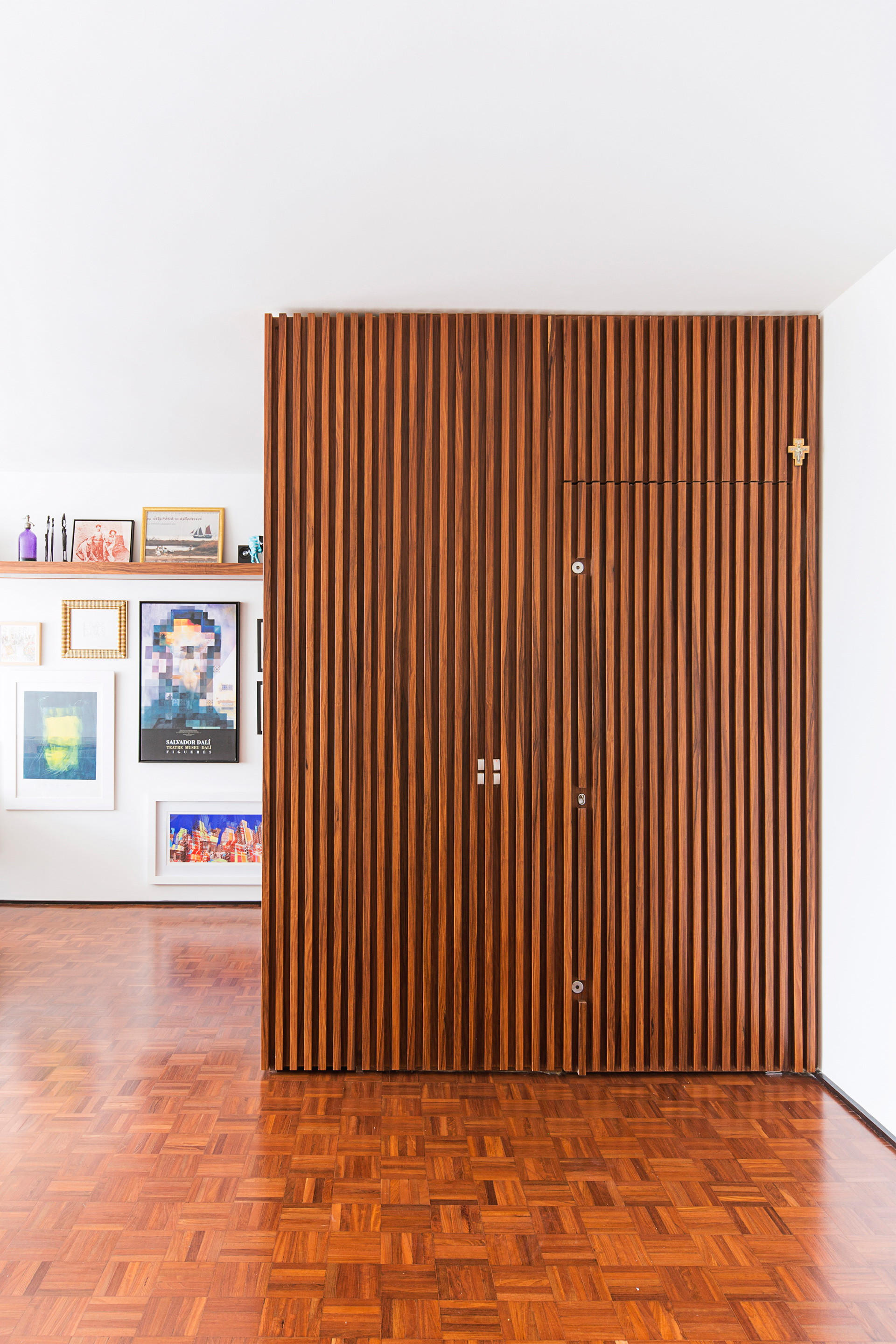 Toda marcenaria foi desenhada pelos arquitetos assim como algumas mobilias, entre elas a cama da suíte com dossel em laca verde-água. A porta de entrada principal fica camuflada entre as ripas de madeira que completam o volume da estante da sala, e todas as outras portas internas vão até o teto uma vez que quase não há vigas e não foi adotado forro de gesso em todos ambientes, apenas na cozinha e na pequena circulação de acesso a um dos quartos.