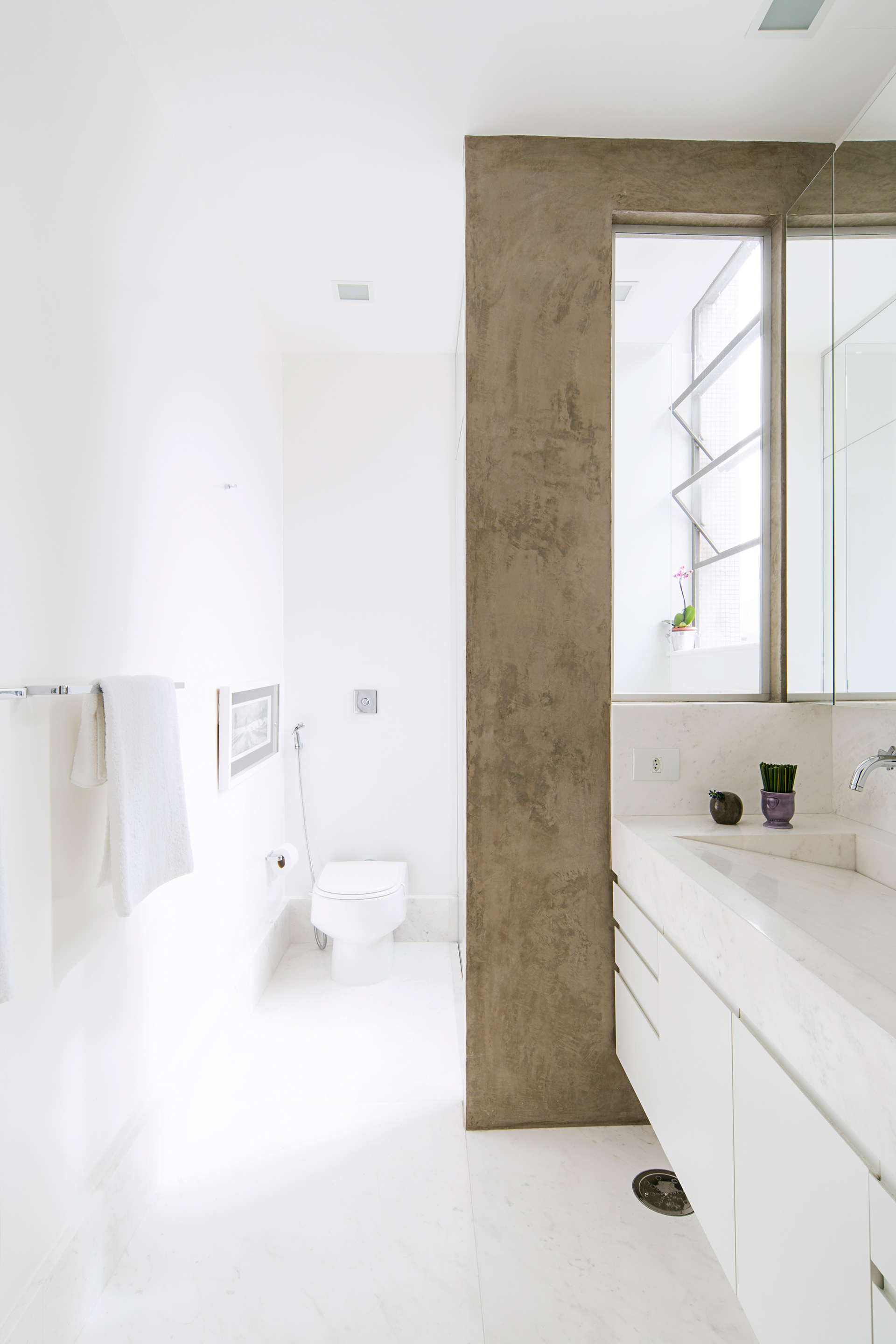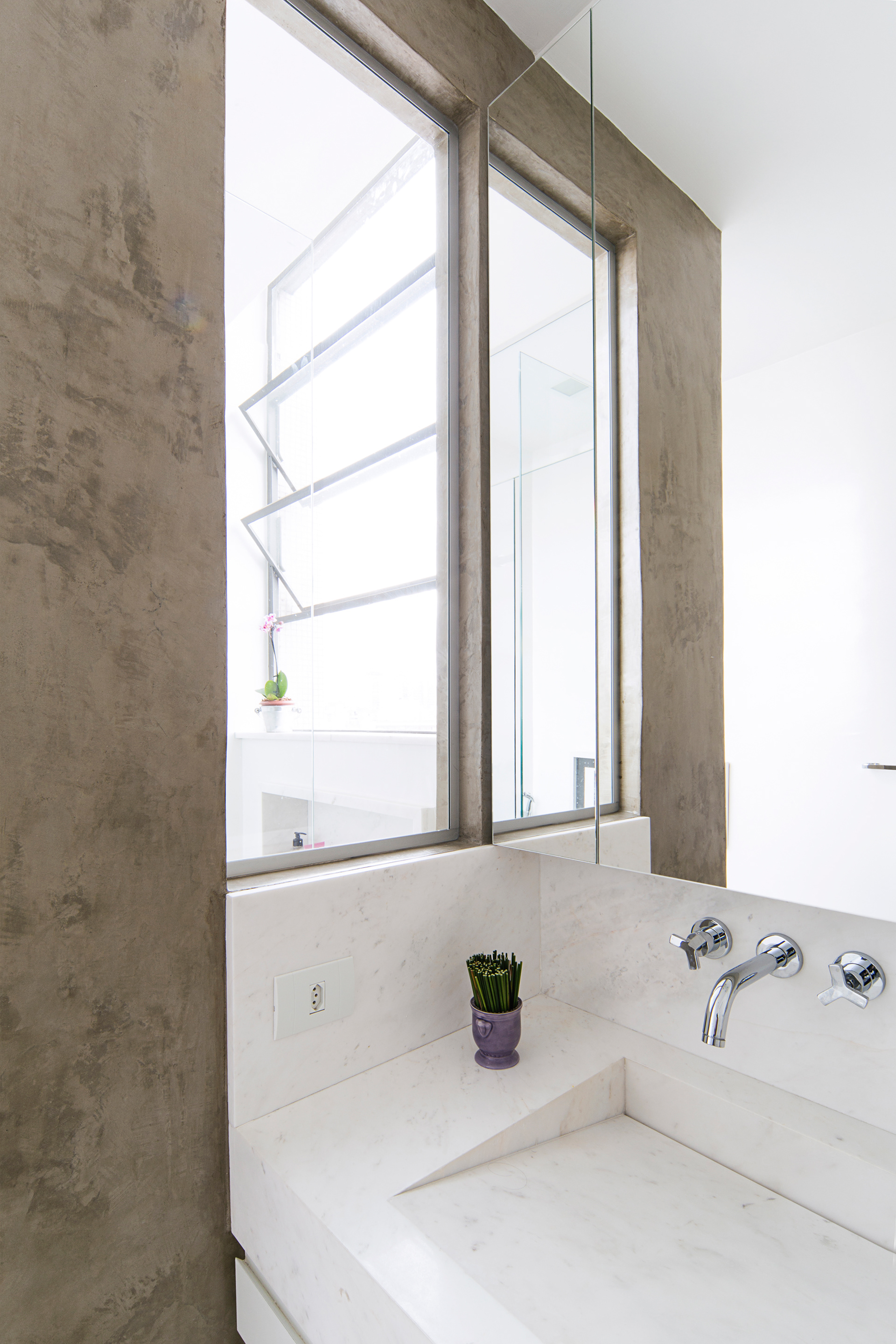 A lavanderia tambem foi integrada para que a grande janela ao fundo pudesse ser vista de qualquer ponto da sala. Assim, de um lado se tem um panorama do centro de São Paulo atraves dos grandes caixilhos da sala, e de outro lado se ve o bairro de Higienópolis, o que traz grande quantidade de luz o dia todo no apartamento, que recebe insolação de Leste e Oeste. Além de excelente ventilação cruzada.