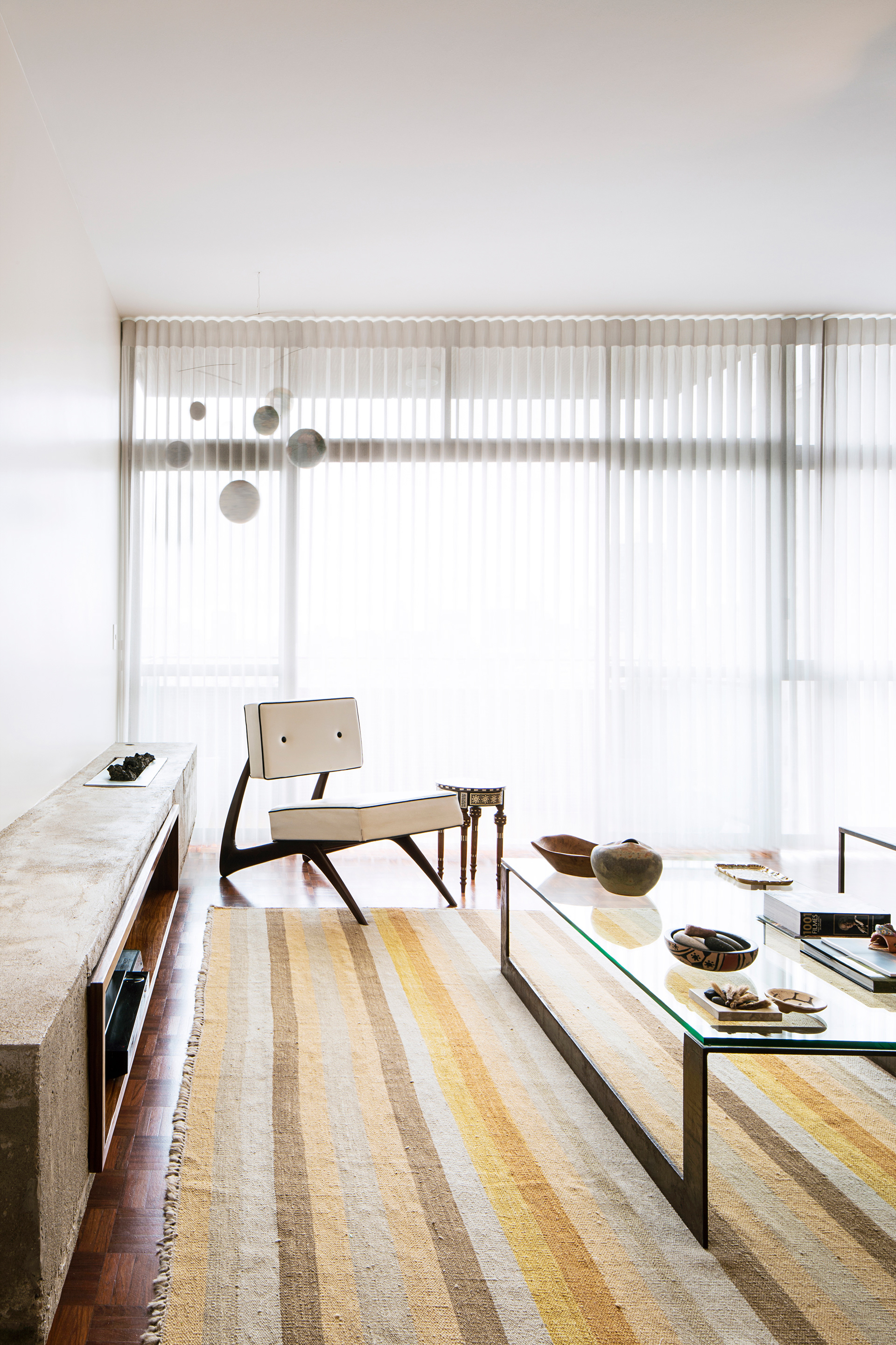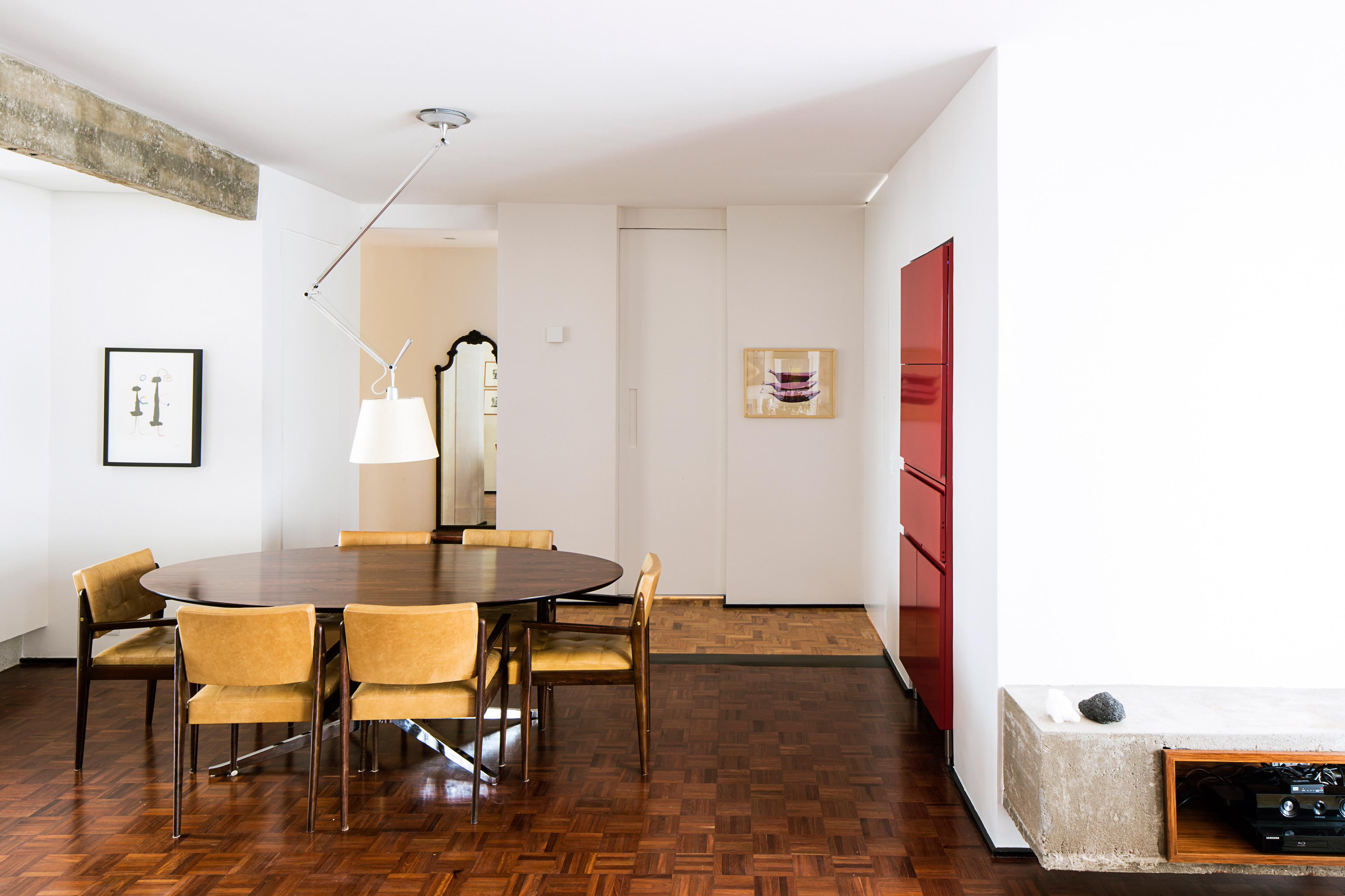Compondo com a viga aparente descascada deixada a mostra na entrada da cozinha, o grande volume horizontal de concreto aparente na sala serve de apoio para os aparelhos e foi moldado in loco. A parede branca acima serve de tela onde projeta-se a imagens substituindo a televisão.