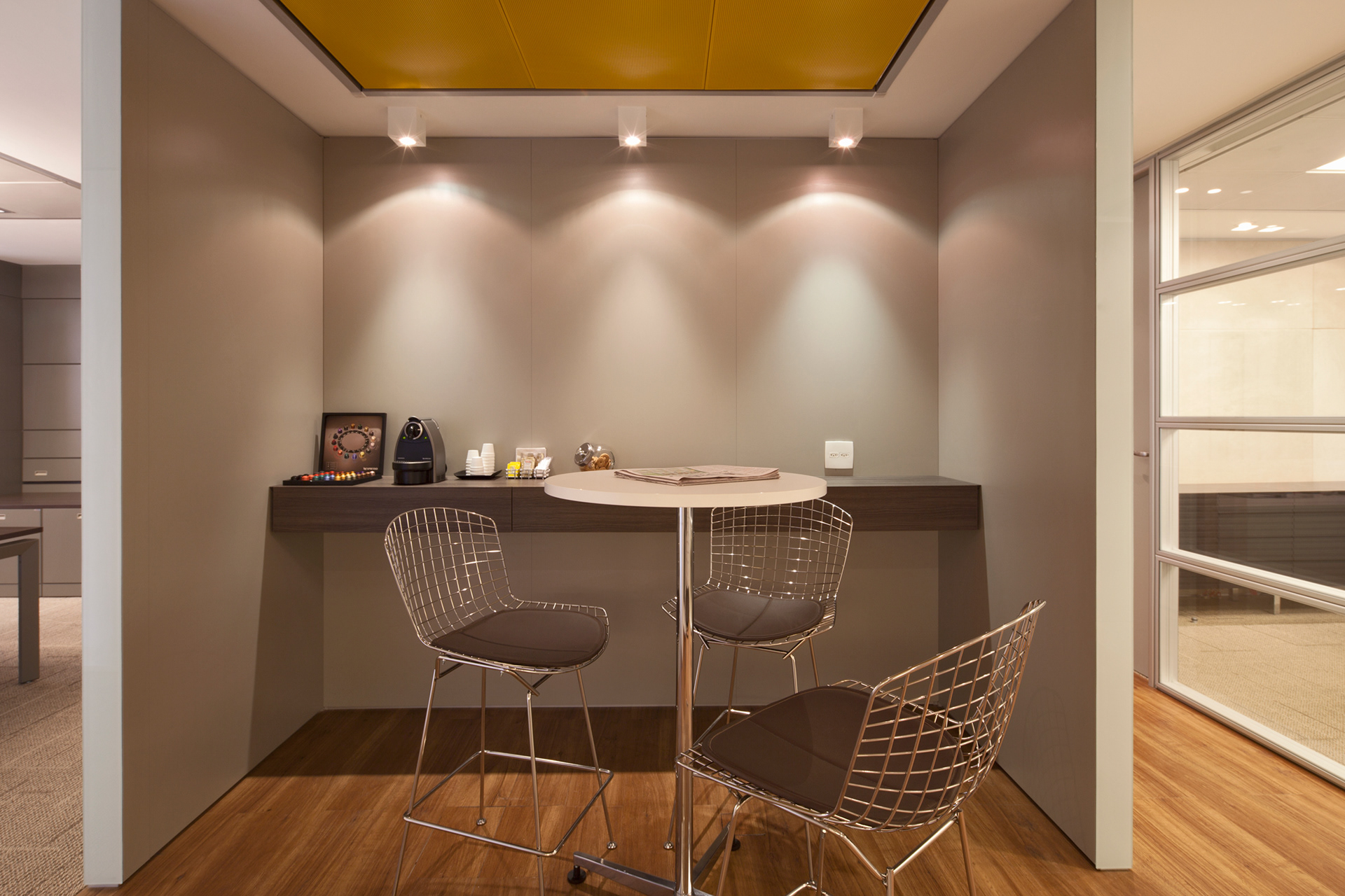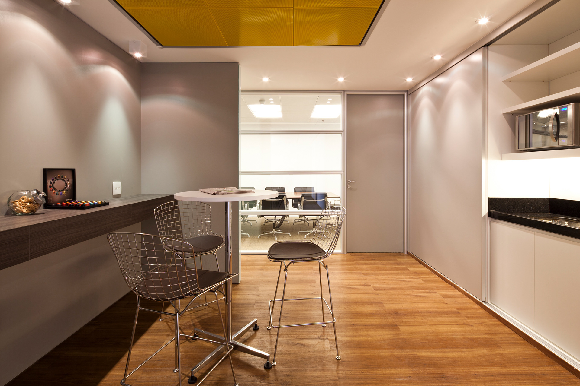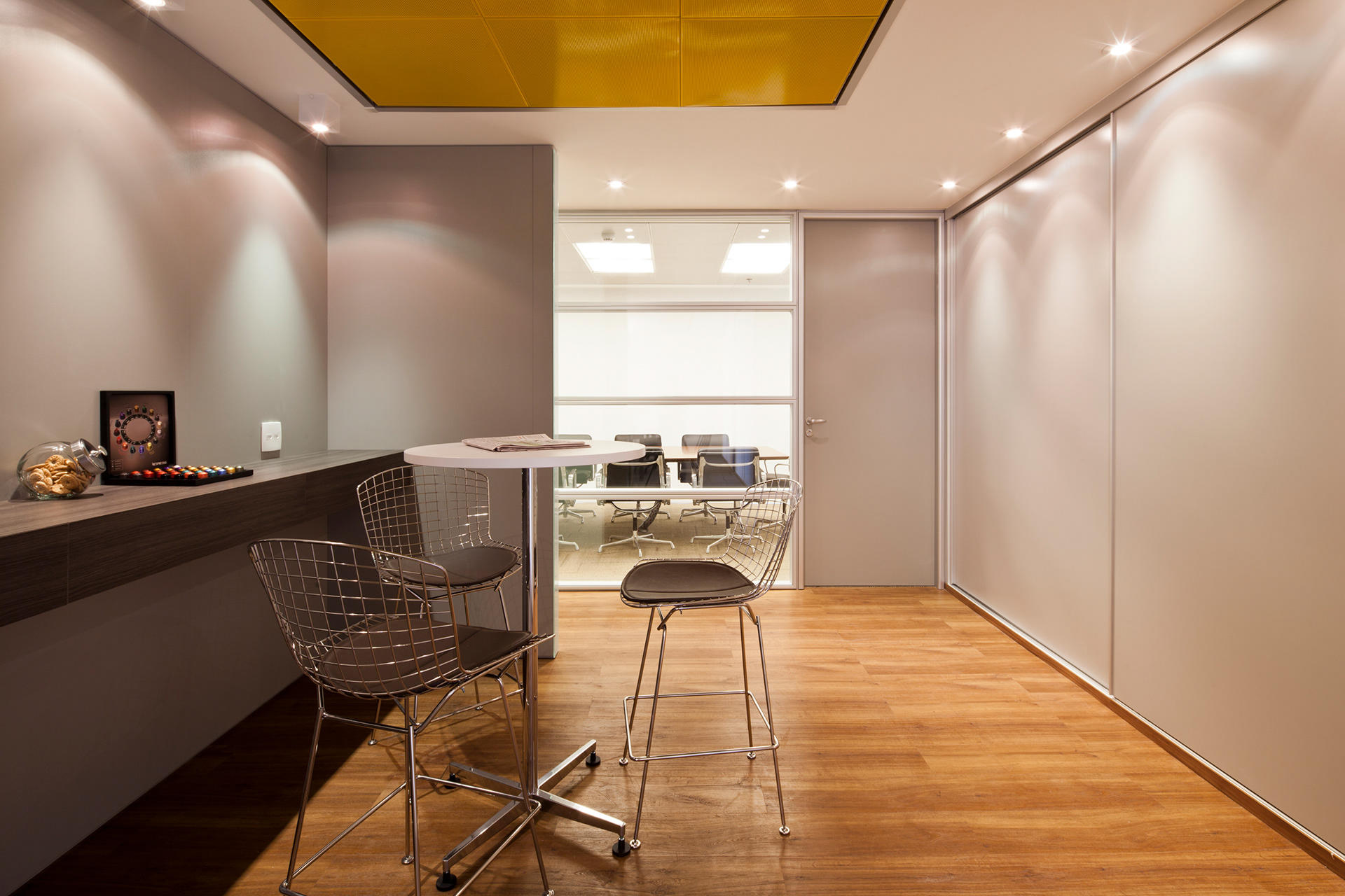 Da recepção é possível observar todos os ambientes do escritório, exceto um, posicionado como elemento surpresa dentro da ‘caixa de vidro’: o Café é descontraído nos acabamentos e mobiliário, com forro metálico amarelo, piso click de madeira e banquetas Bertoia.