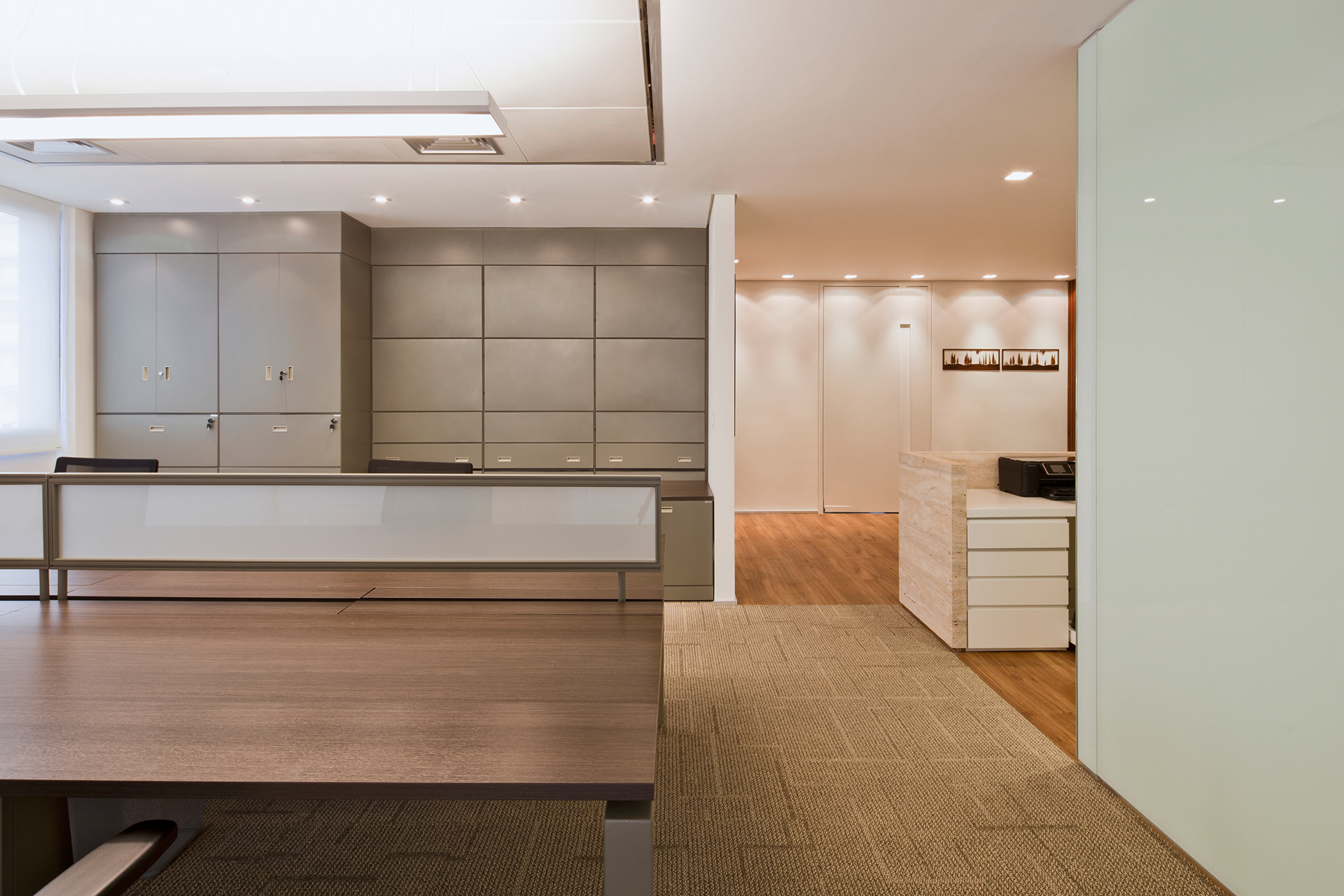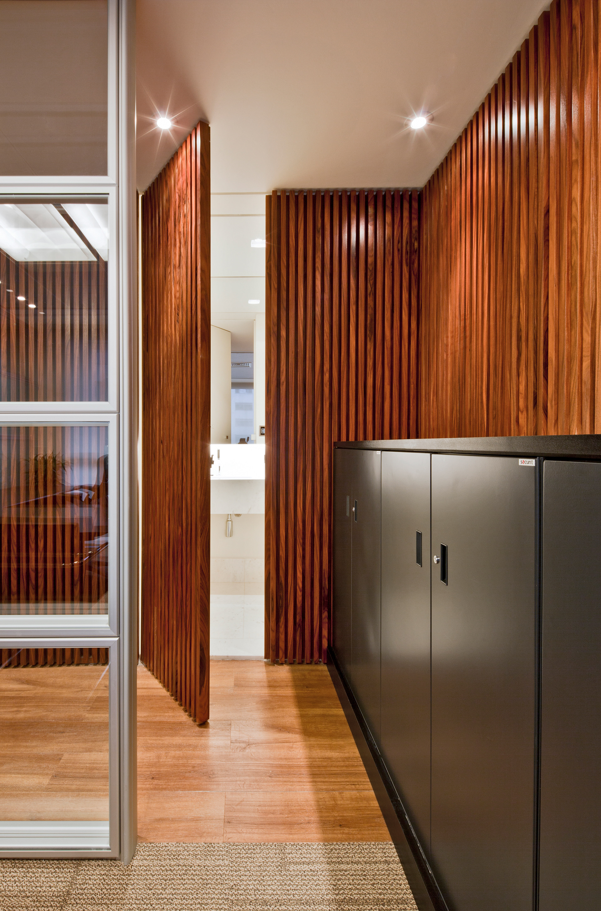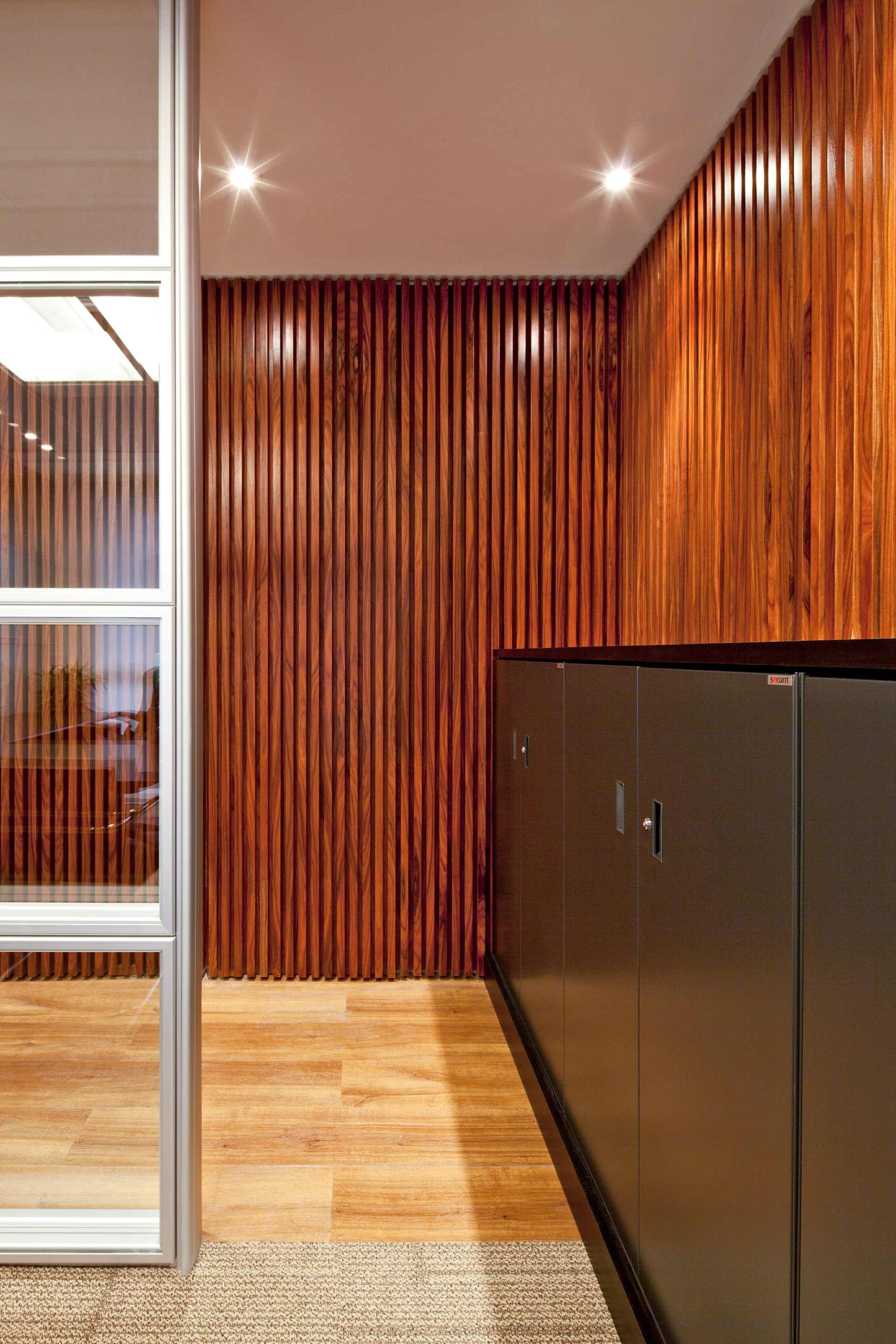 No local mais reservado ficam as duas salas de Diretoria, separadas por uma divisória de vidro e permeadas por um painel de ripas de madeira pau-ferro que esconde as portas do CPD e de um dos banheiros do conjunto.