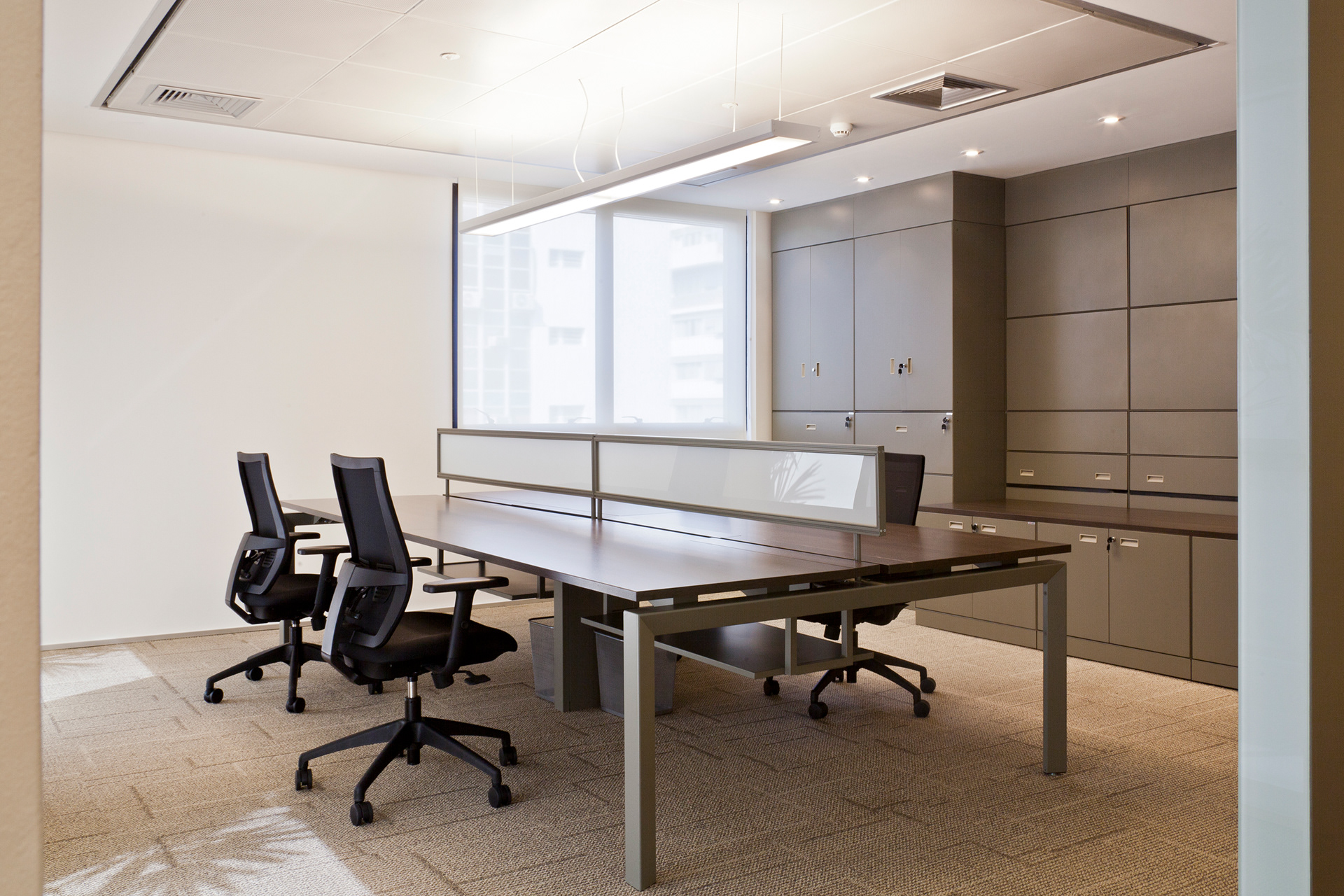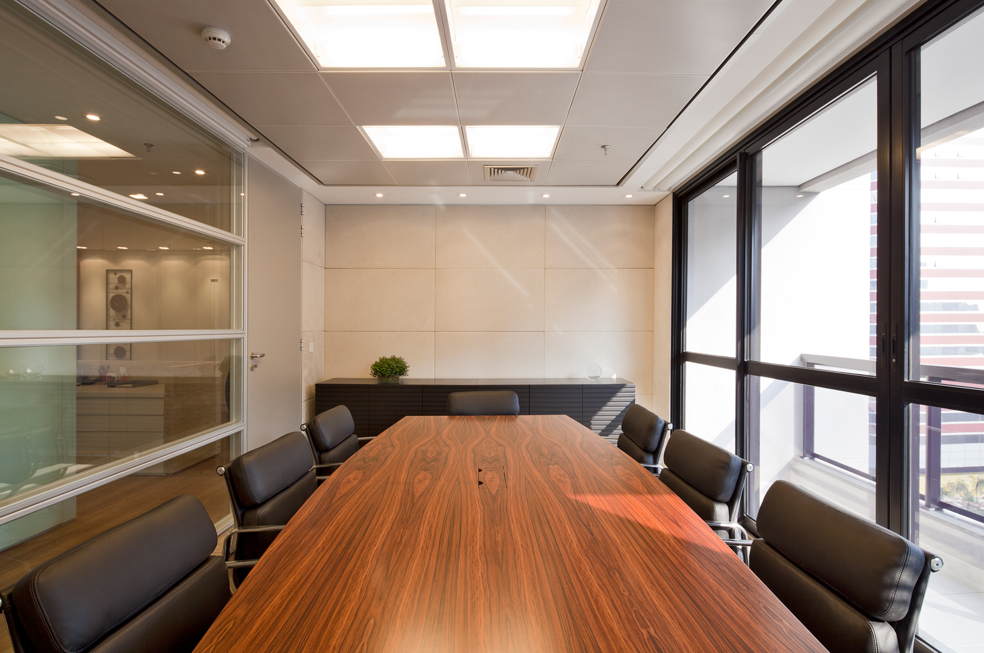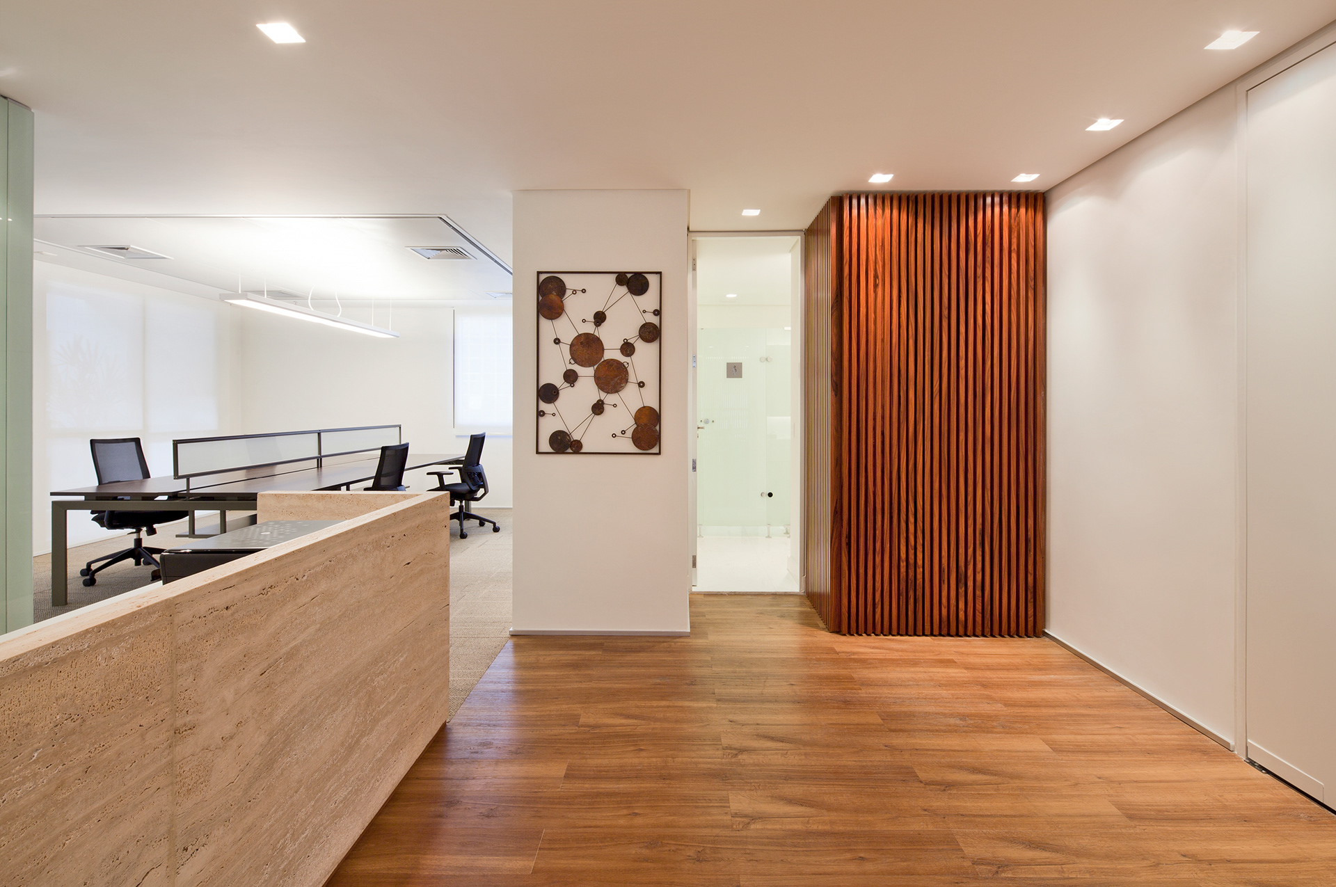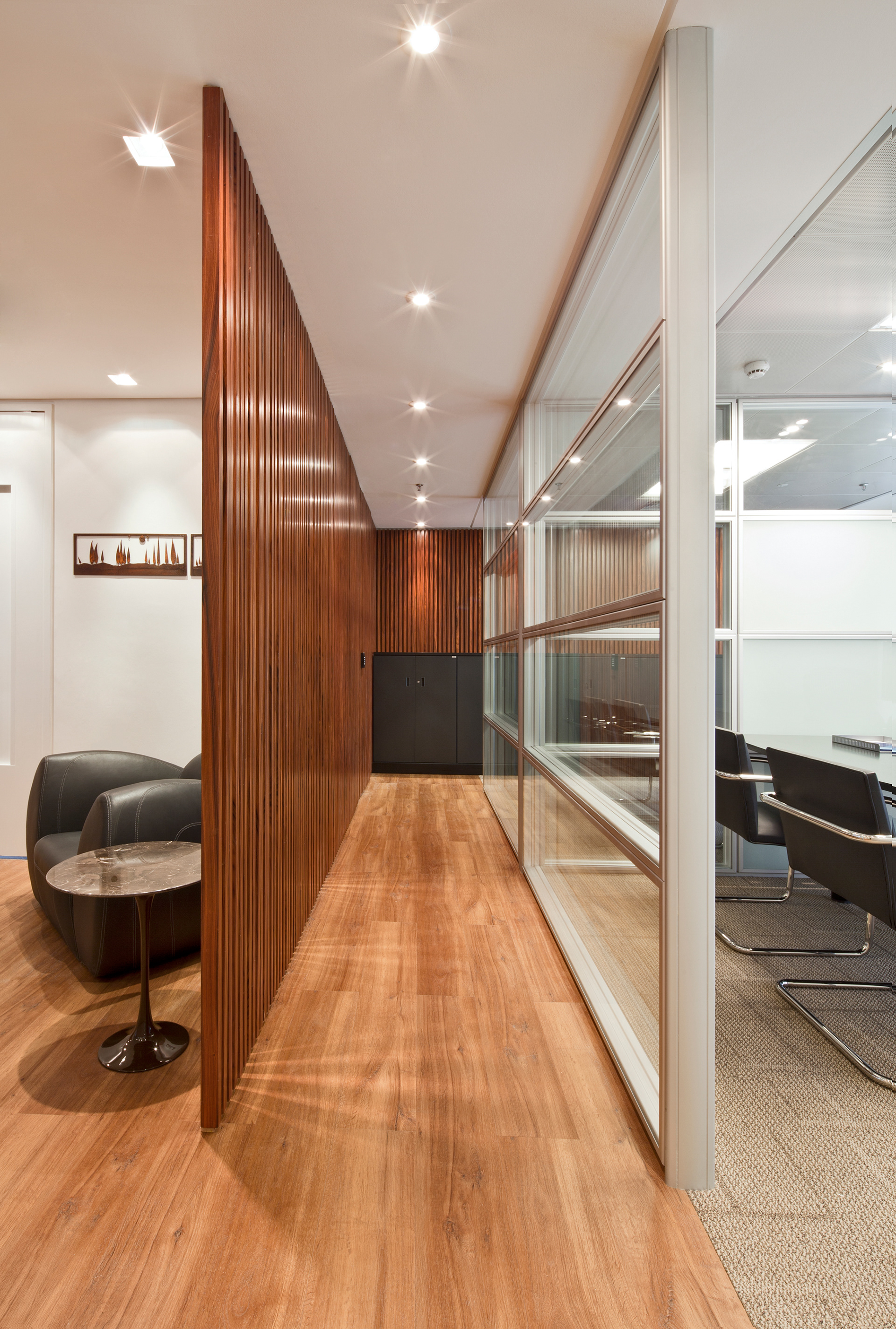 No local mais reservado ficam as duas salas de Diretoria, separadas por uma divisória de vidro e permeadas por um painel de ripas de madeira pau-ferro que esconde as portas do CPD e de um dos banheiros do conjunto.