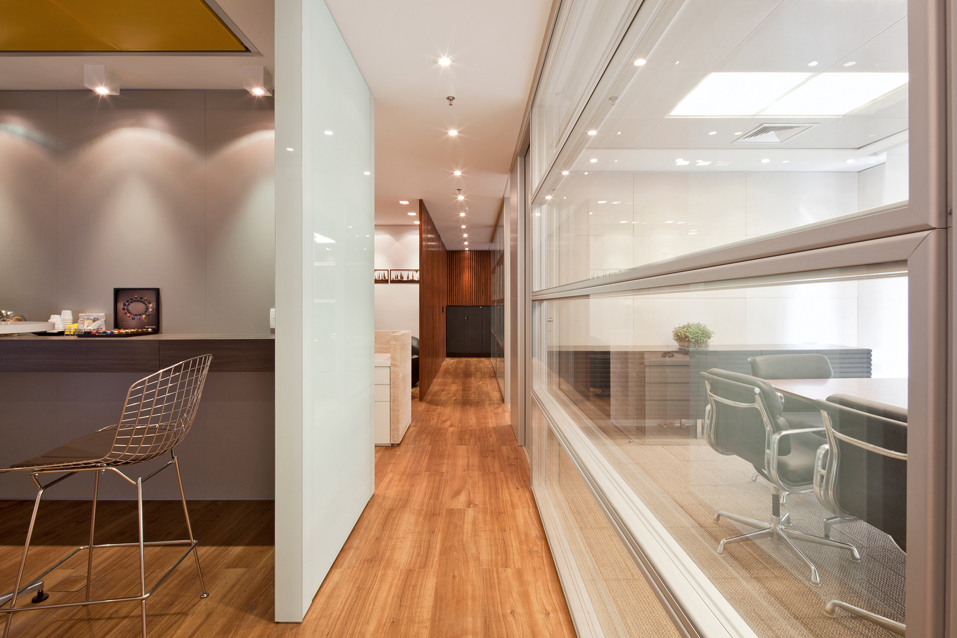 A ideia de um único elemento organizar o fluxo do escritório foi o ponto de partida para que uma ‘caixa’ central de vidro branco definisse a setorização do espaço.