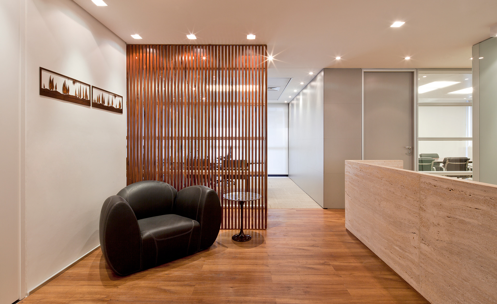 Ao entrar neste escritório de 150 m2, a identidade visual da empresa foi estampada nesta ‘caixa de vidro’ que pode ser avistada atrás de um elegante e minimalista balcão de mármore travertino bruto.