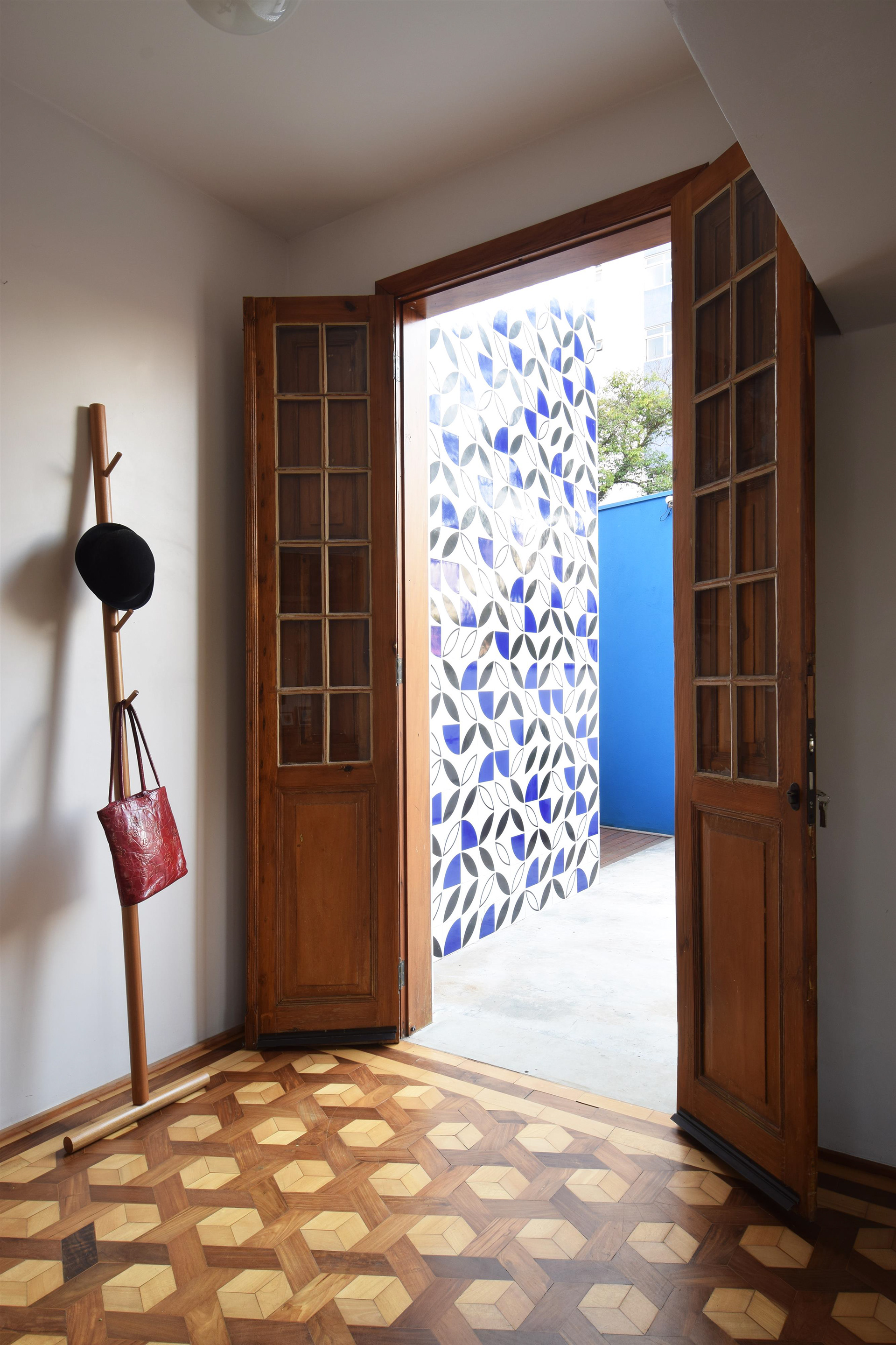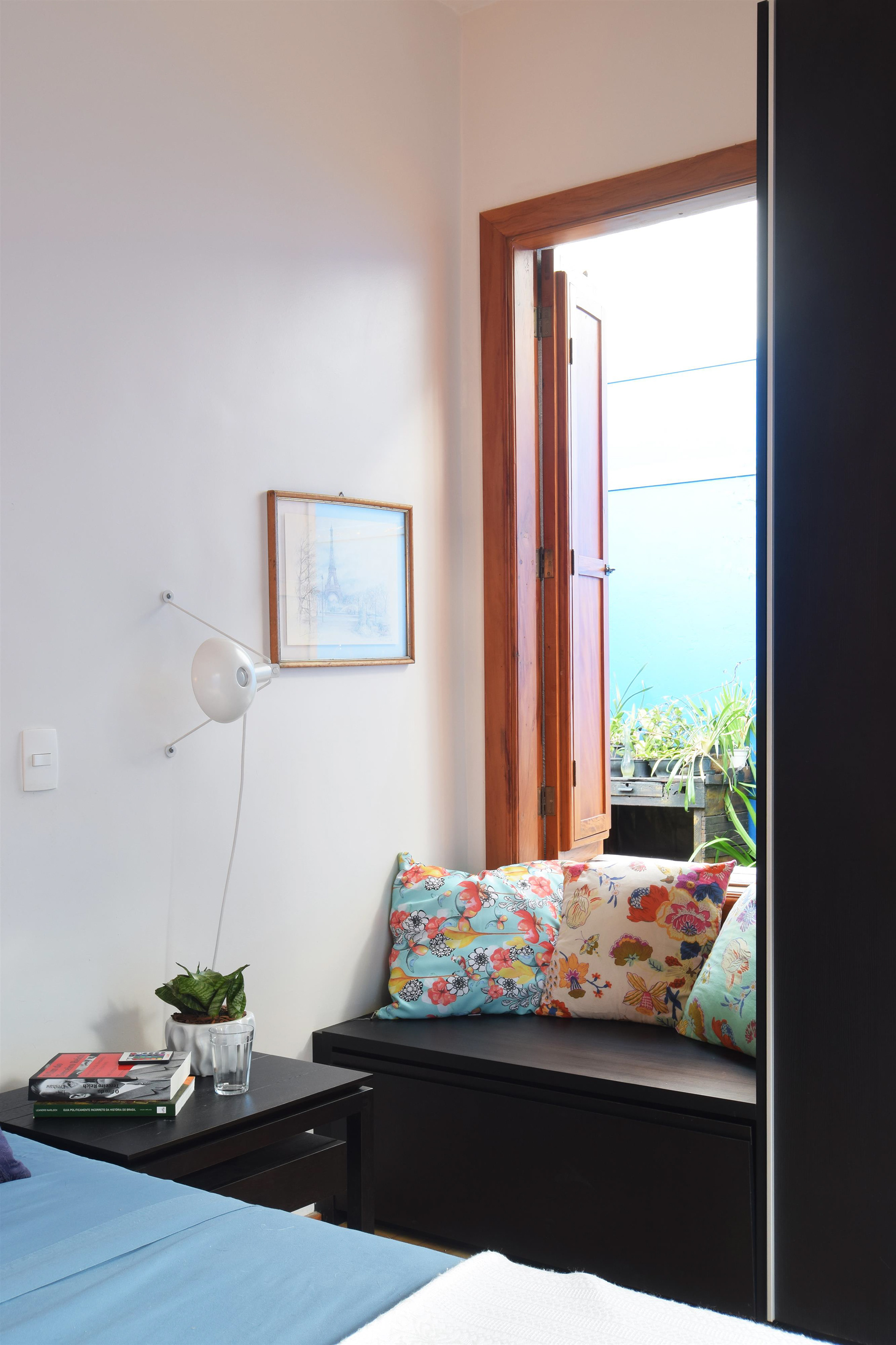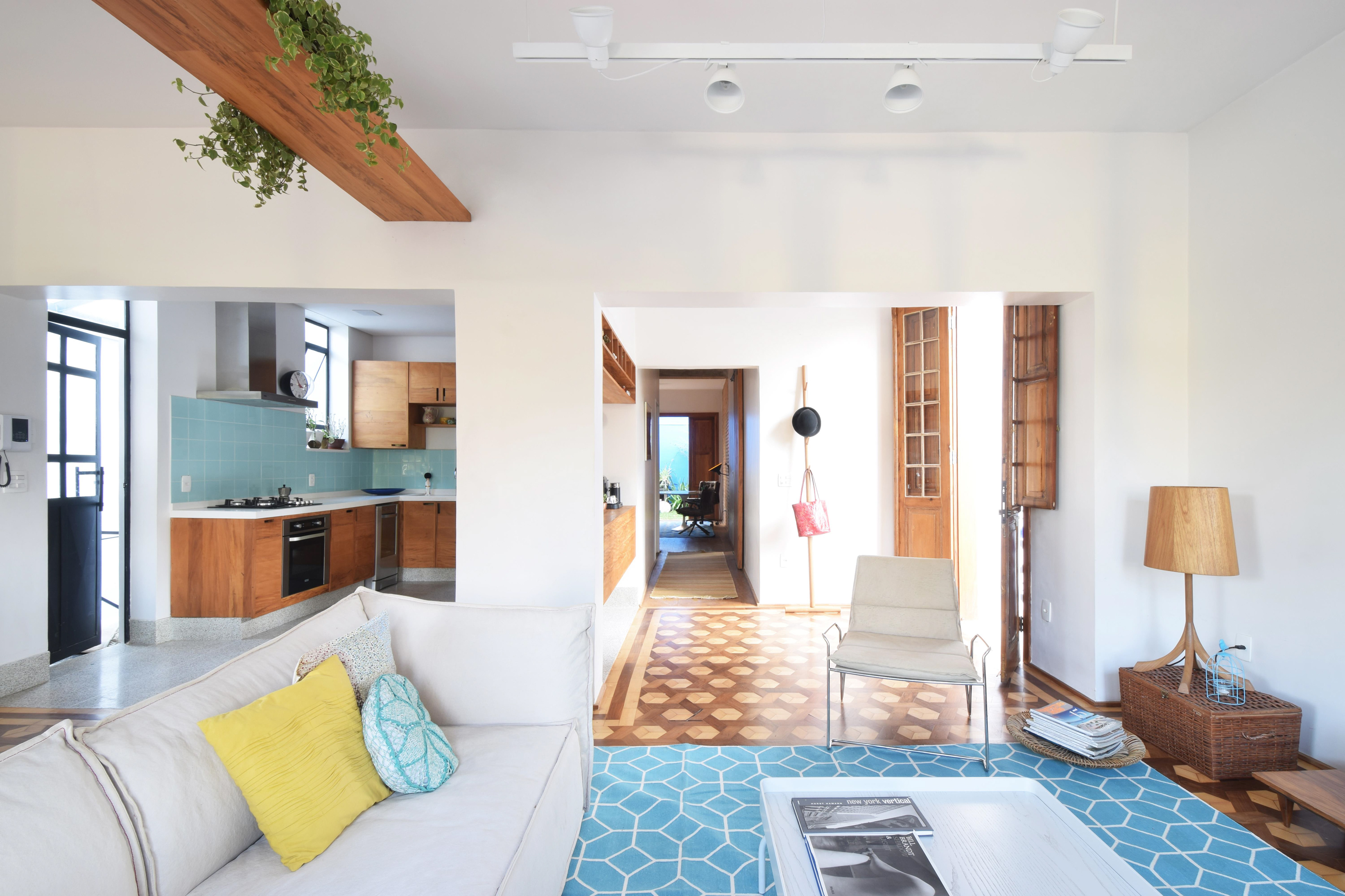 Agora não há mais barreiras e da sala é possível vislumbrar o verde e o profundo azul que reveste o muro. A quarta face foi aberta e o jardim ganhou sua devida importância junto com a ventilação cruzada e a amplitude visual.