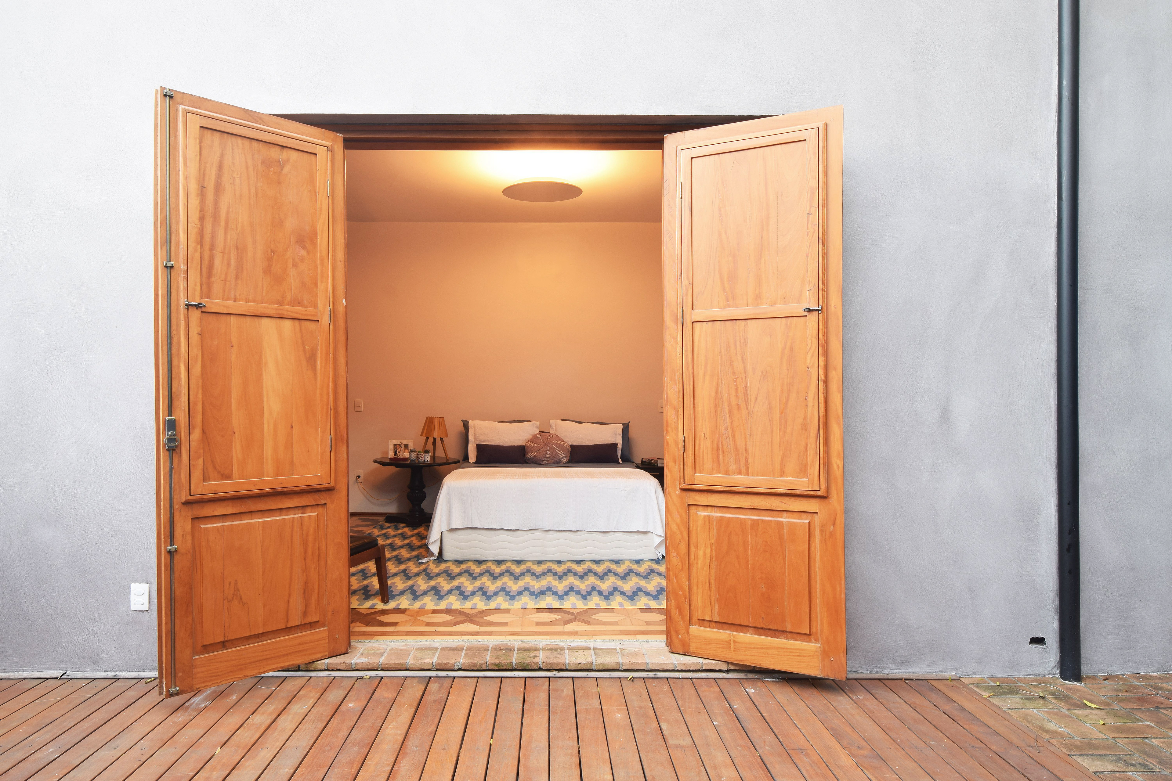 Essas três necessidades foram solucionadas através dos muros de divisa com a rua. Além da segurança foram usados como arrimo para que o jardim fosse nivelado e recebesse um deck contínuo a suíte principal e como apoio de um deck contínuo a sala, o que possibilitou abrir portas e aumentar a incidência de luz natural. Este simples deck se transformou na “sensação” da casa unindo a amplitude conquistada com uma vivência próxima à cidade. A via onde a casa se encontra é acesso ao metrô e bastante movimentada por pedestres, ciclistas e automóveis. Do deck é possível acompanhar o movimento da cidade como nas antigas varandas de casas no Interior do Estado.