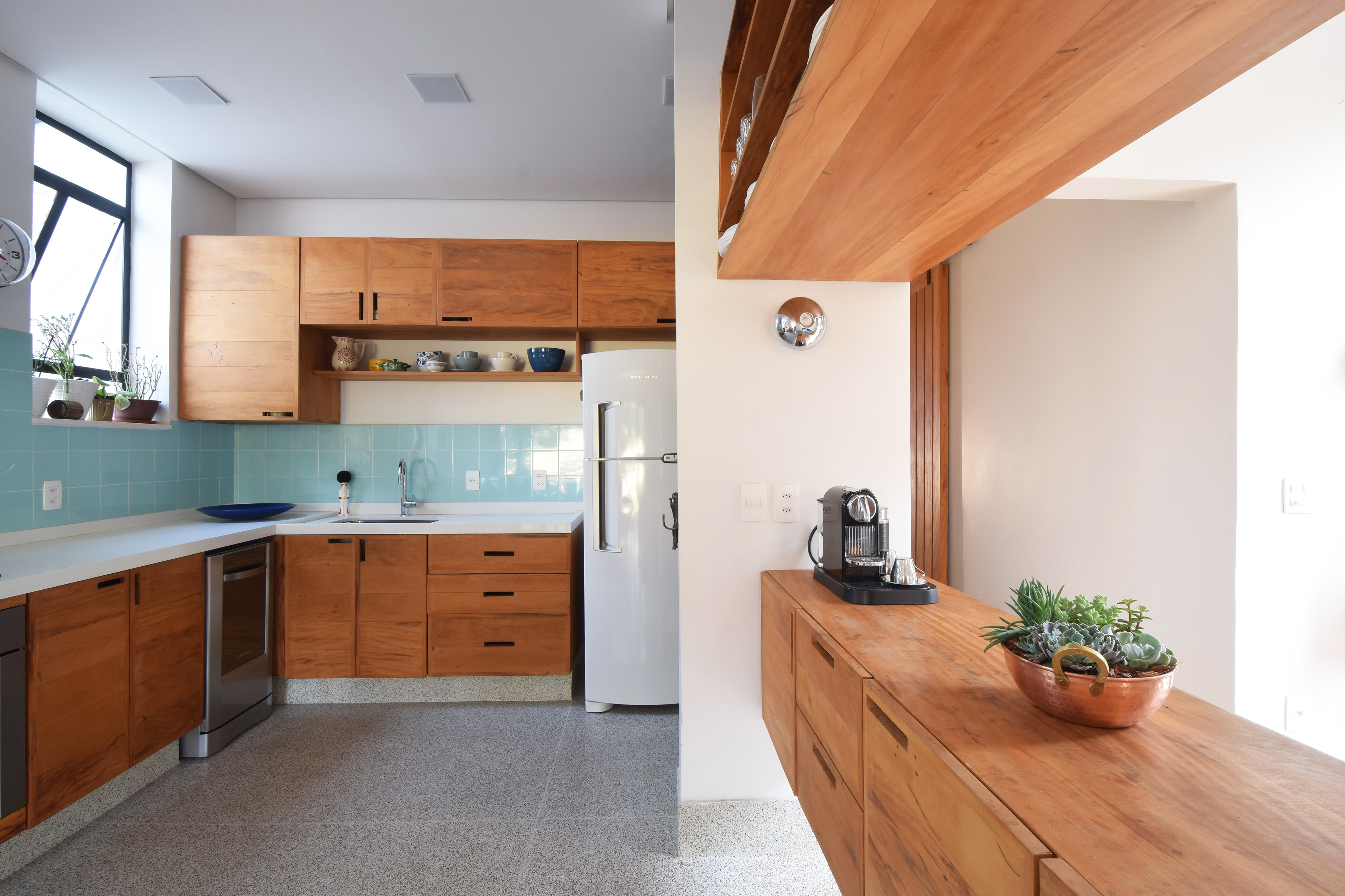 Na extremidade oposta ao deck, cozinha e hall social foram integrados a sala para tornar o interior mais amplo e permeável. Com isso 3 das 4 faces da área social estavam integradas, mas o jardim continuava distante.