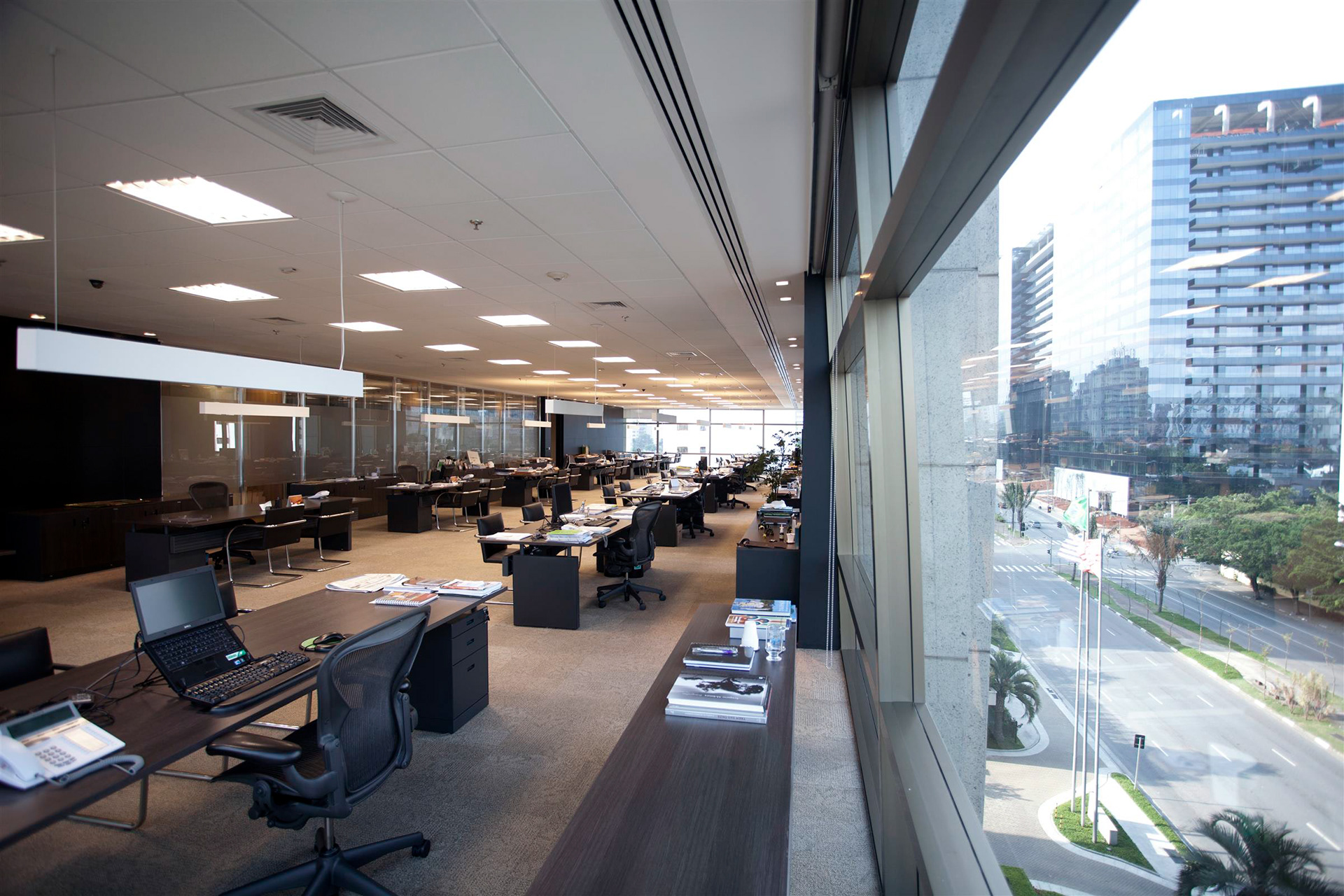 Assim foi configurado este novo escritório, que apesar da grande amplitude dos novos espaços, ganhou área para o Staff devido a otimização conseguida ao desmontar as antigas salas de Diretoria que consumiam muito espaço com circulação.