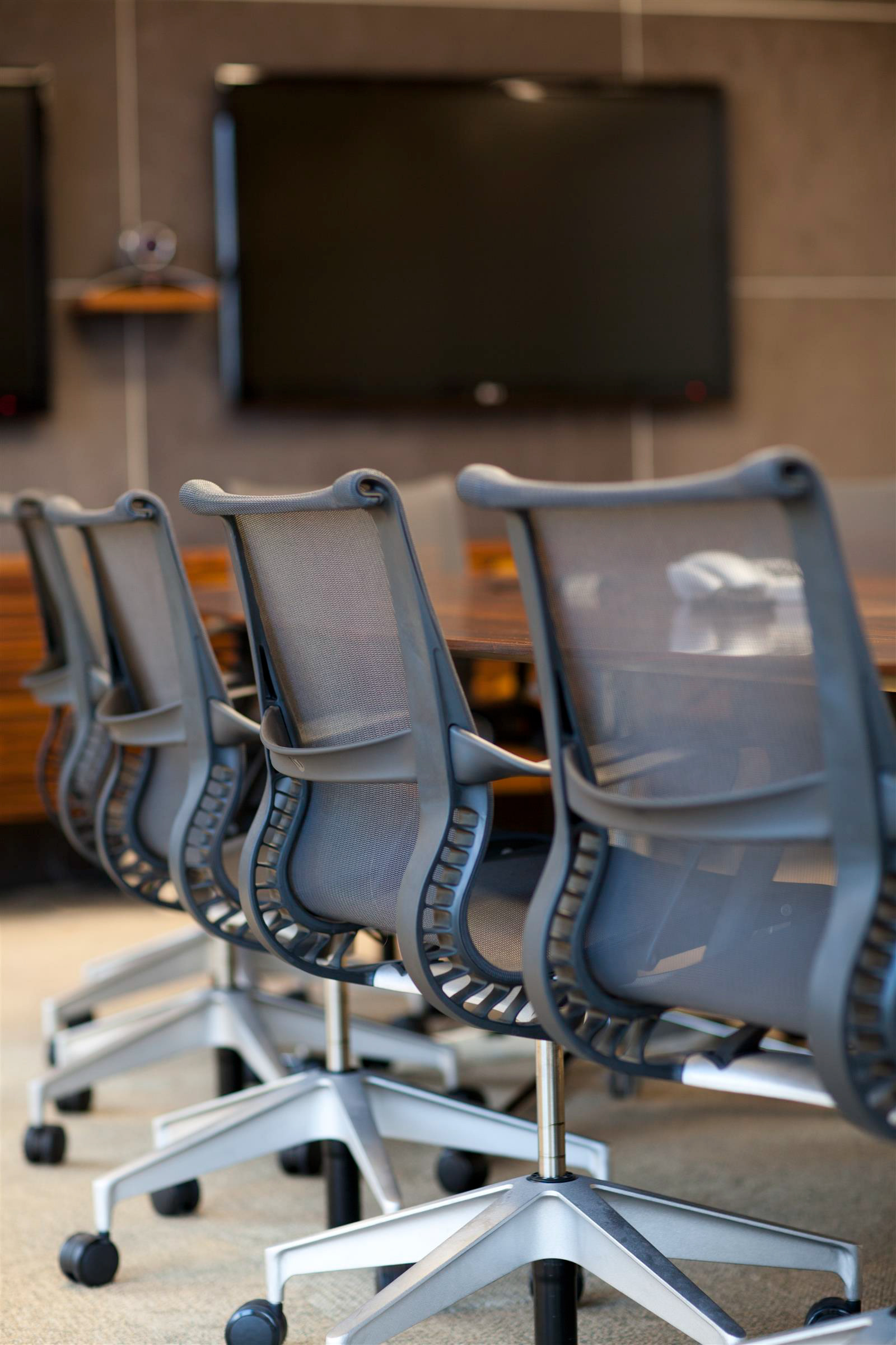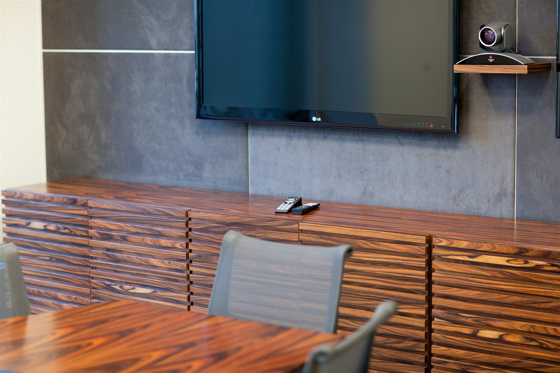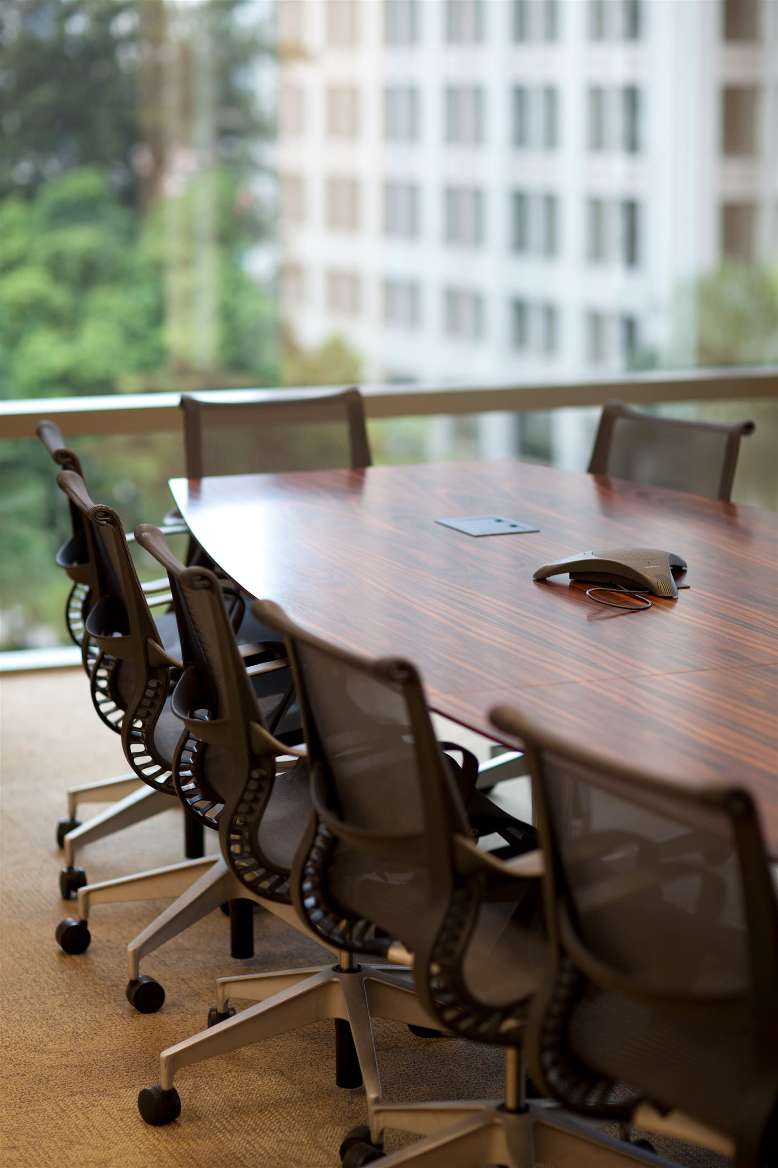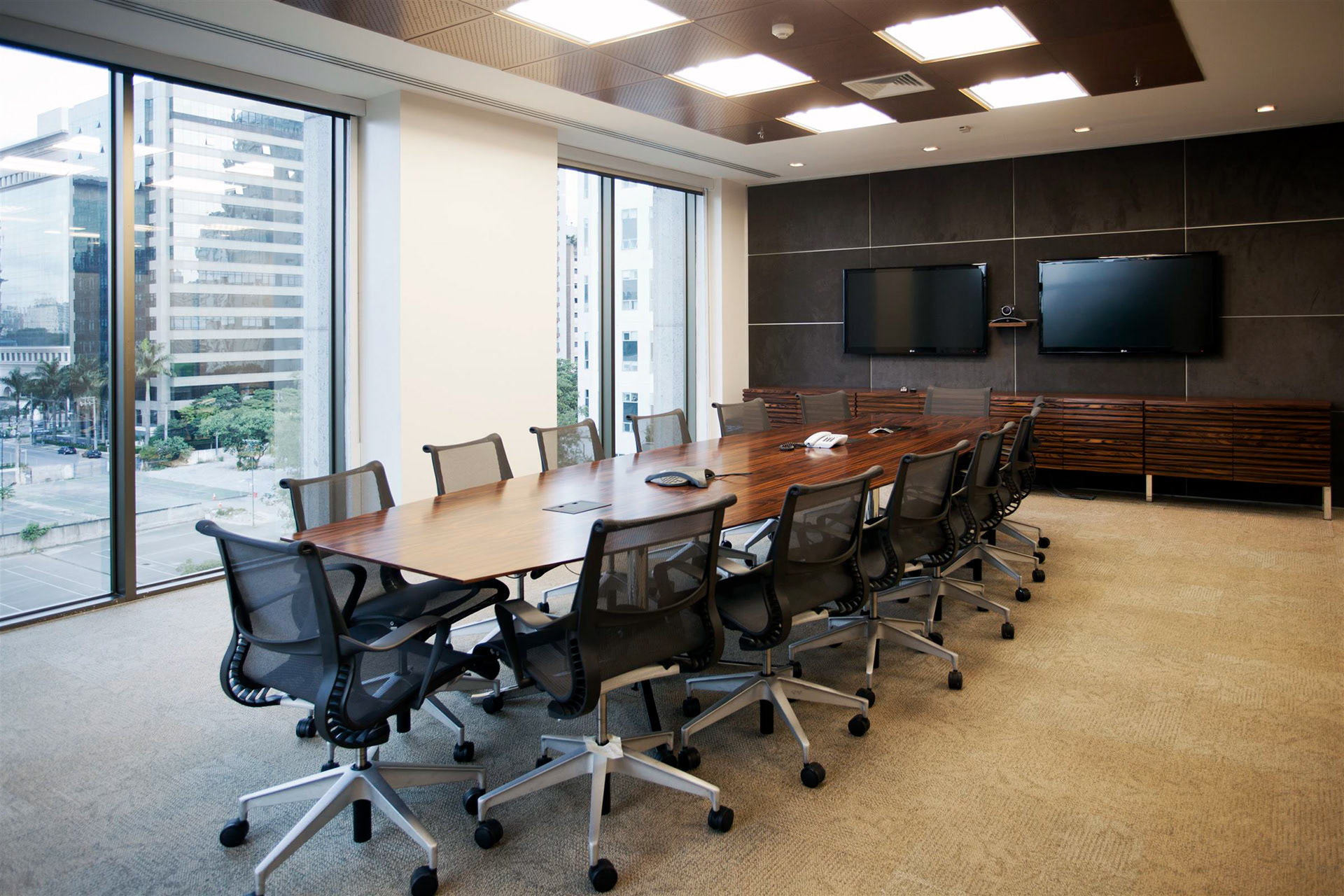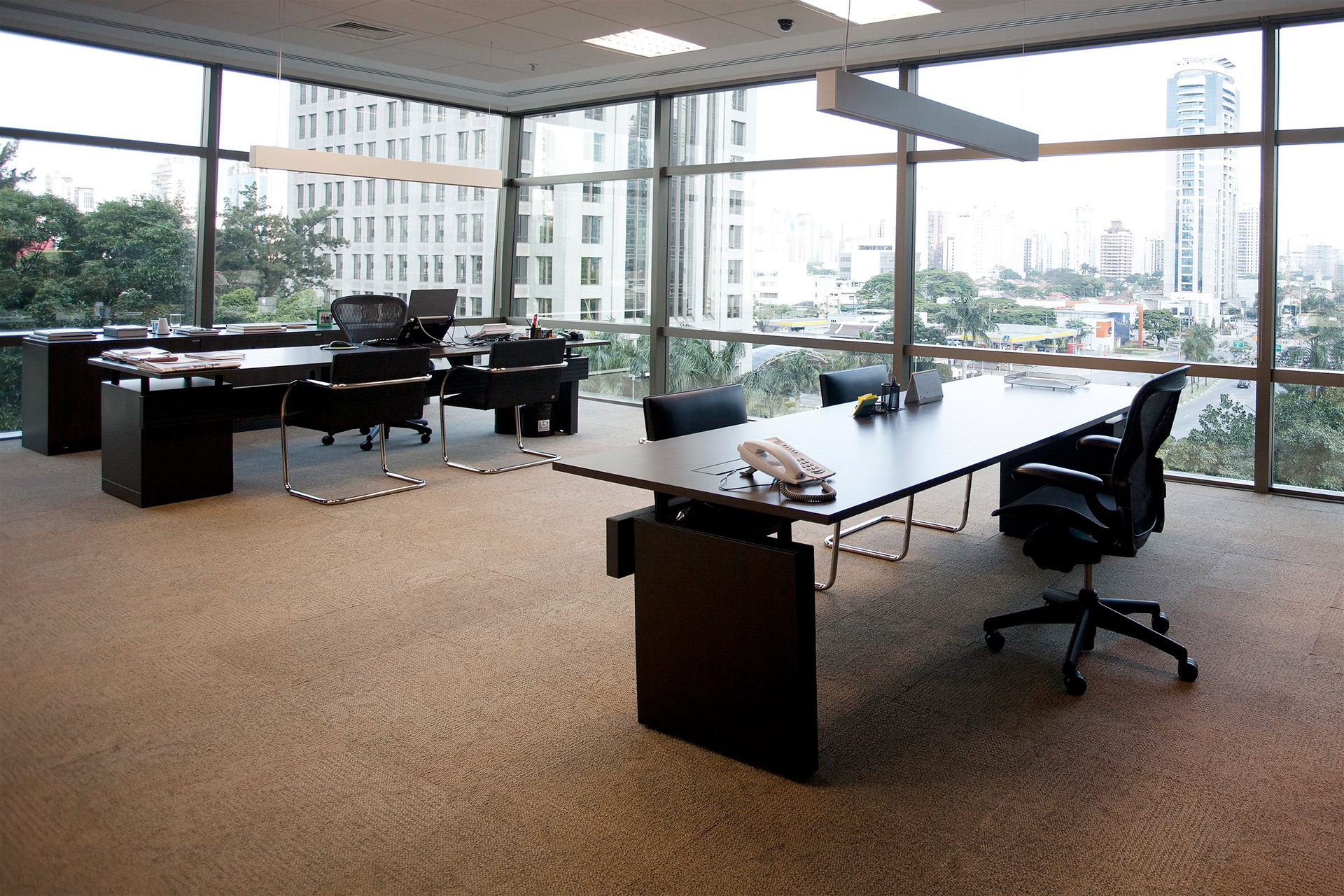 A Sala de Reuniões ganhou tratamento acustico de painéis de tecido Ultra Suede e teve suas divisórias aproveitadas da desmontagem das antigas salas de diretoria, assim como todo fechamento de divisa com a circulação do andar. Uma mesa de 4,30 metros com desenho de tampo de madeira pau-ferro exclusivo para o local apoiado sobre pés modelo Florence Knoll, parece flutuar no ambiente dada a delicadeza de sua extremidade. Um buffet de apoio para servir café e uma credenza de vídeo conferencia completam o ambiente que tem agradavel vista para o Itaim.