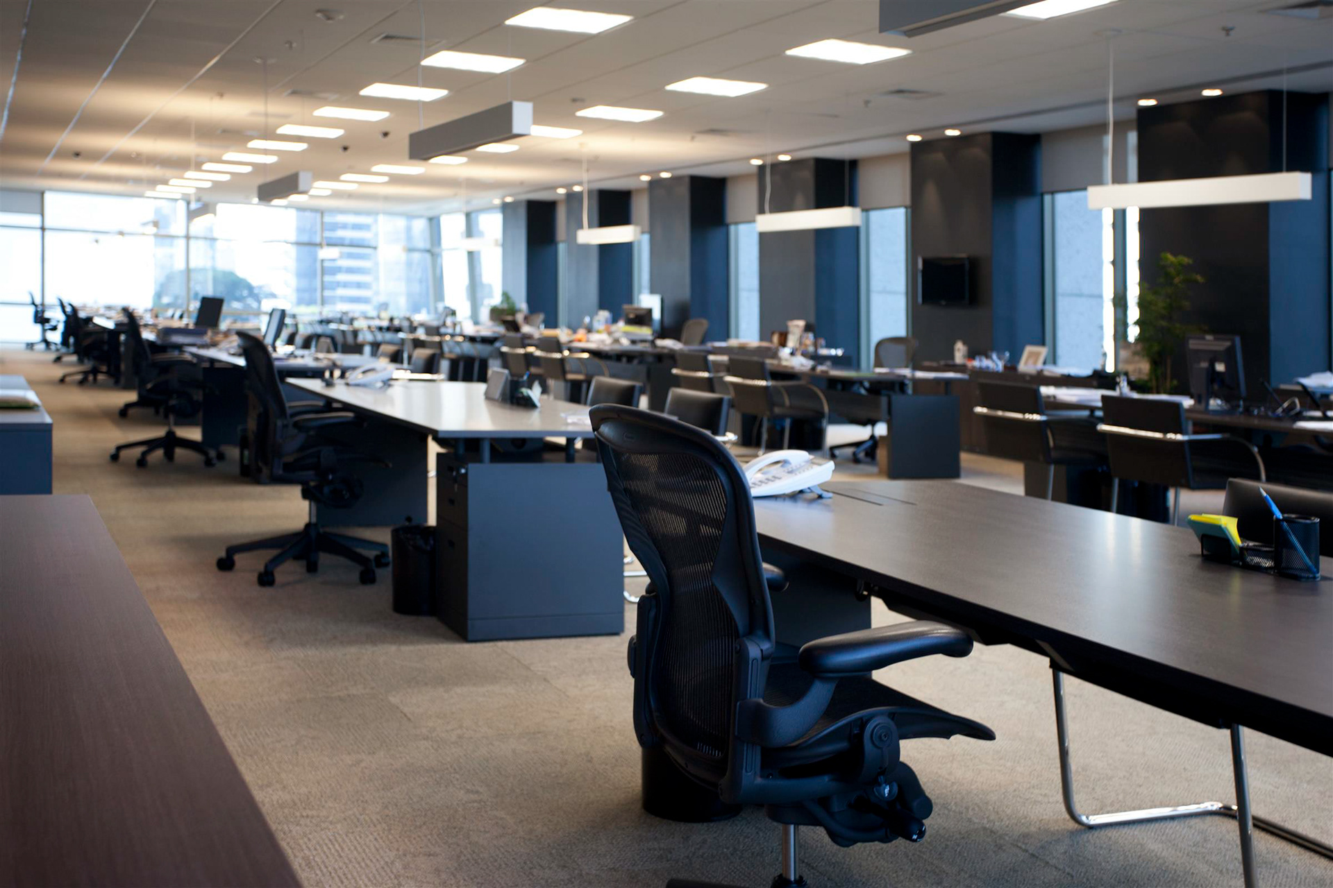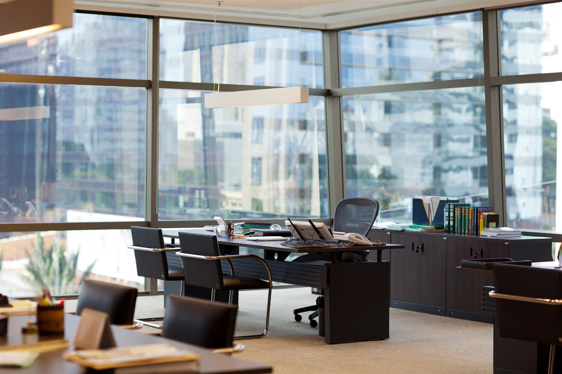 Dentro da Klabin um novo conceito de integração física entre diretores fez com que o layout original, com diversas salas individuais fechadas, tivesse que ser remodelado em uma das áreas mais importantes do escritório. Um ambiente totalmente aberto e integrado foi projetado para locar 14 estações de trabalho com amplo espaço de mesa e circulção, distribuidas em uma planta retangular e tratado com materiais sóbrios e minimalistas como o painel metálico preto munido de porta de correr automatizada que divide a sala dos diretores com o ambinete das sercretarias e sala de reunioes, exclusiva para este setor. Luminárias pendentes sobre cada uma das mesas iluminam tanto a mesa quanto o teto, o que proporciona conforto e define o uso do espaço, tratado como uma grande alameda com generosas mesas rodeado pela melhor vista do edifício.