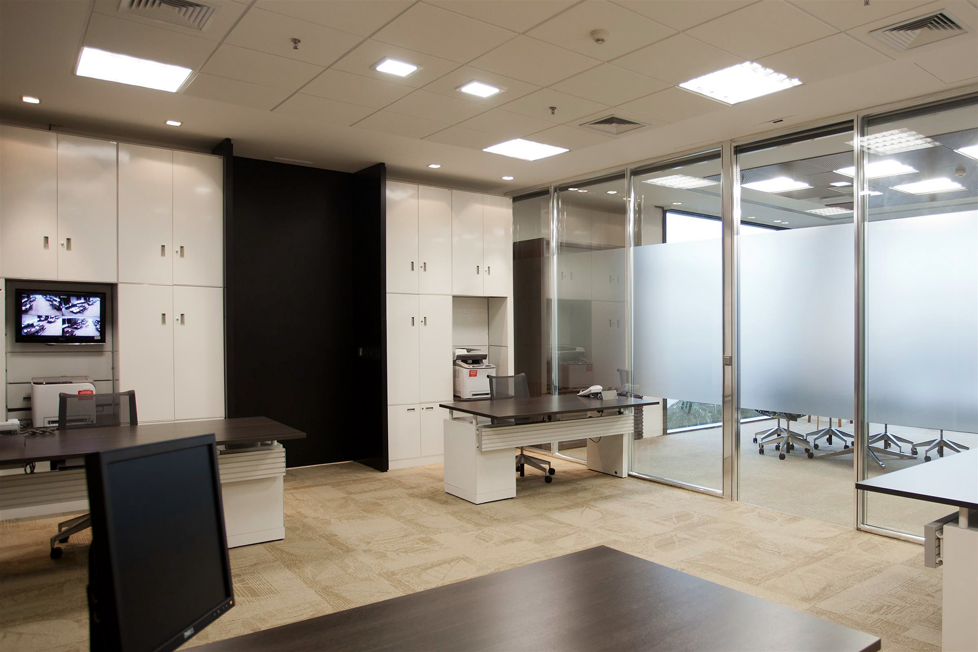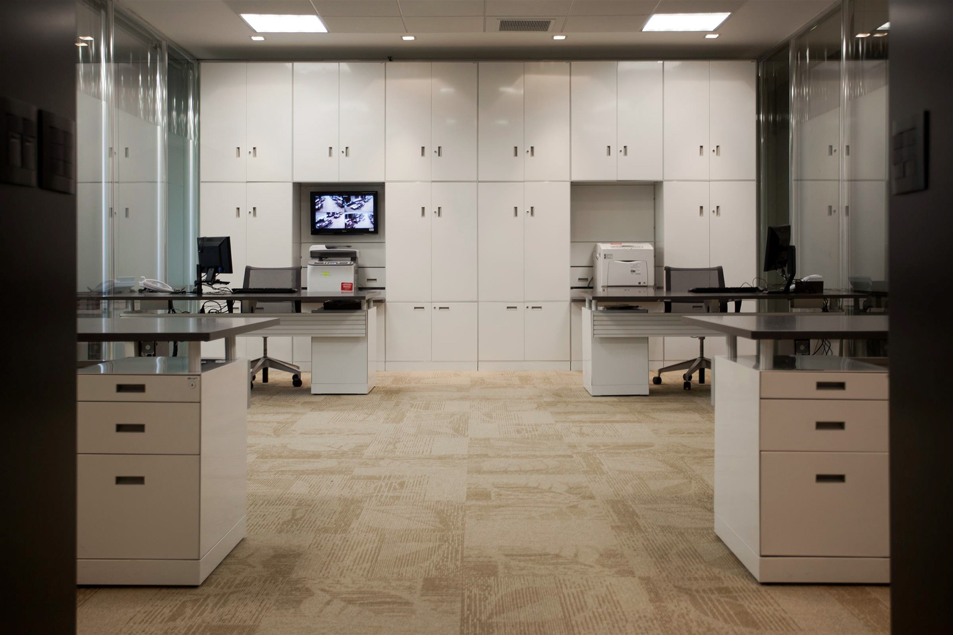 As Secretárias fazem a recepção para Diretoria e Reuniões, conferindo mais privacidade. Enquanto as estações de diretoria receberam tratamento mais sóbrio com estrutura em cinza escuro, as estações de trabalho das secretárias e todo seu apoio composto por duas paredes de armários casewall receberam pintura branca sobre as portas e estruturas de aço.