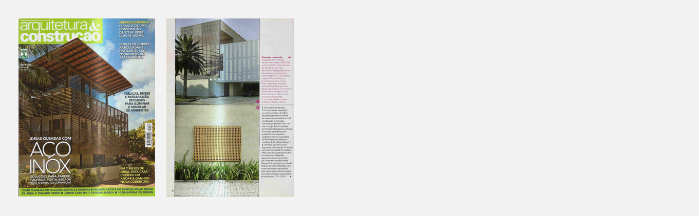 "(...) Também tem identidade forte uma residência de 460m que desenharam para um casal de músicos roqueiros – colecionadores de toy art – em Santa Isabel (interior de São Paulo). Da rua, o que se vê é apenas um hall com, garagem na ponta superior da casa, que tem mais dois níveis ocultados pelo declive."