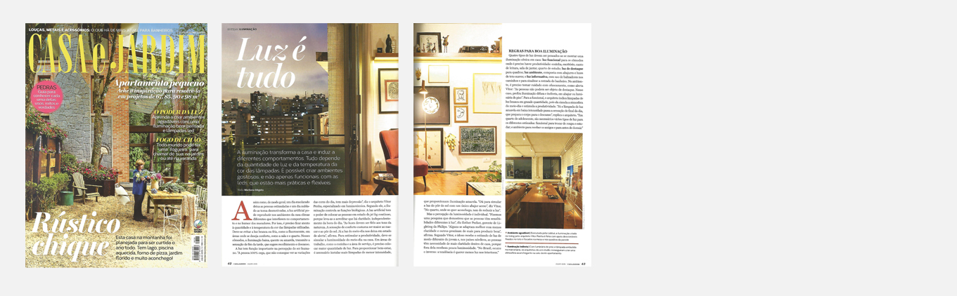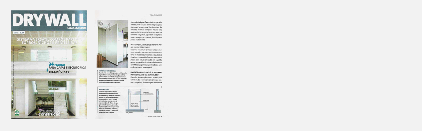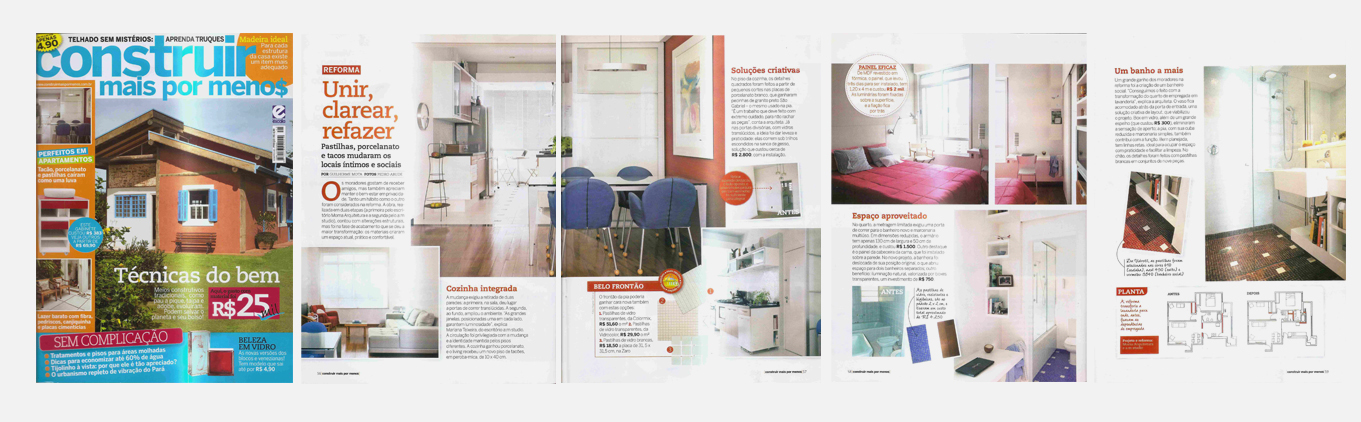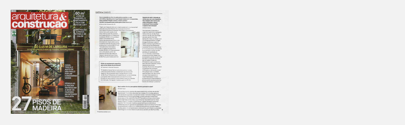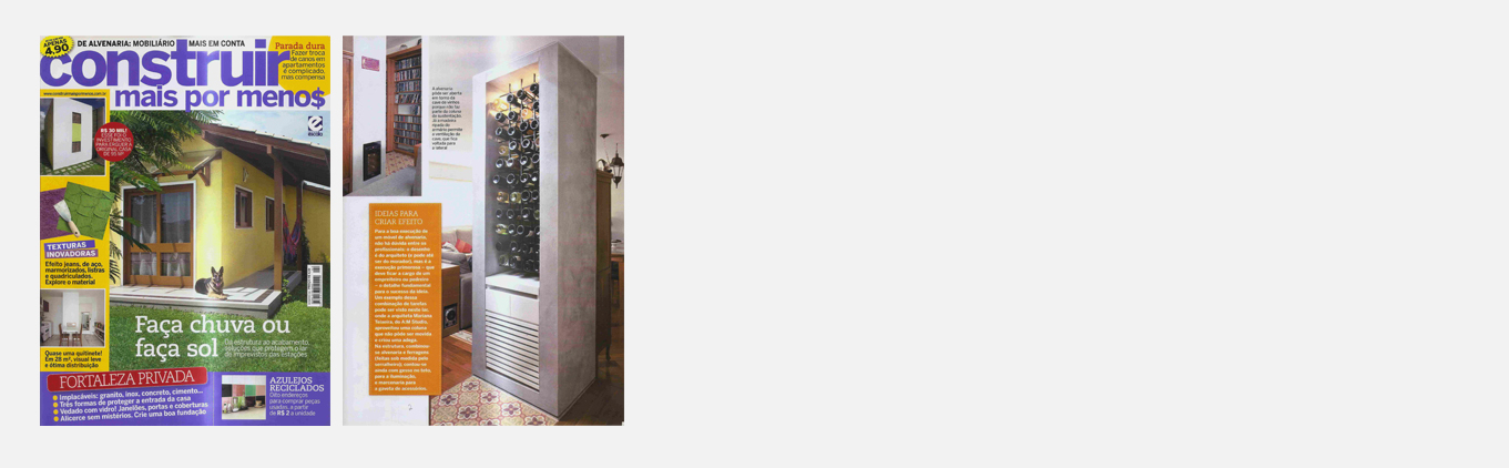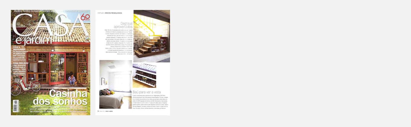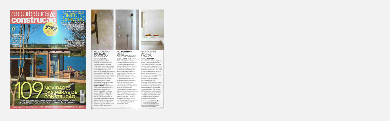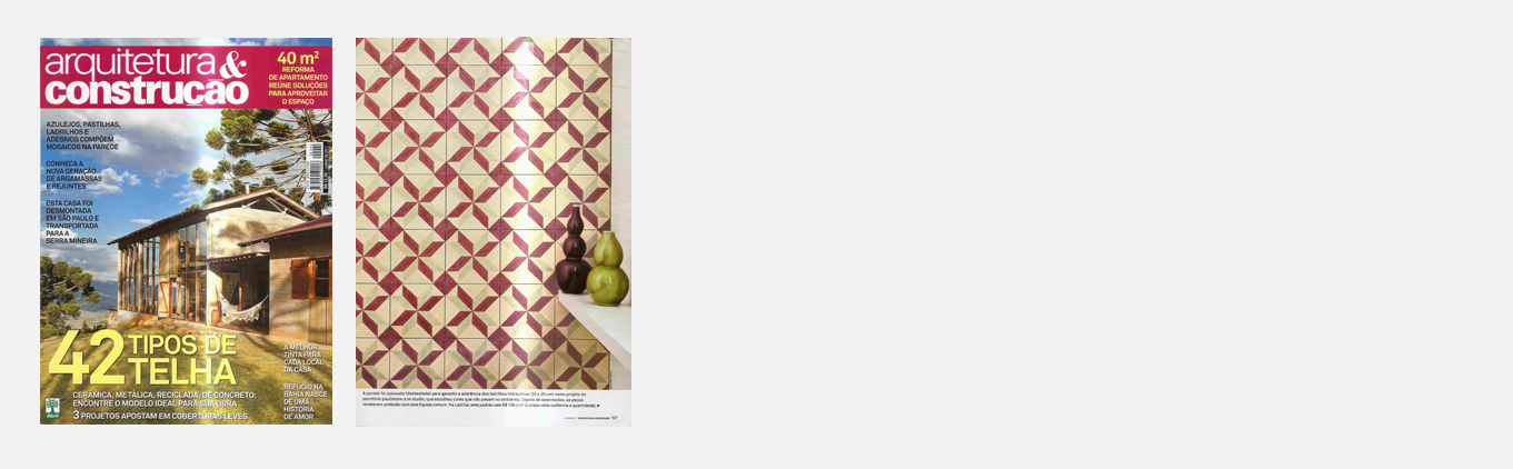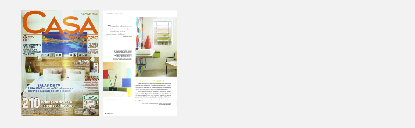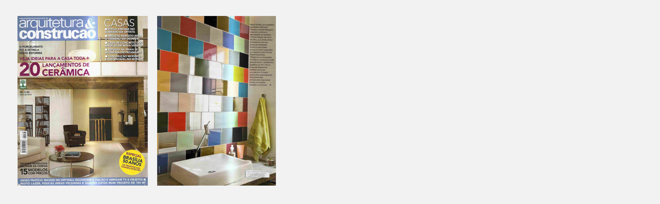 "Mostrado na matéria Ceramicas e Porcelanato para casa toda, página 87, o lavabo dos arquitetos paulistanos Mariana Teixeira e André Weigand, foi selecionado entre os mais de 18 mil projetos postatdos no CasaPRO - onde os profissionais mantëm um perfil. O site é uma ferramenta de comunicação para arquitetos, engenheiros, decoradores e estudantes dessas áreas."(...)"A Indústria cerâmica não para. Quando você acredita que já viu quase tudo, o material surge cheio de invenções" (...) "Neste lavabo, os arquitetos paulistanos Mariana Teixeira e André Weigand reuniram cerâmicas garimpadas na Azulejos e Pisos Antigos Venones da Silva, que ainda pintou exemplares brancos. Antes da instalação (Cota Construções), as peças foram separadas por tamanho para formar faixas horizontais." (...) "Testamos a composição no chão e numeramos cada uma no verso", diz Mariana. (...) "Espelhos de 15 x 15 cm (Casa do Vidraceiro) também entraram no conjunto. A dupla optou pelo assentamento desencontrado, porque seria impossível alinhar os azulejos também na vertical".