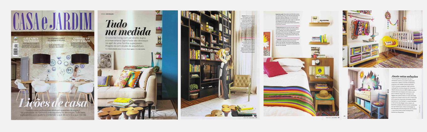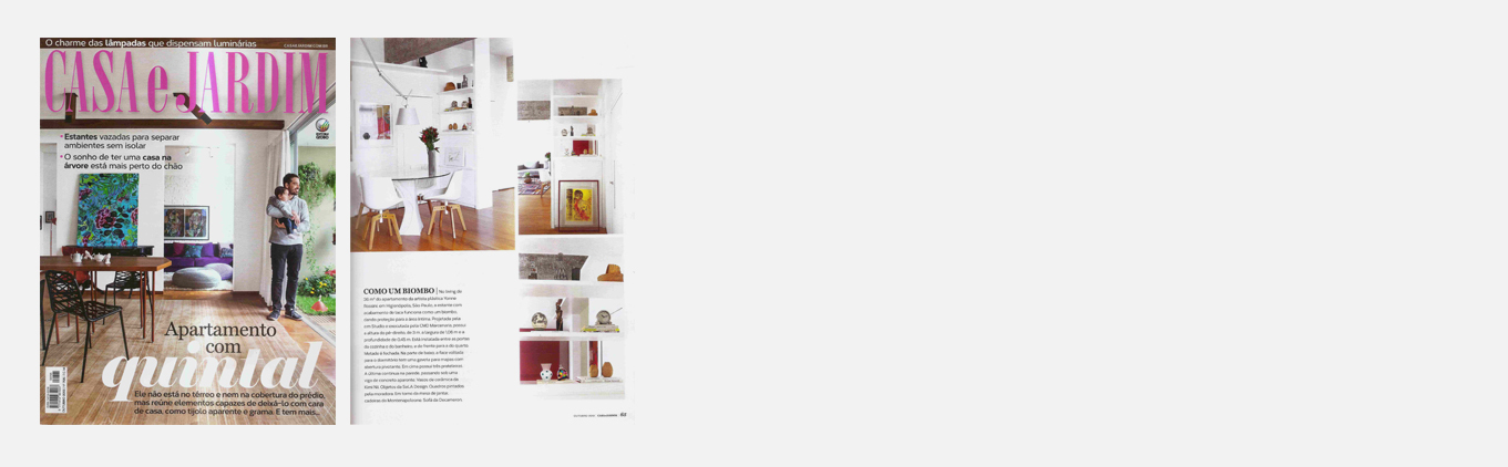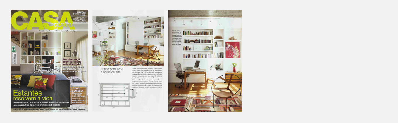 “Como um biombo, no living de 36 m2 do apartamento da artista plástica Yonne Rossini, em Higienópolis, São Paulo, a estante com acabamento de laca funciona como um biombo, dando proteção para a área íntima. Projetada pela a:m Studio e executada pela CMD Marcenaria, possui a altura do pé – direito de 3m a largura de 1.06m e a profundidade de 0.45m. Está instalada entre as portas da cozinha e do banheiro e de frente para do quarto.