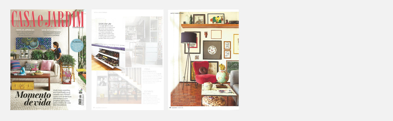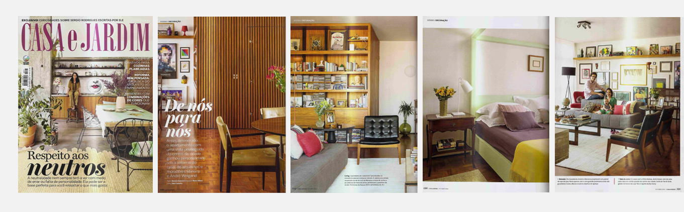 “Este apartamento já estava na família havia algum tempo. Tinha pertencido à minha avó, depois a um tio. Quando vim morar aqui com minha mãe, no começo dos anos 2000, o layout ainda era o original. Só em 2008 demos a primeira remodelada no imóvel, que se resumiu basicamente à troca de revestimentos, tampas, metais e piso do banheiro e da cozinha. Como minha mãe não gostava da ideia de abrir a parede entre a cozinha e a sala, mantivemos a configuração. Em 2009, ela se casou novamente e acabou se mudando. No ano seguinte, o André e eu decidimos então viver juntos aqui. Uma das primeiras providências que tomamos foi, enfim, integrar os ambientes sociais. Derrubamos toda a separação, mantendo só o trecho com o quadro de luz. Com a marcenaria resolvemos detalhes importantes na planta 60m². Estantes, prateleiras e nichos organizaram tudo e deixaram a casa com a nossa cara.” Mariana Teixeira Weigand, arquiteta de São Paulo. (...)”