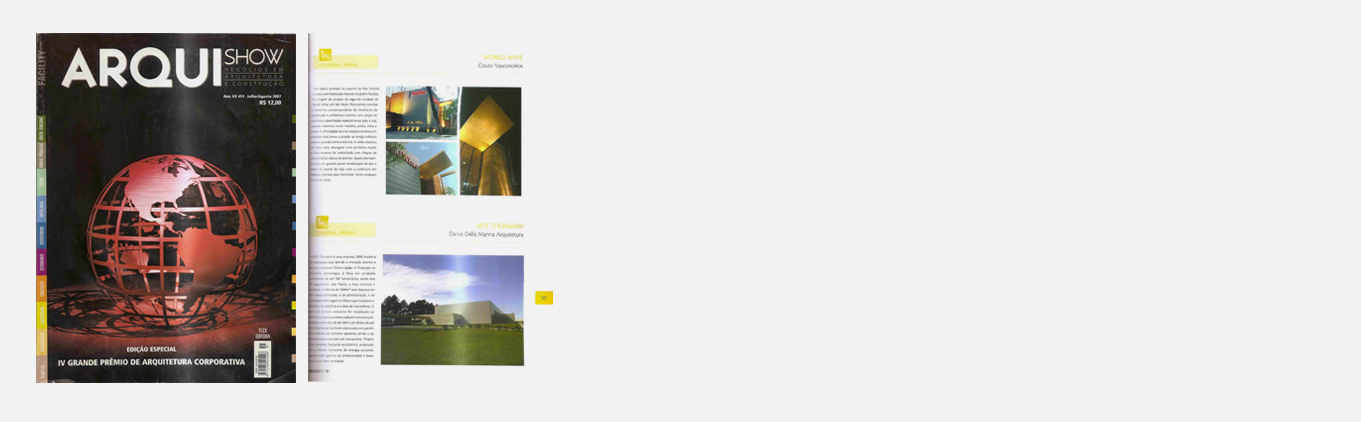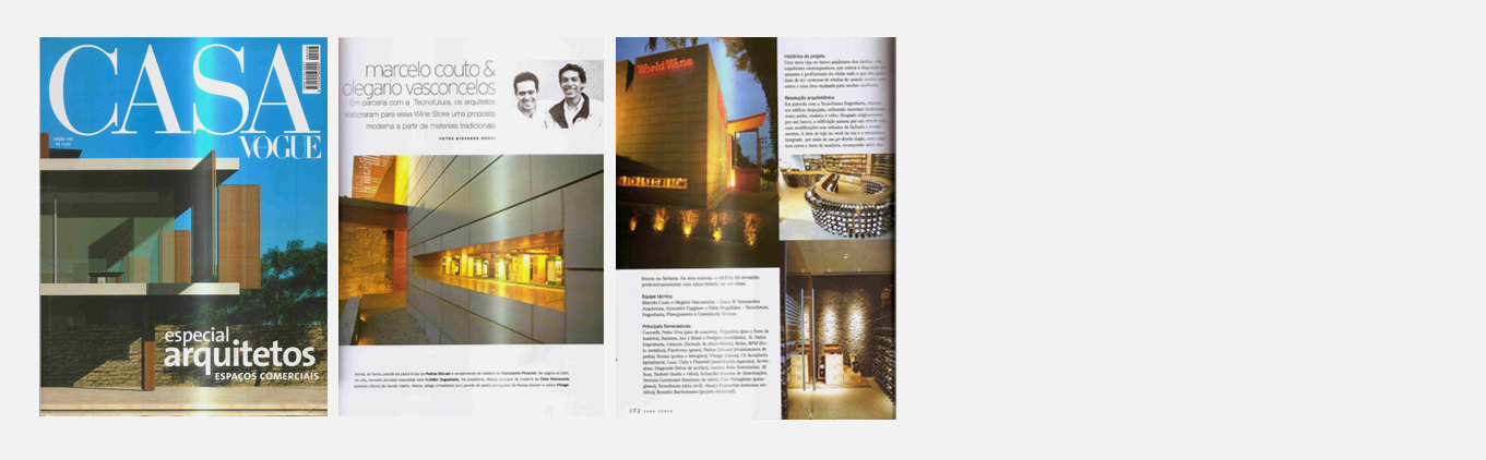 (...) "Um antigo sobrado na esquina da rua Estados Unidos com a Padre João Manuel, no Jardim Paulista, é a origem do projeto sa segunda unidade da World Wine, em São Paulo. Os arquitetos Marcelo Couto e Olegário Vasconcelos conseguiram conciliar o desenho contemporäneo do invólucro da construçãos e ambientes internos acolhedores, obtidos com peças de mobiliário desenhadas por eles e materiais como madeira, pedra, vidro e metal". (...) "A dificuldade de criar espaços diversos em pequena área levou os arquitetos a acoplar ao antigo sobrado tanto o quintal como a edícula. A união resultou numa caixa retängular com pé direito duplo. No térreo, destinado ao setor de vendas, um móvel expositor de forma orgänica, composto de madeira e vidro e desenhado pelos autores, otimiza o uso do ambiente e torna-se protaginista". (...) "No pavimento superior fica o ambiente de degustação, mesa em madeira da marcenaria Baraúna e cadeiras desenhadas por lina Bo Bardi. Mais ao fundo, a área antes ocupada pela construção anexa abriga o escritório, copa e sanitário, interligando-se a degustação por uma passarela. Uma robusta viga metálica sustenta parte do corpo frontal do piso superior, mas um interessante recurso de desenho - garrafas cortadas na altura do gargalo com os fundos voltados para o setor de vendas oculta a peça estrutural. Vistas do acesso, as prateleiras com os fundos das garrafas criam um painel que personificam o espaço. Na face externa, os arquitetos trabalharam praticamente com os mesmos materiais, dando igual atenção a ambas as faces. Chapas de zinco e titänio, placas de arenito, ripado alternan-se com um grande painel envidraçado de alto a baixo na lateral da loja, com a cobertura em balanço prevista para funcionar como anteparo ao sol da tarde". (Por Adilson Melendez)