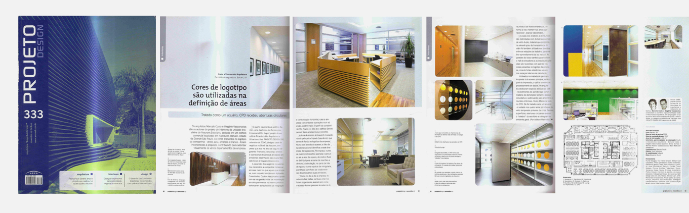 (...) "O quarto pavimento do edifício Demini, uma das torres do Condomínio Empresarial Rio Negro, abriga a base de negócios no Brasil da Assurant, empresa que atua na área de seguros de garantia financeira. (...) "A área de acesso a Assurant é caracterizada pelo painel ripado (pau-ferro), que serve de fundo ao logotipo da empresa. (...) "No espaço, o piso de mármore travertino assinala o percurso até a área de espera, de onde o fluxo se distribui para as salas de reuniões e diretoria". (...) "Como no dia-a-dia a empresa recebe muitas visitas, os fluxos, internos foram organizados levando em conta o acesso dessas pessoas as salas de reuniões e de videoconferëncias, de forma a nao interferir nas áreas operacionais", explica Vasconcelos (...) "A sala dos diretores e de reuniões são delimitadas com divisórias piso-teto em vidro duplo, material que proporciona alto grau de tranparëncia. O vidro foi utilizado também nos biombos entre as estações de trabalho, para melhor aproveitamento da luz natural. As paredes do bloco central que envolvem o hall de elevadores e as instalações prediais são revestidas com painéis nas cores presentes no logotipo da empresa, criando fortes referëncias visuais nos espaços internos de circulação". (...) "Os arquitetos dedicaram especial atenção ao café - revestimentos de parede (aço corten e madeiras de demolição) tornam o espaço convidativo e estimulante para encontros e reuniões informais. Outro diferencial está no CPD. Ele foi tratado como um aquario - é vedado nos quatro lados com chapas de vidro temperado pintadas de cinza. Nessas superfícies, aberturas circulares revelam o "cérebro" do escritório e o integram ao ambiente geral". (Por Adilson Melendez)
