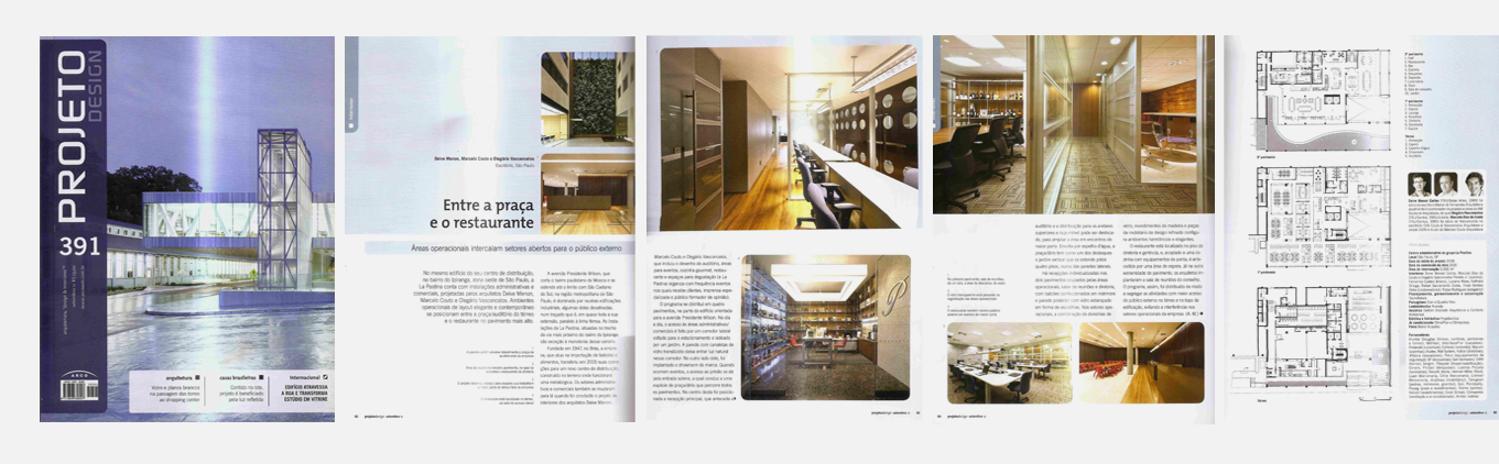 "No mesmo edifício do seu centro de distribuição, no bairro do Ipiranga, zona oeste de São Paulo, a La Pastina conta com instalações administrativas e comerciais, projetadas pelos arquitetos Deive Menon, Marcelo Couto e Olegário Vasconcelos. Ambientes operacionais de layout elegante e contemporâneo se posicionam entre a praça \auditório do térreo e o restaurante no pavimento mais alto.