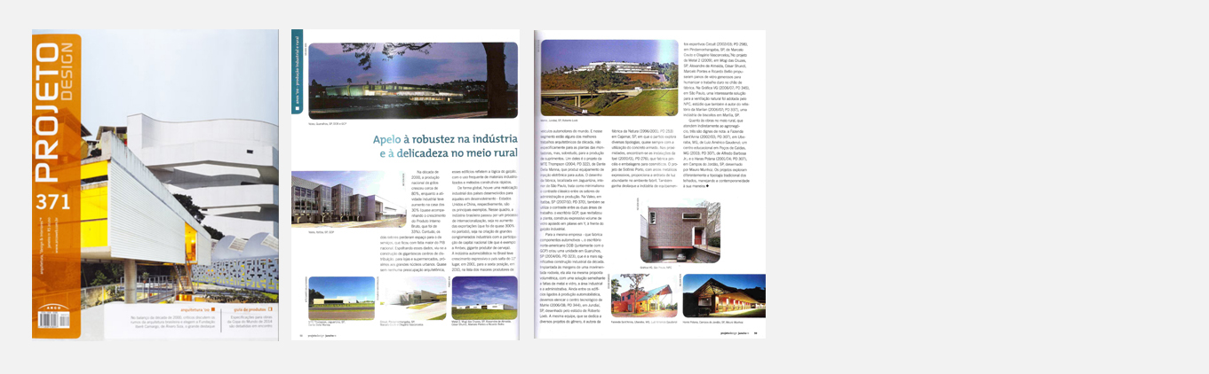 "Na decada de 2000, a produção nacional de grãos cresceu cerca de 80%, enquanto a atividade industrial teve aumento na casa dos 30%. (...) Espelhando estes dados, viu-se a construção de gigantescos centros de distribuição, para lojas e supermercados, próximos aos grandes núcleos urbanos. Quase sem nenhuma preocupação arquitetônica esses edificios refletem a logica do galpão, com uso frequente de materiais industrializados e métodos construtivos rápidos. De forma global houve relocação industrial dos países desenvolvidos para aqueles em desenvolvimento. Nesse quadro, a industria brasileira passou por um processo de internacionalização, seja no aumento de exportações, seja na criação de grandes conglomerados industriais com a participação de capitala nacional (ex: Ambev). (...) E neste segmento estão alguns dos melhores trabalhos arquitetônicos da década. (...) Também ganha destaque a indústria de equipamentos esportivos Circuit, em Pindamonhangaba, SP, de Marcelo Couto e Olegário Vasconcelos. "
