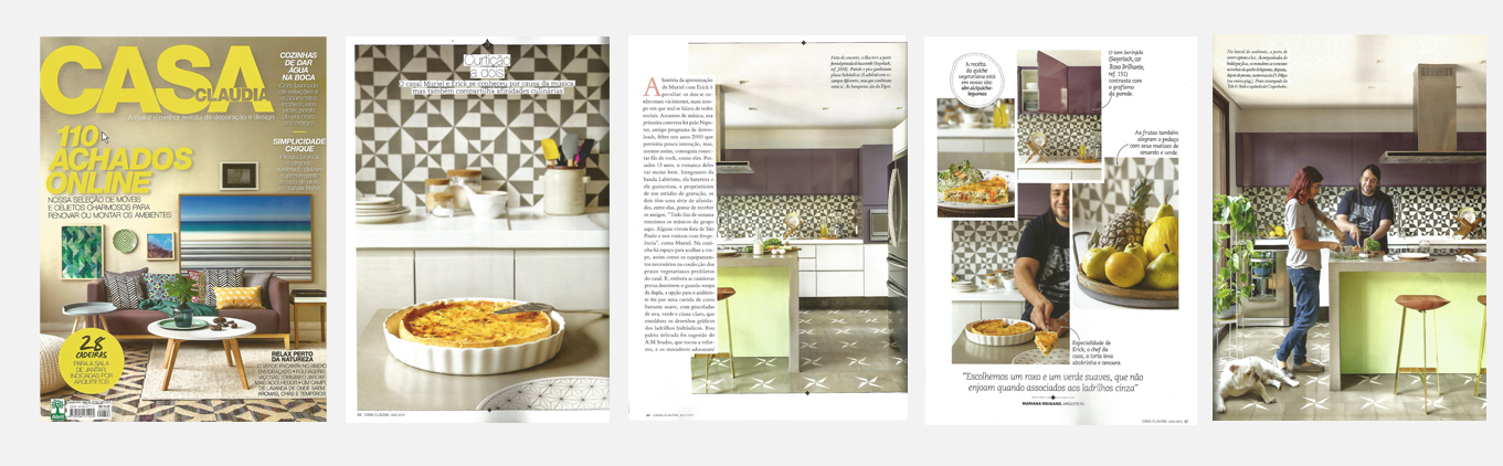 “A história da aproximação de Muriel com Erick é peculiar: os dois se conheceram via internet, num tempo em que mal se falava de redes sociais. Amantes de música, sua primeira conversa foi pelo Napster, antigo programa de downloads, febre nos 2000 que permitia pouca interação, mas, mesmo assim, conseguia conectar fãs do rock, como eles. Passados 13 anos, o romance deles vai muito bem. Integrantes da banda Labirinto, ela baterista e ele guitarrista, e ele guitarrista, e proprietários de um estúdio de gravação, os dois têm uma série de afinidades, entre elas, gostar de receber os amigos. “Todo fim de semana reunimos os músicos do grupo aqui. Alguns vivem fora de São Paulo e nos visitam com frequência”, conta Muriel. Na cozinha há espaço para acolher a trupe, assim como os equipamentos necessários na confecção dos pratos vegetarianos prediletos do casal. E, embora as camisetas pretas dominem o guarda-roupa da dupla, a opção para o ambiente foi por uma cartela de cores bastante suave, com pinceladas de uva, verde e cinza-claro, que emoldura os desenhos gráficos dos ladrilhos hidráulicos. Essa paleta delicada foi sugestão do A:M Studio, que tocou a reforma, e os moradores adoraram!”