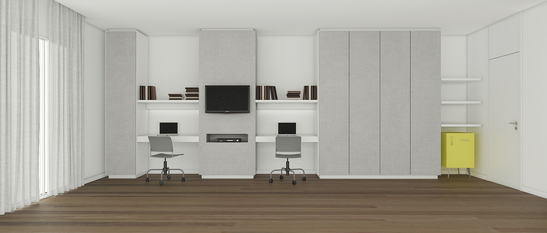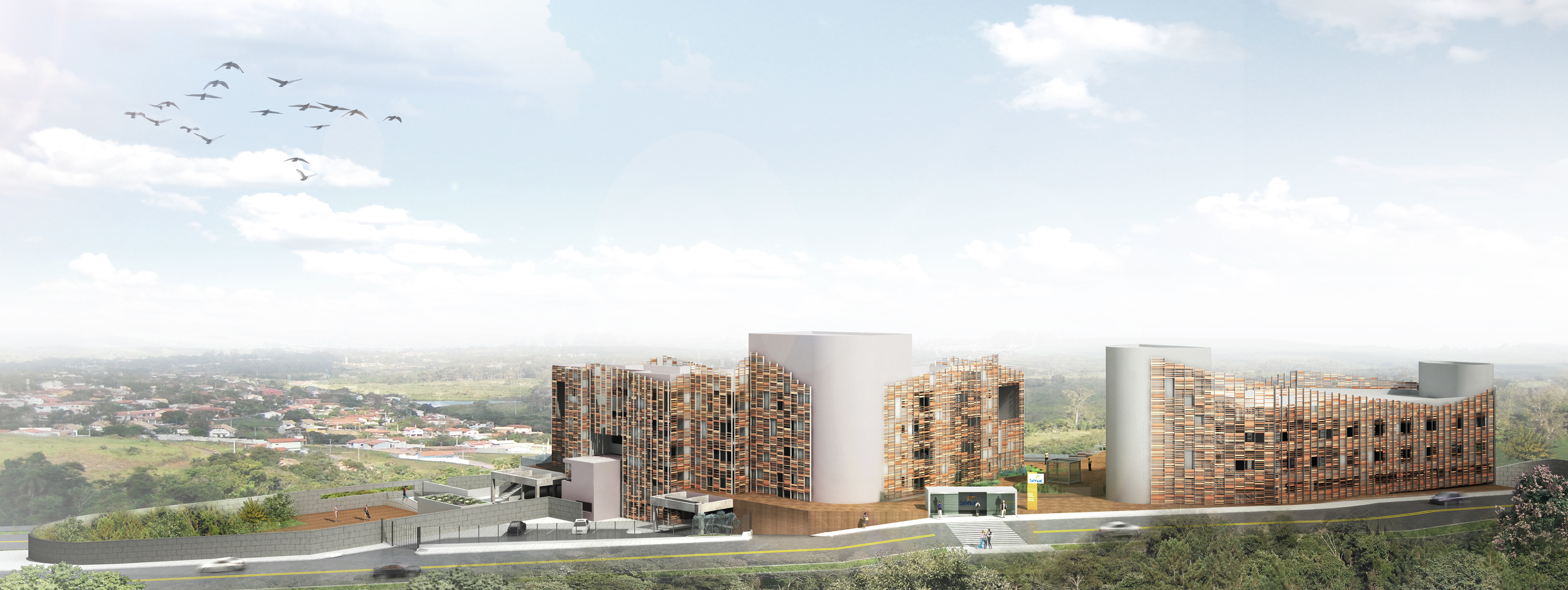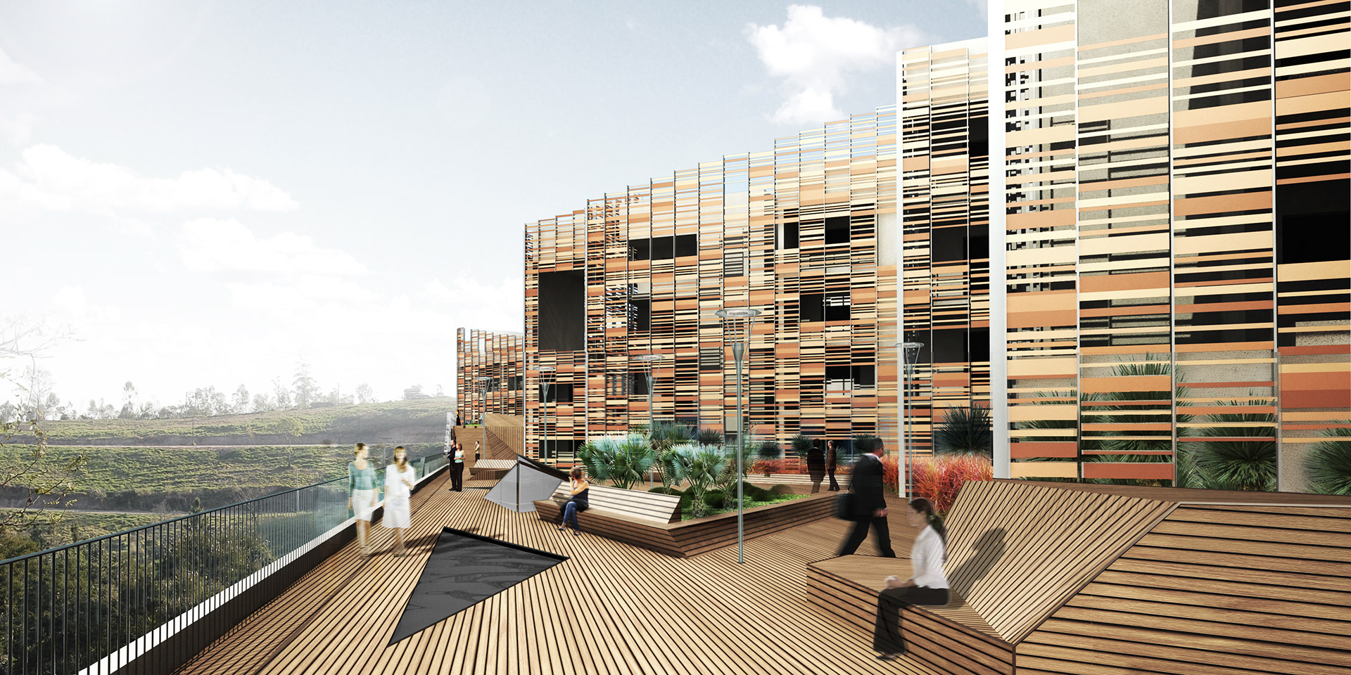 A Praça de Convivência, localizada sobre o térreo dos edifícios agrupa os blocos norte e sul. “Optamos pelo piso em deck elevado de madeira para a praça. Canteiros e espelhos d’água definem a conformação de uso do espaço, que tem vista para um vasto vale de um novo bairro que está se formando”, ressalta a equipe.