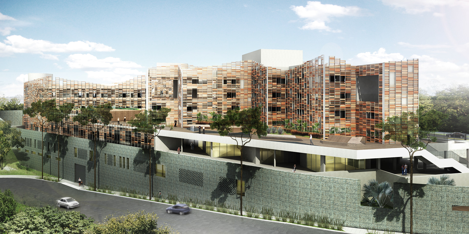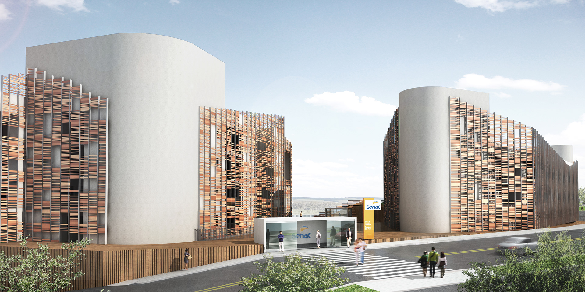 O complexo recebeu revestimento de cerâmica extrudada de perfis variados e brises. “Os perfis são dispostos em quatro módulos que podem ser utilizados de forma invertida, totalizando oito módulos diferentes de brises que garantem maior eficiência térmica e caracterizam o complexo com uma imagem marcante”, destacam os arquitetos.