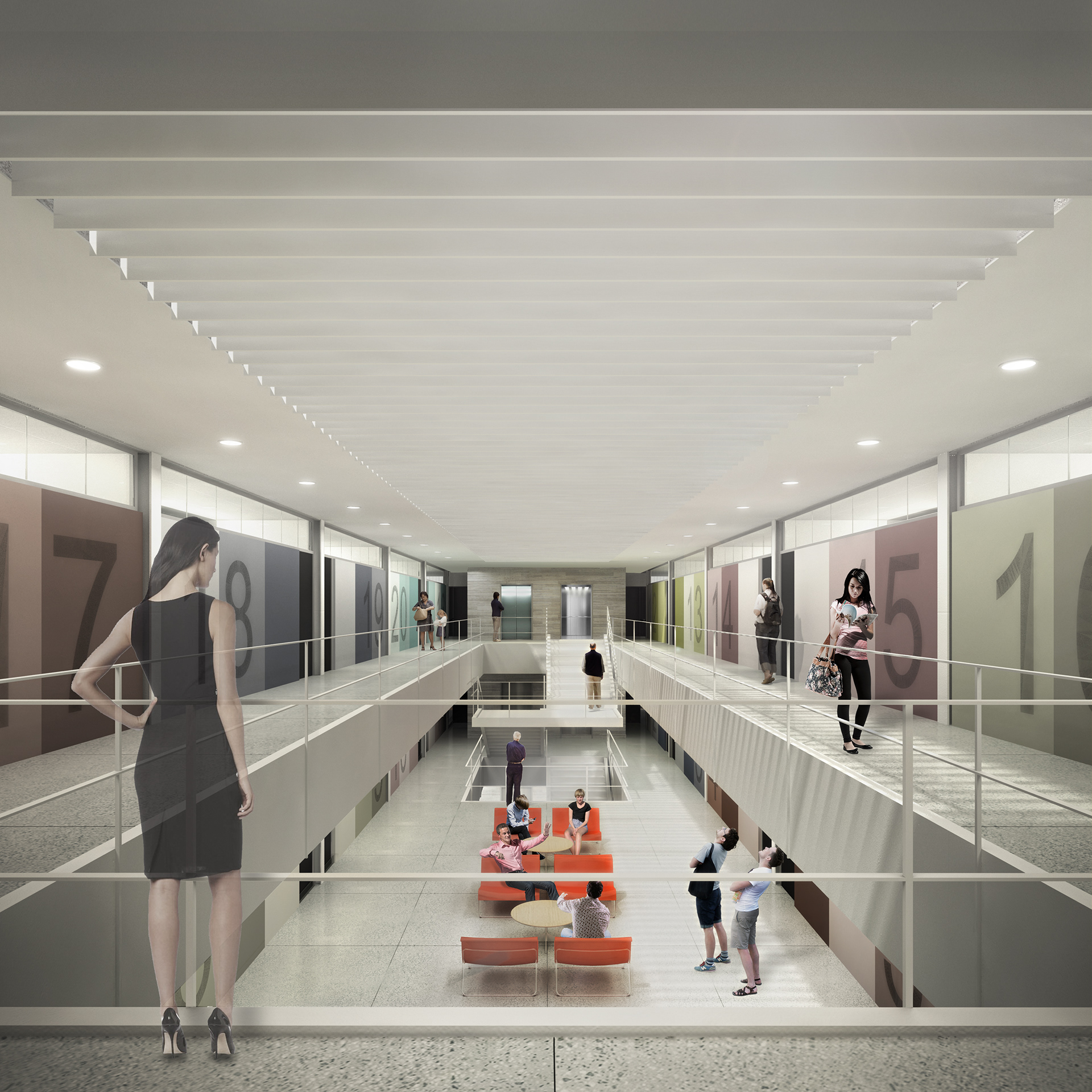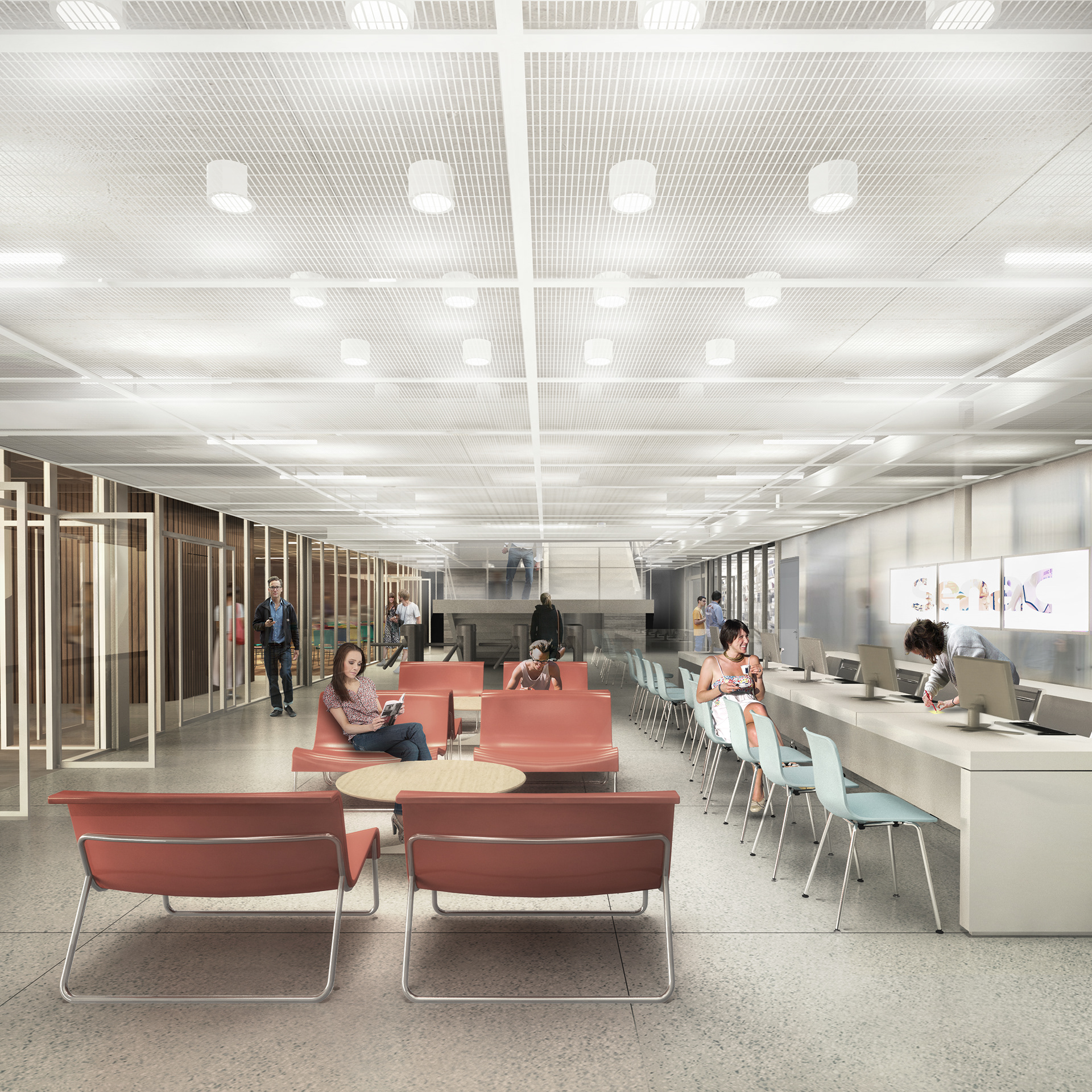 As salas de aula e laboratórios ocupam os módulos longitudinais das fachadas. Livres de qualquer elemento estrutural são flexíveis quanto sua partição – podendo ser redivididos conforme novas demandas. Via de regra, o pátio central é o espaço que permite esta flexibilidade das adjacências; circulações verticais e horizontais, banheiros, convivência, áreas técnicas e saída de emergência – elementos fixos, foram alocados nessa faixa central. Esta paisagem interior não estaria completa sem o conforto térmico e lumínico garantido pela abertura zenital que promove a habitabilidade desse núcleo. Se o racicínio do térreo foi a expansão dos vetores visuais horizontais, na Plataforma, em oposição, são os vetores verticais que promovem a personalização desse espaço.