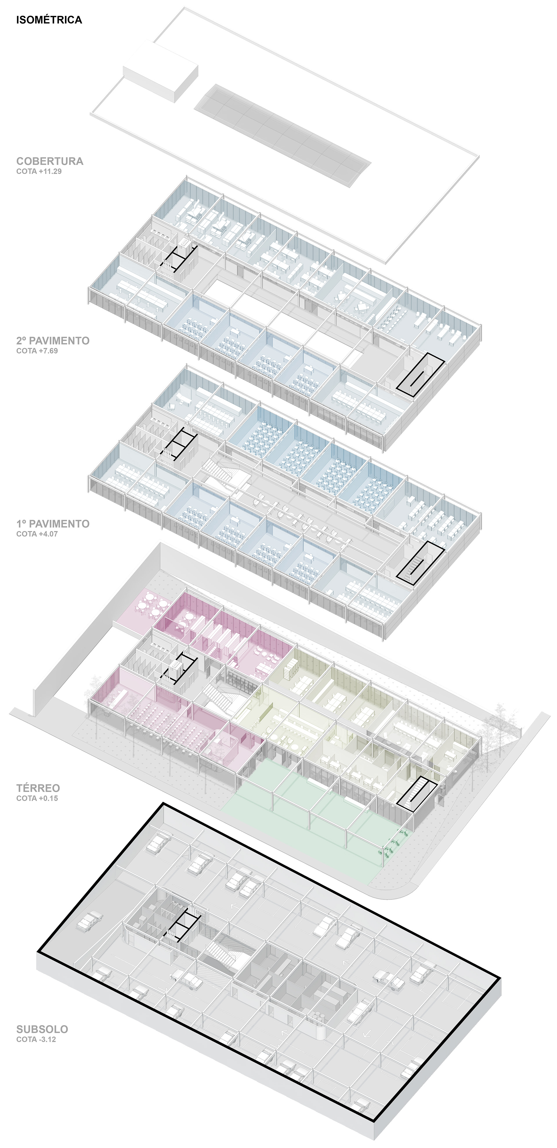 - Apoio (Subsolo) local onde foi alocado, além do Estacionamento, a porção do programa auxiliar ao bom funcionamento do edifício.
