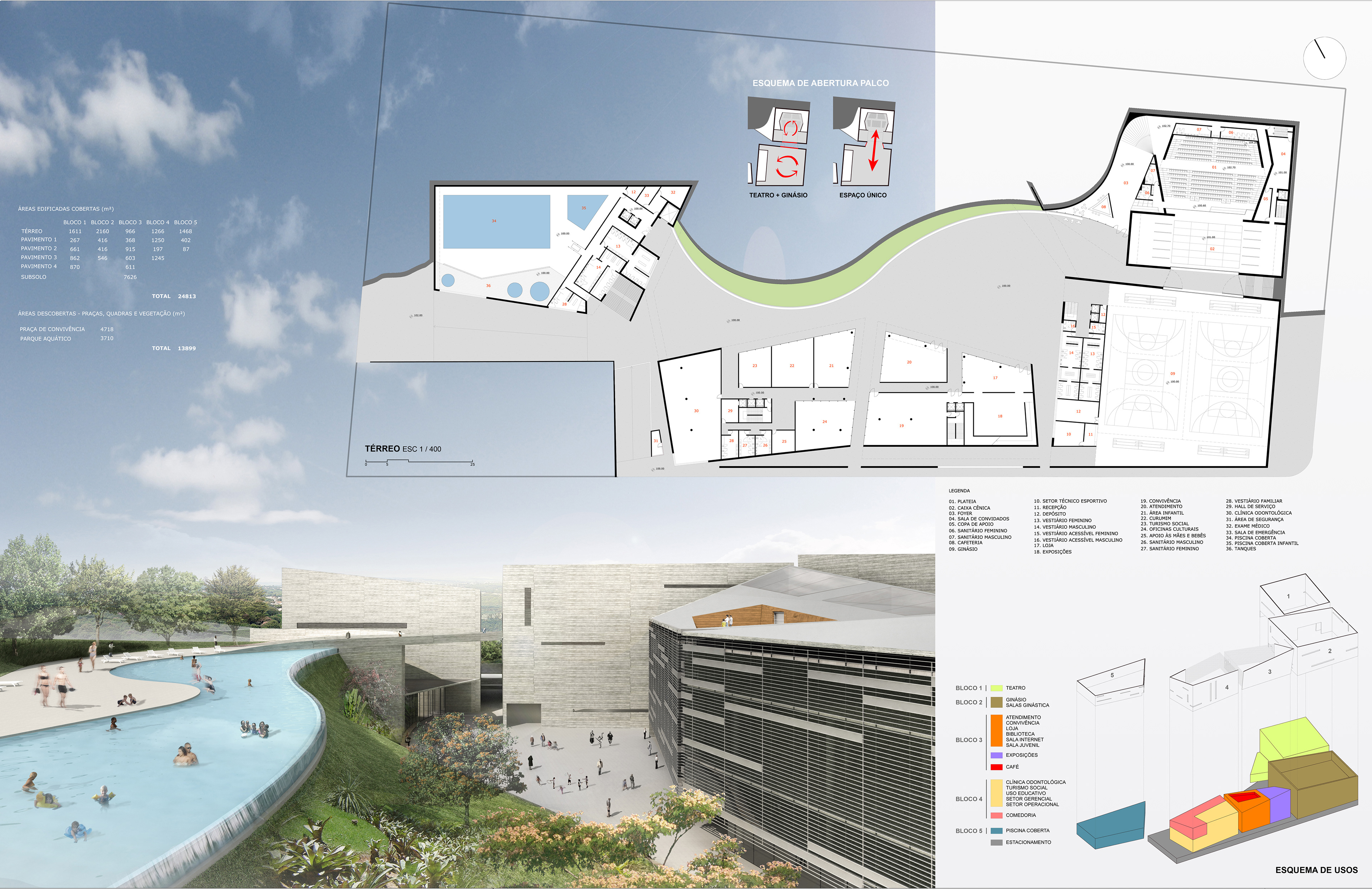 No Térreo fazendo frente à Praça de Convivência, concentram-se usos e ocupações que recebem e interligam o usuário a todo complexo. Sendo o Bloco Três o central que concentra as atividades mais abertas a visitantes: Central de Atendimento, Convivência Coberta e Exposições. O Bloco Quatro, complementar ao Bloco Três, possui usos e atividades mais reservadas, mas que necessitam de acesso facilitado, como a Odontologia e outros serviços sociais de atendimento aos cidadãos de Franca.