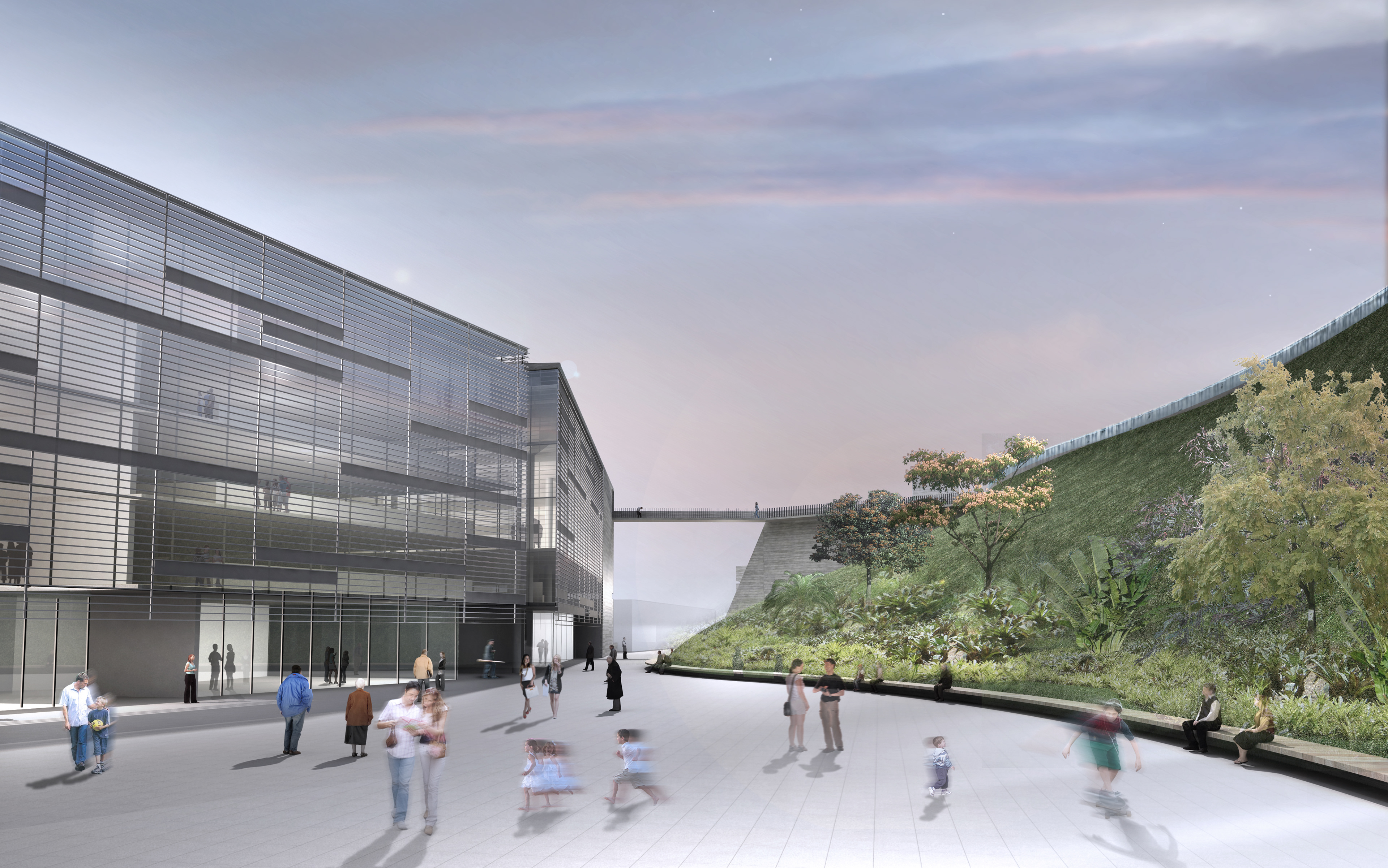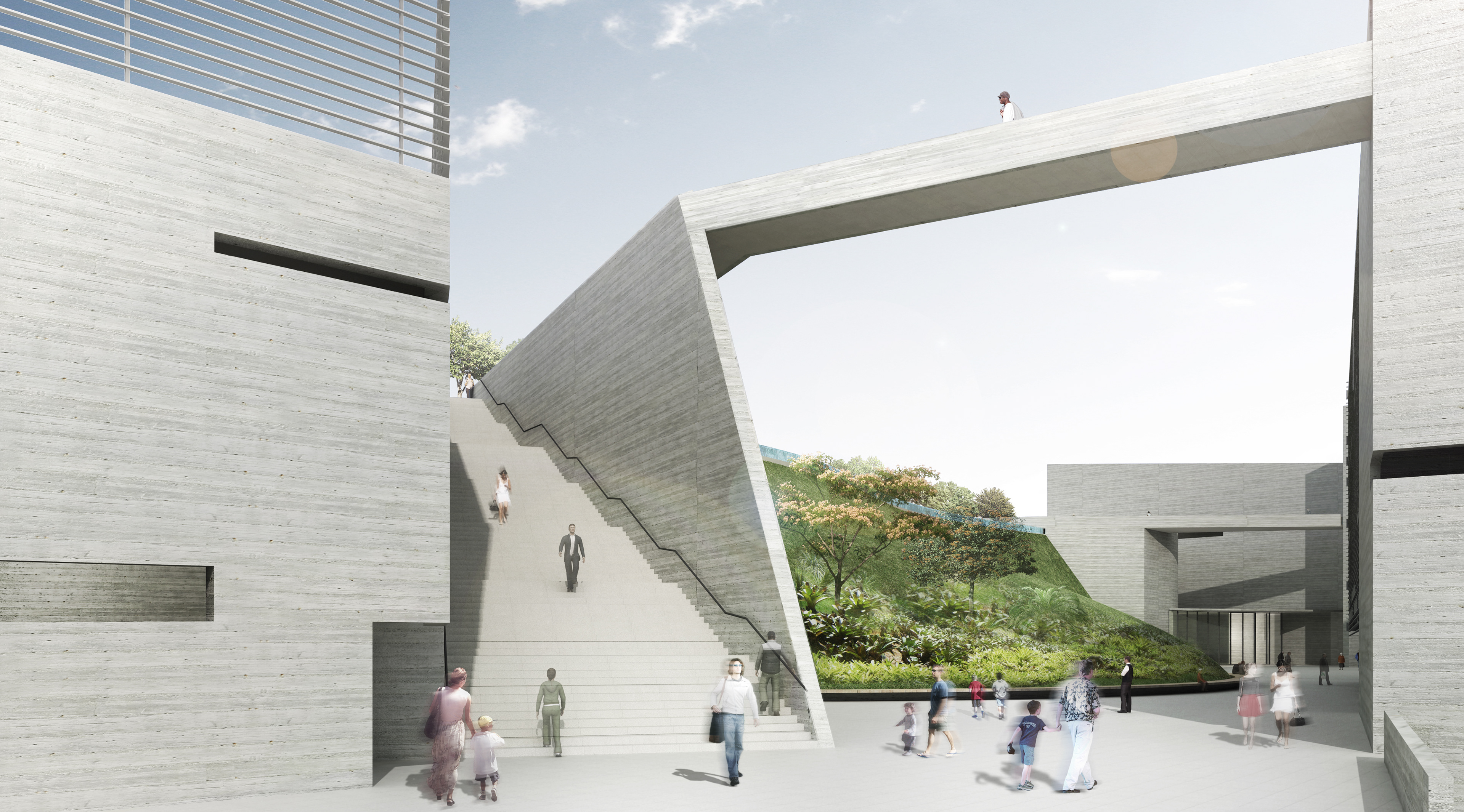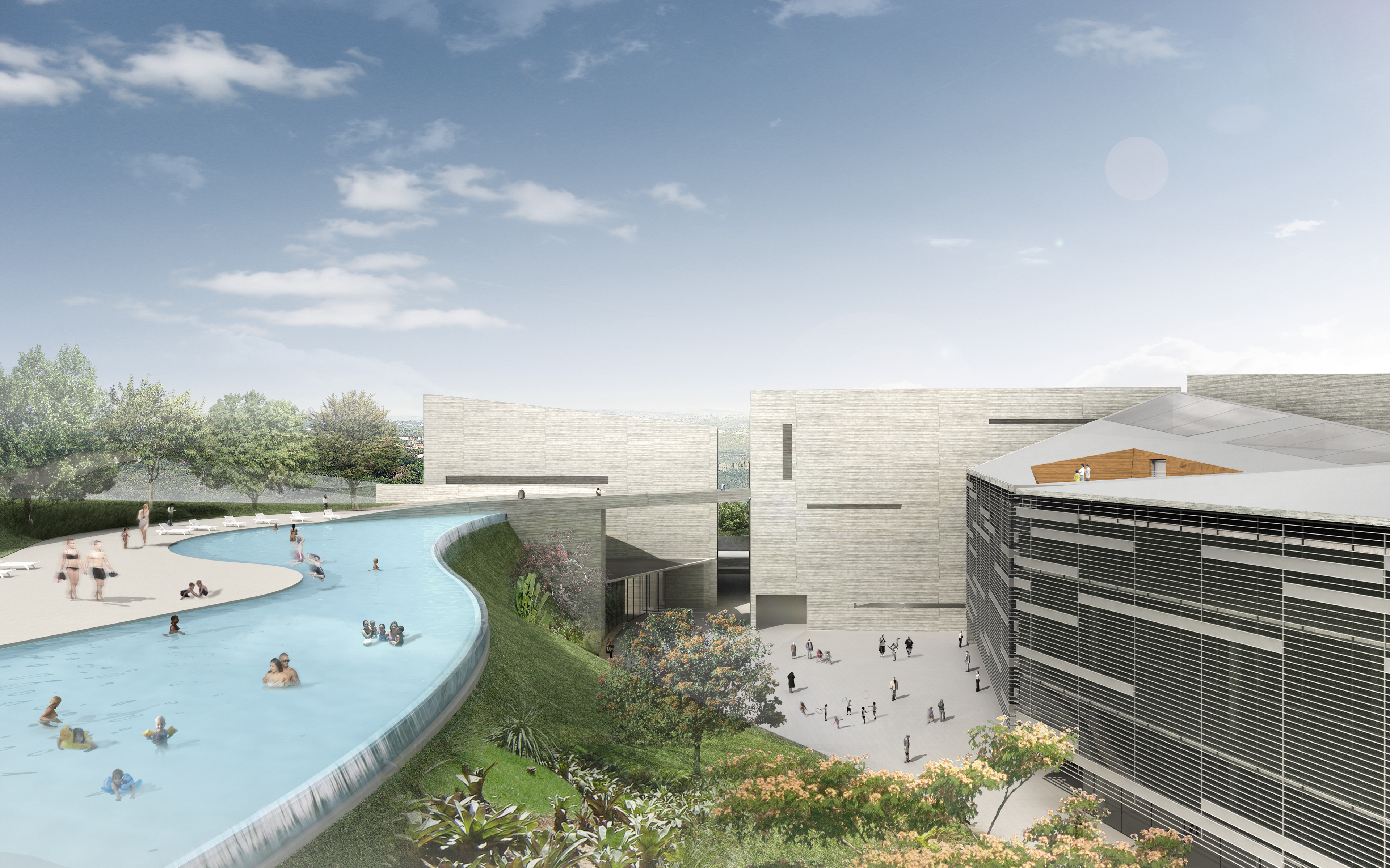 Proporcionando surpresa em seu interior o edifício se abre para a Praça de Convivência. O impacto com o talude preservado e a conformação das curvas de nível do terreno, arborizado e naturalmente belo traz a primeira grande revelação. Quatorze metros acima, um planalto acomoda o Parque Aquático cuidadosamente posicionado para que o Sol esteja sempre presente e a relação com o edifício tenha uma escala mais amena e distante, buscando criar um ambiente de entretenimento junto ao paisagismo e vegetação, distanciando a pessoa das preocupações do dia-dia da cidade.
