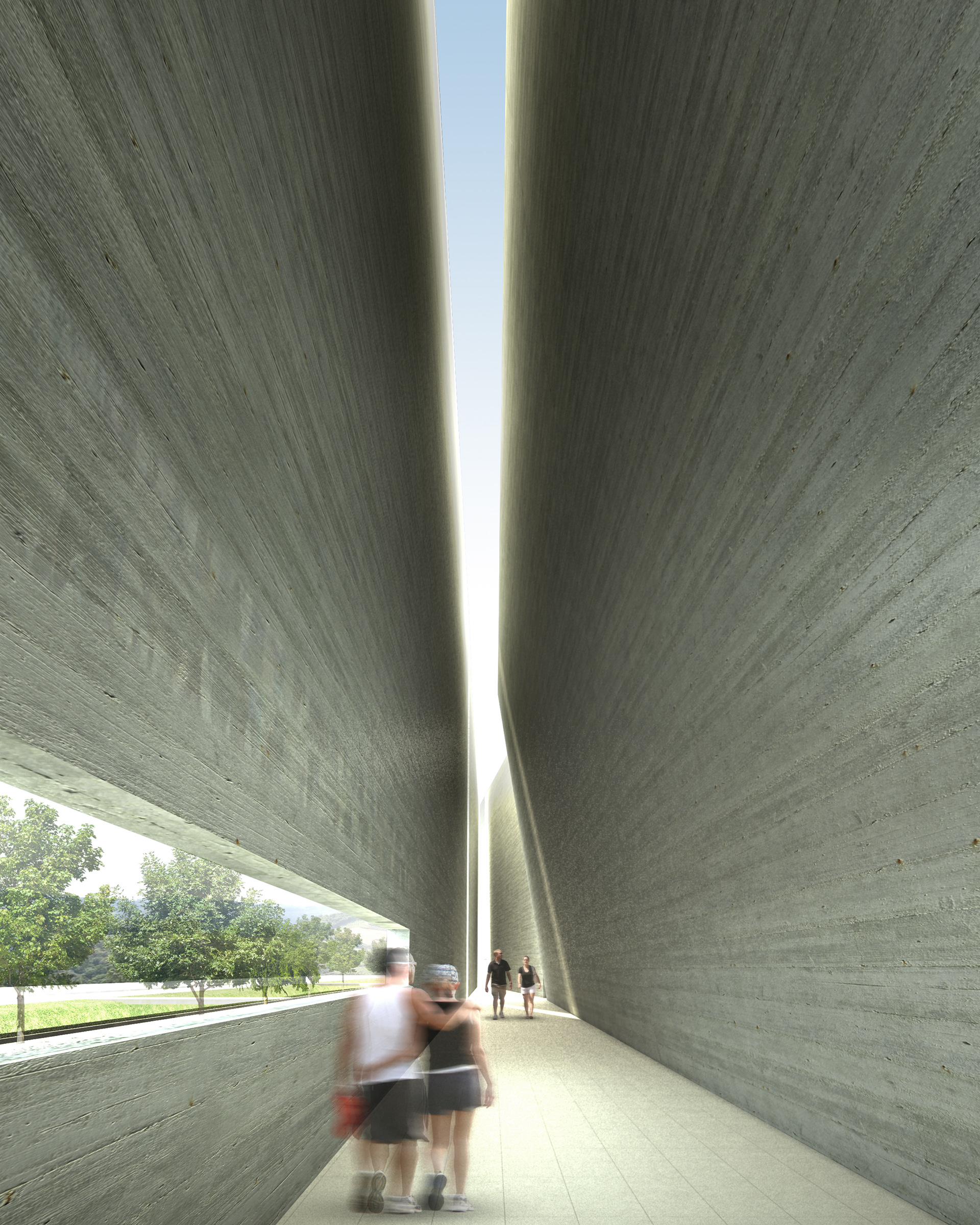 De caráter cultural e escultural, paralelo a Av. Alonso y Alonso, um passeio atravessa duas fendas de entrada no conjunto, e serve como elemento de equilíbrio térmico para vazão de ar quente e entrada de ar frio aos ambientes desta fachada, formando uma “casca” protetora e monumental, que leva o observador a uma reflexão entre luz, forma e espiritualidade.