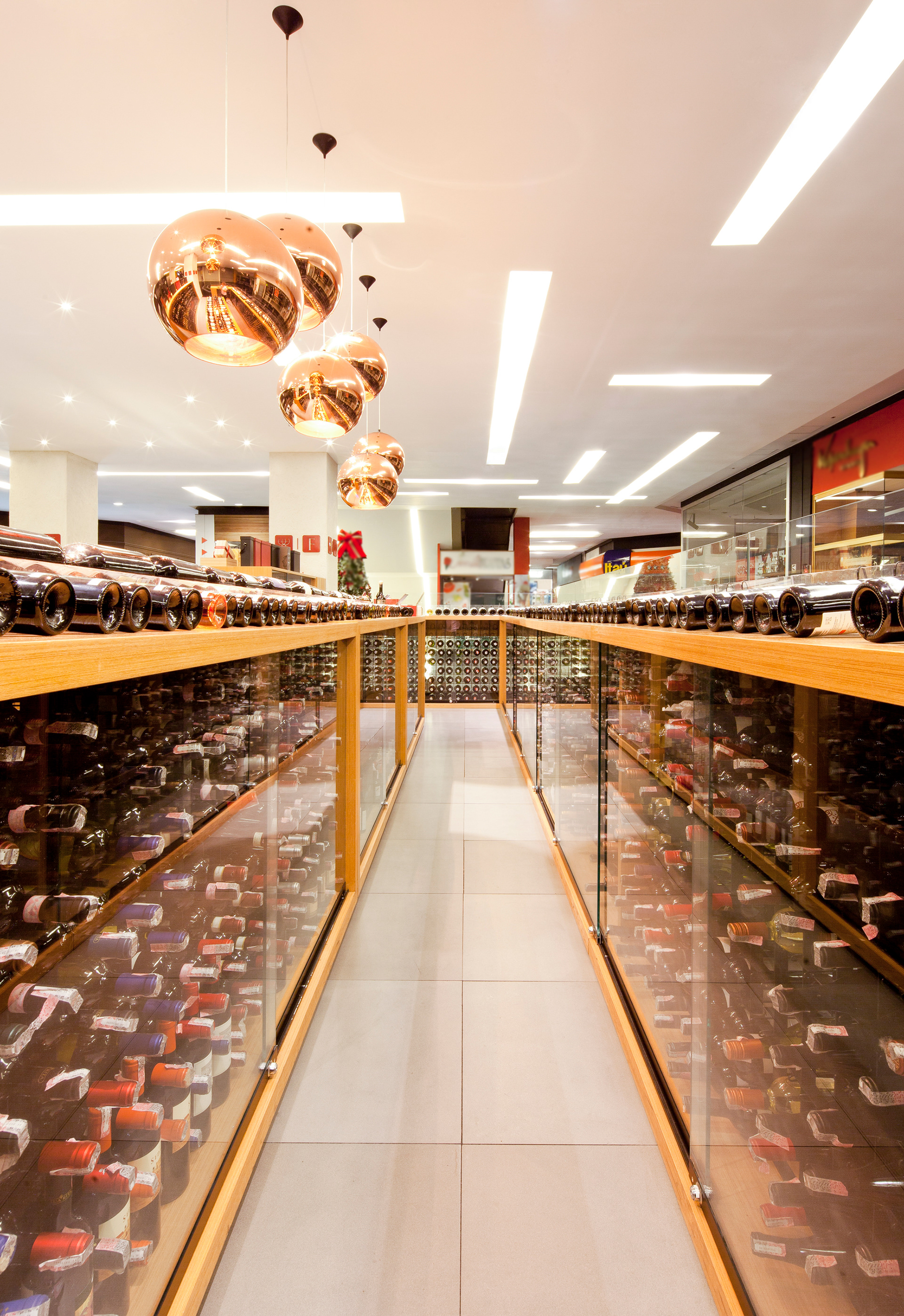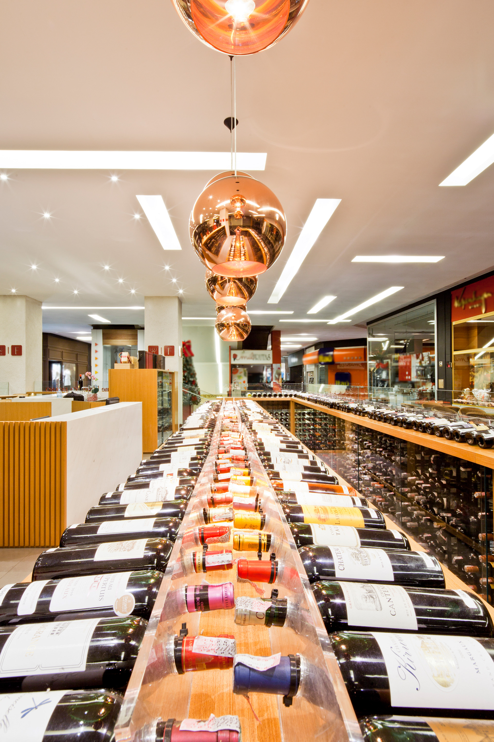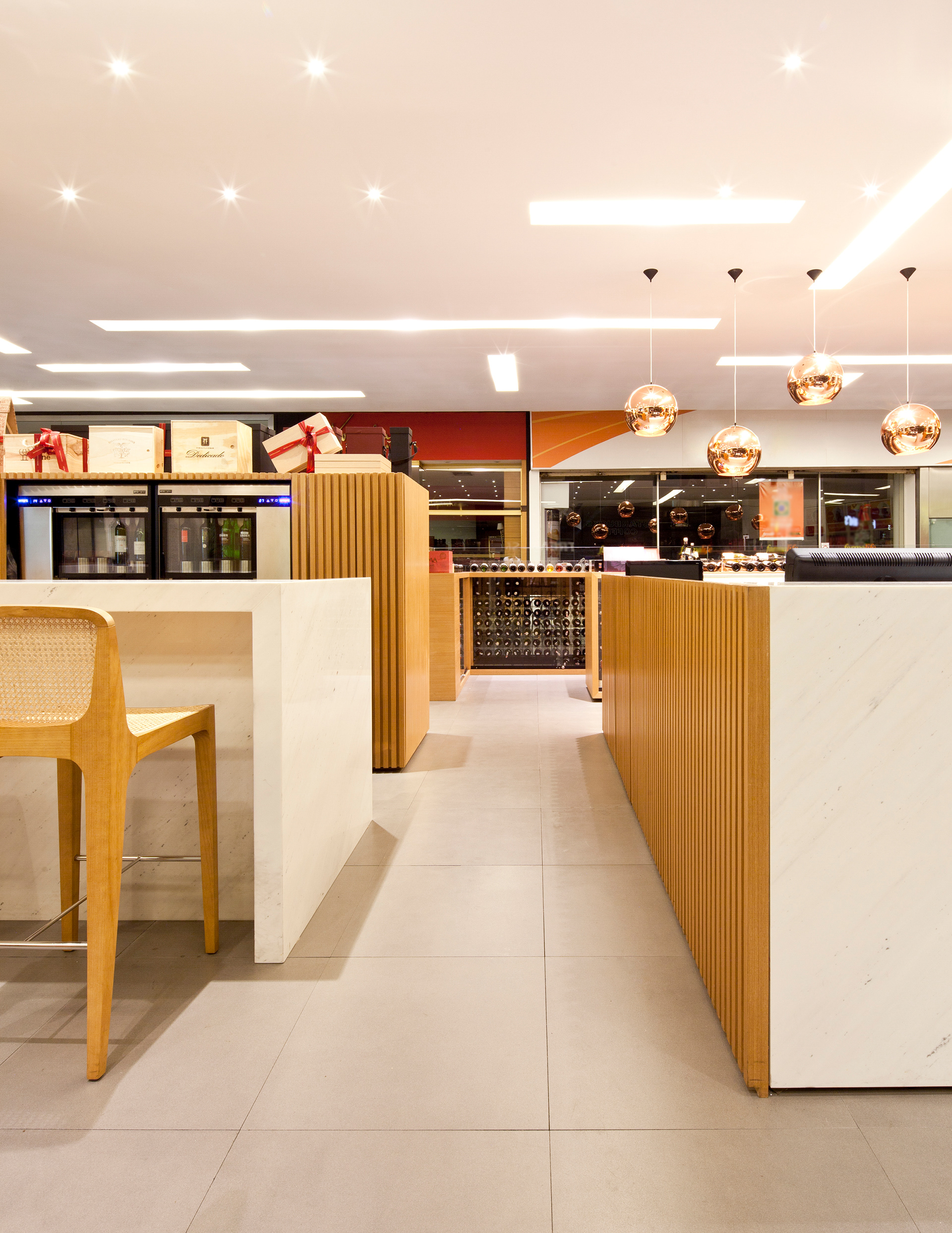 Mármore branco pigues, madeira, vidro e aço corten convivem em harmonia em meio a mais de 800 rótulos de vinhos, entre ambientes de degustação, exposição, caixa e estoque.