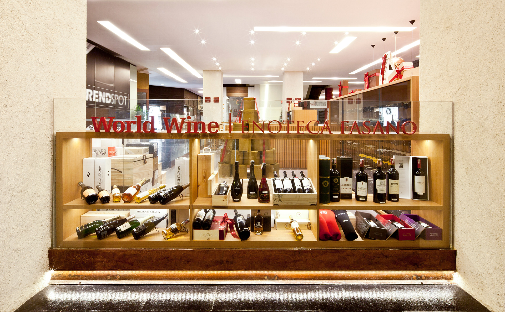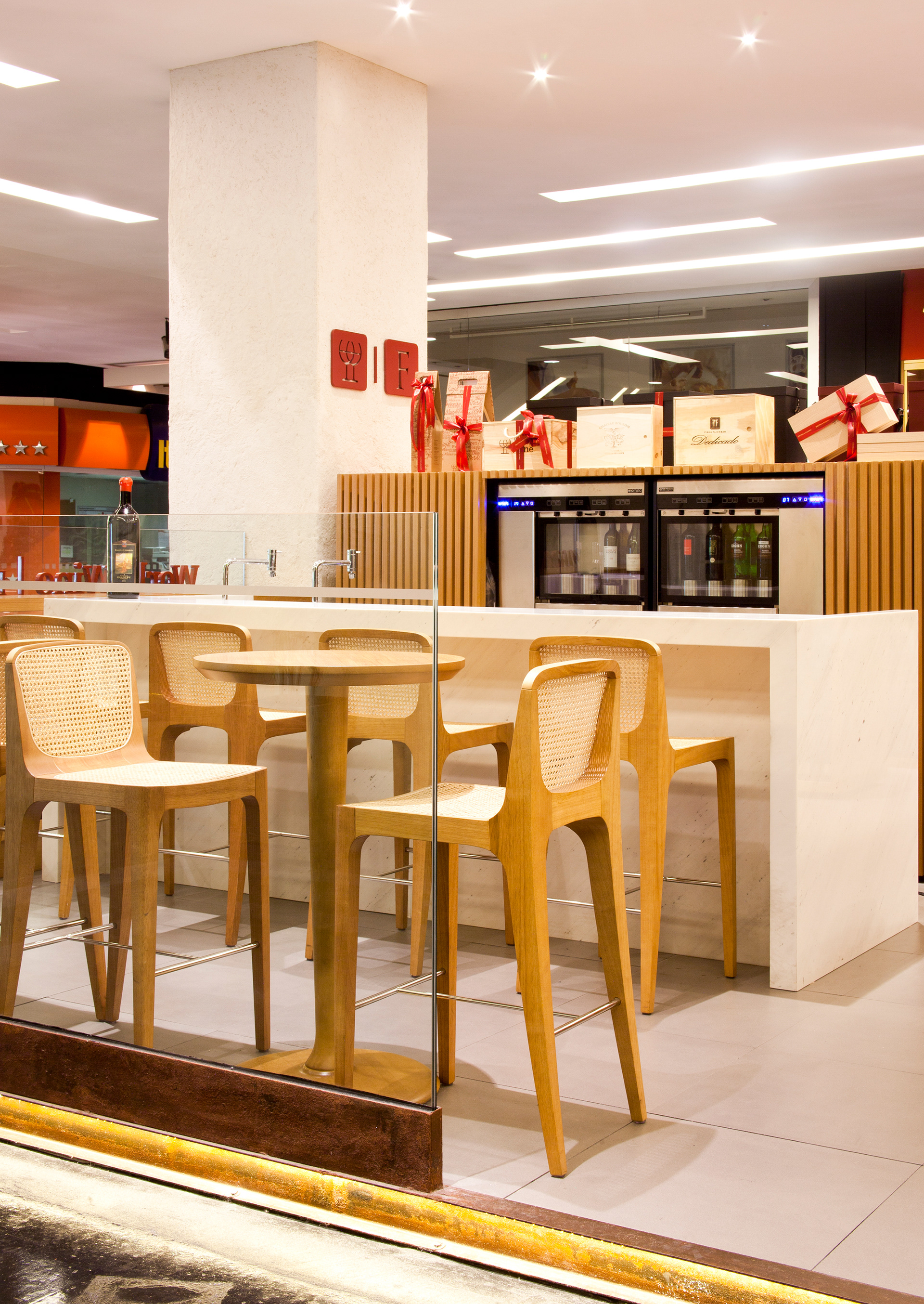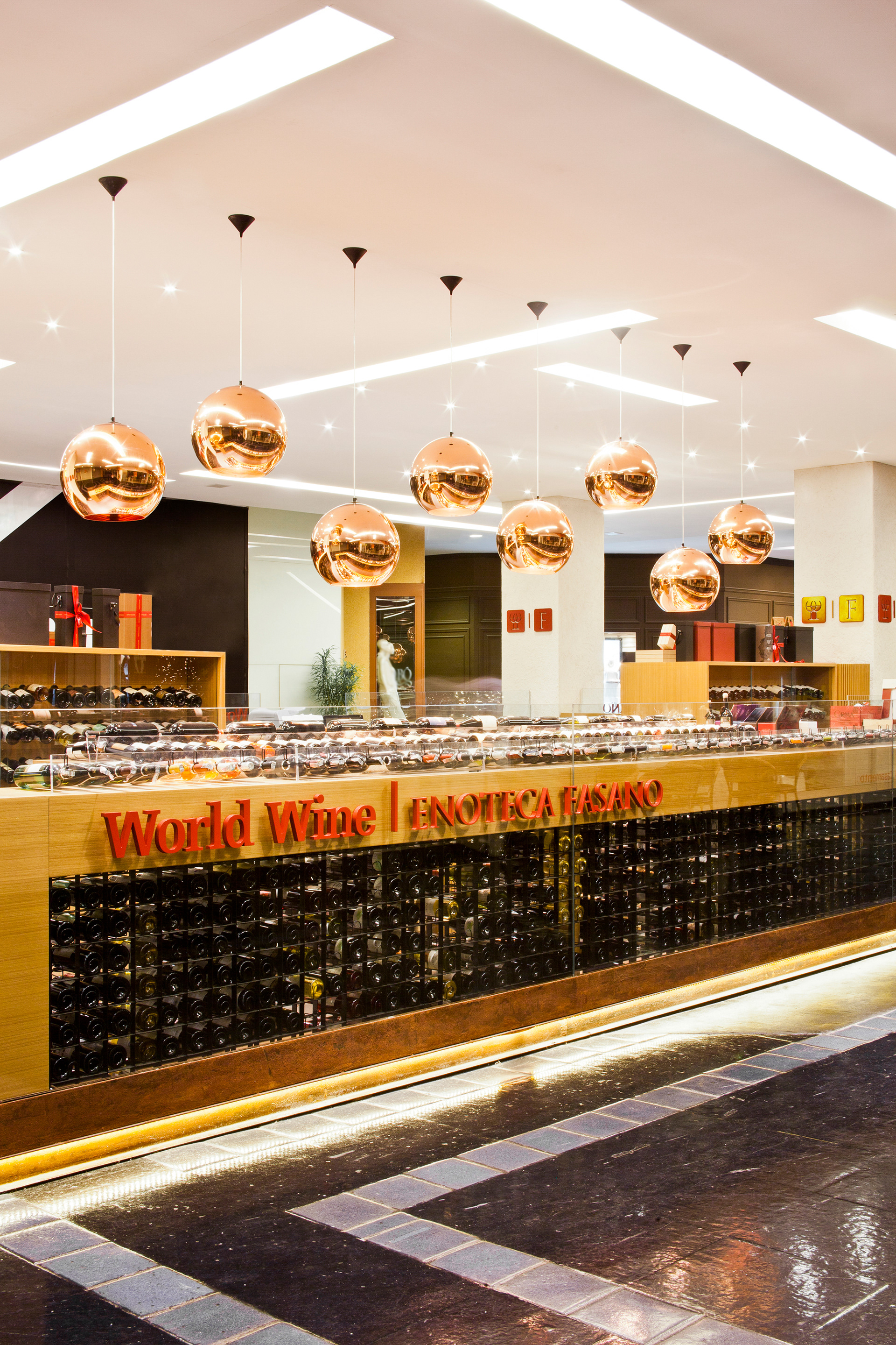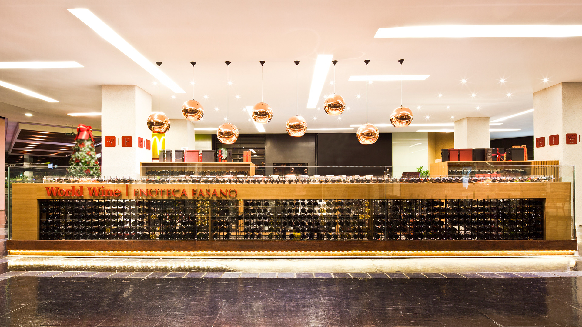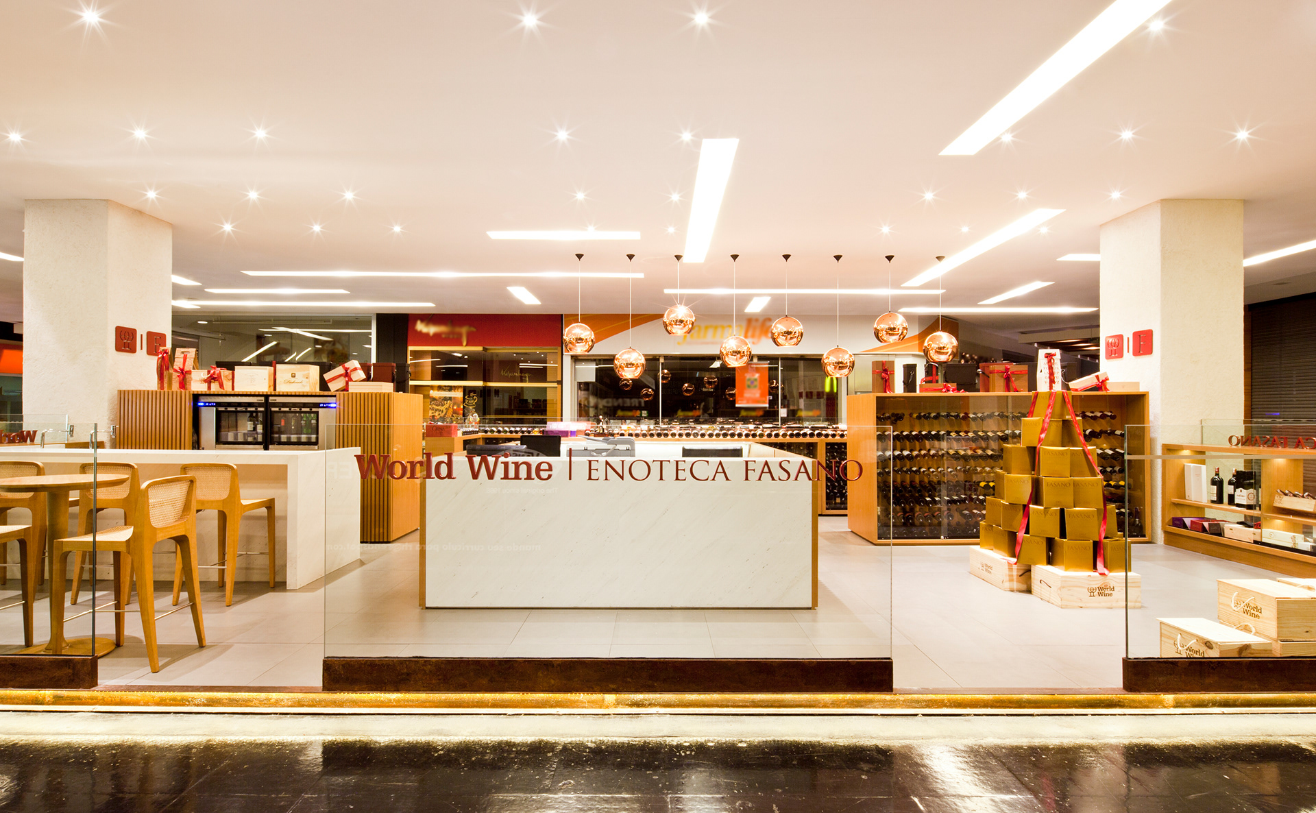 Atendendo um prazo curtíssimo de projeto e obra, o resultado desta loja de 90m2 aberta no meio do Shopping Fashion Mall no Rio de Janeiro foi inovador. O quiosque da World Wine Enoteca Fasano se transformou em um belo espaço de venda e degustação de vinhos, através do uso de materiais transparentes e uma marcenaria e serralheria desenhada sob medida, convidando os consumidores a entrar por qualquer lado da loja.