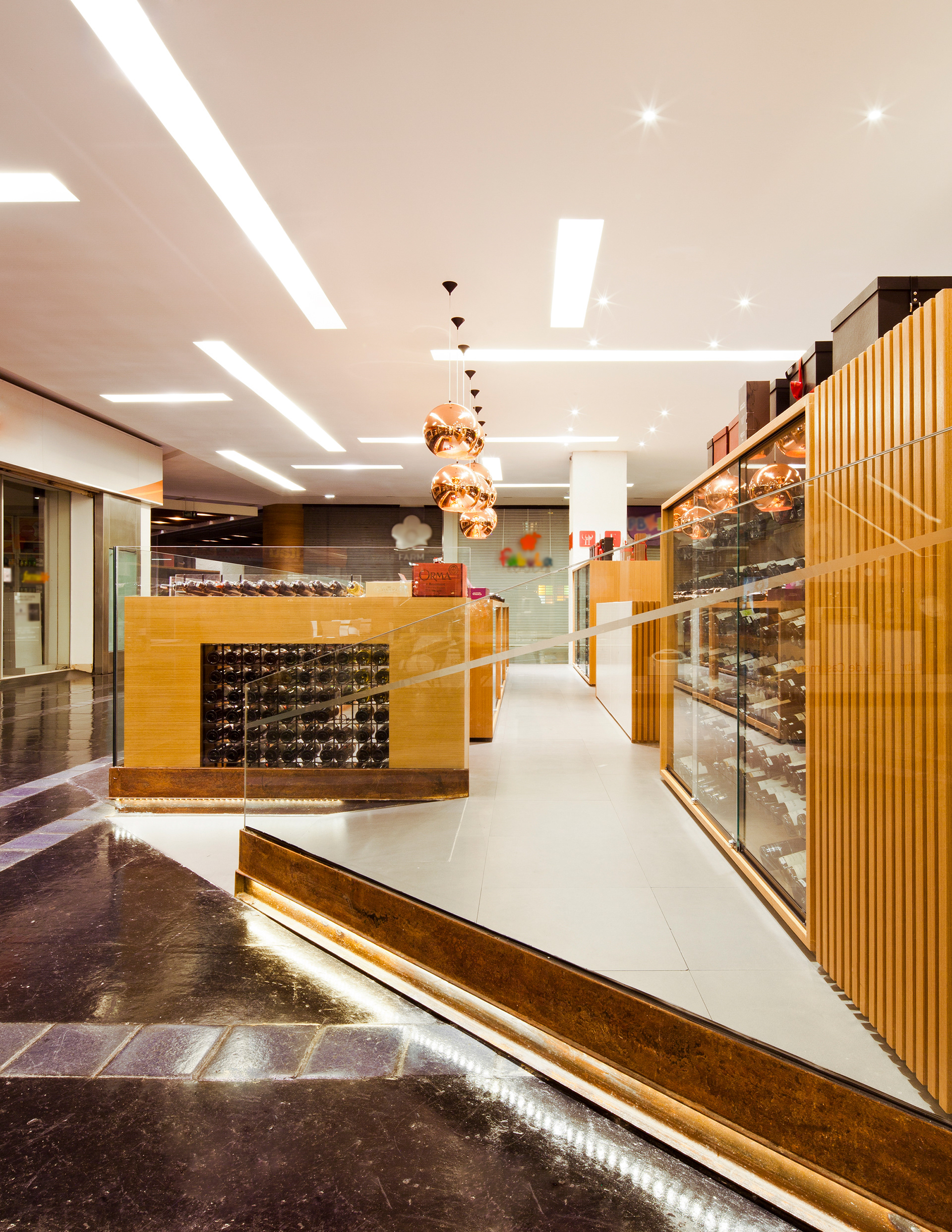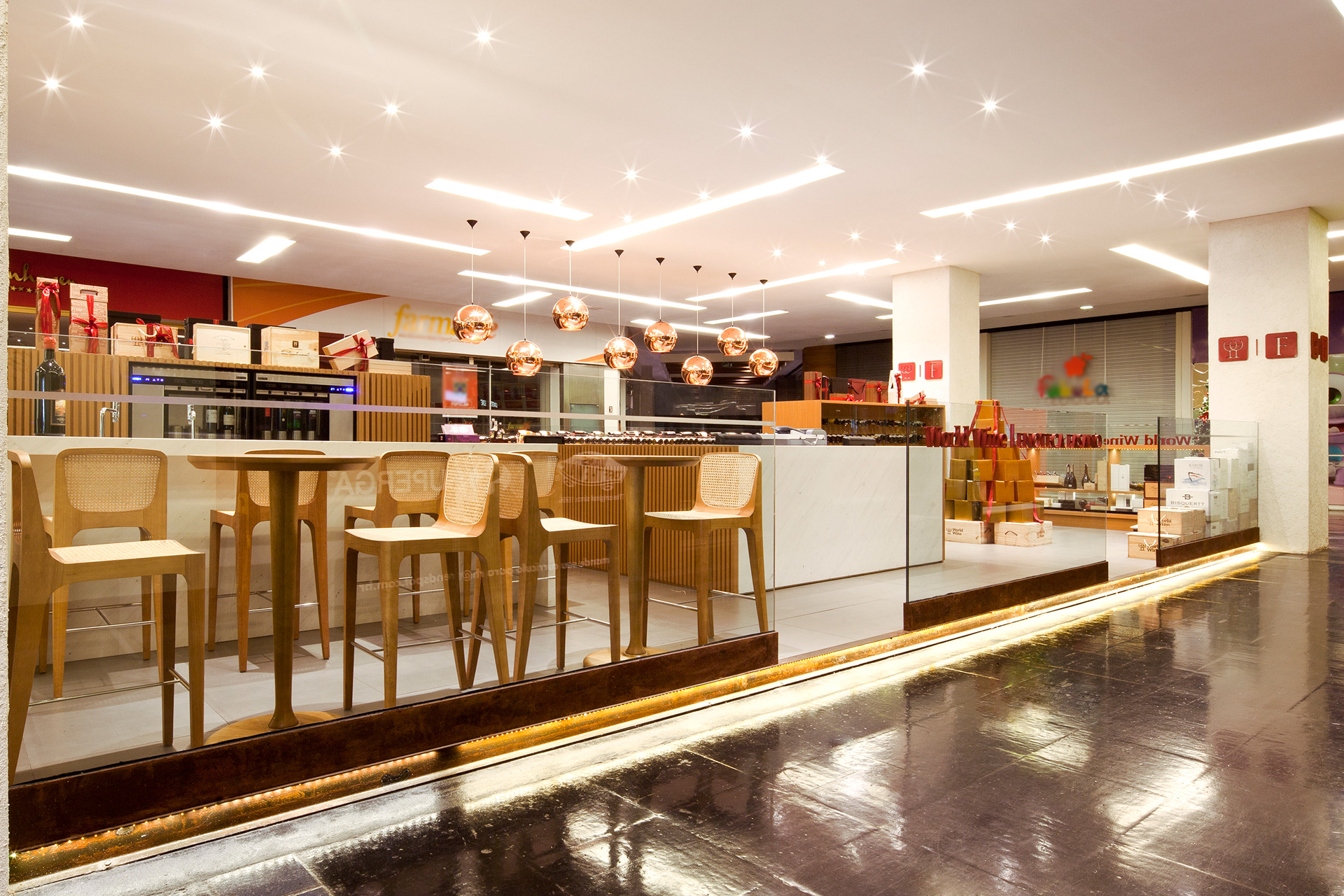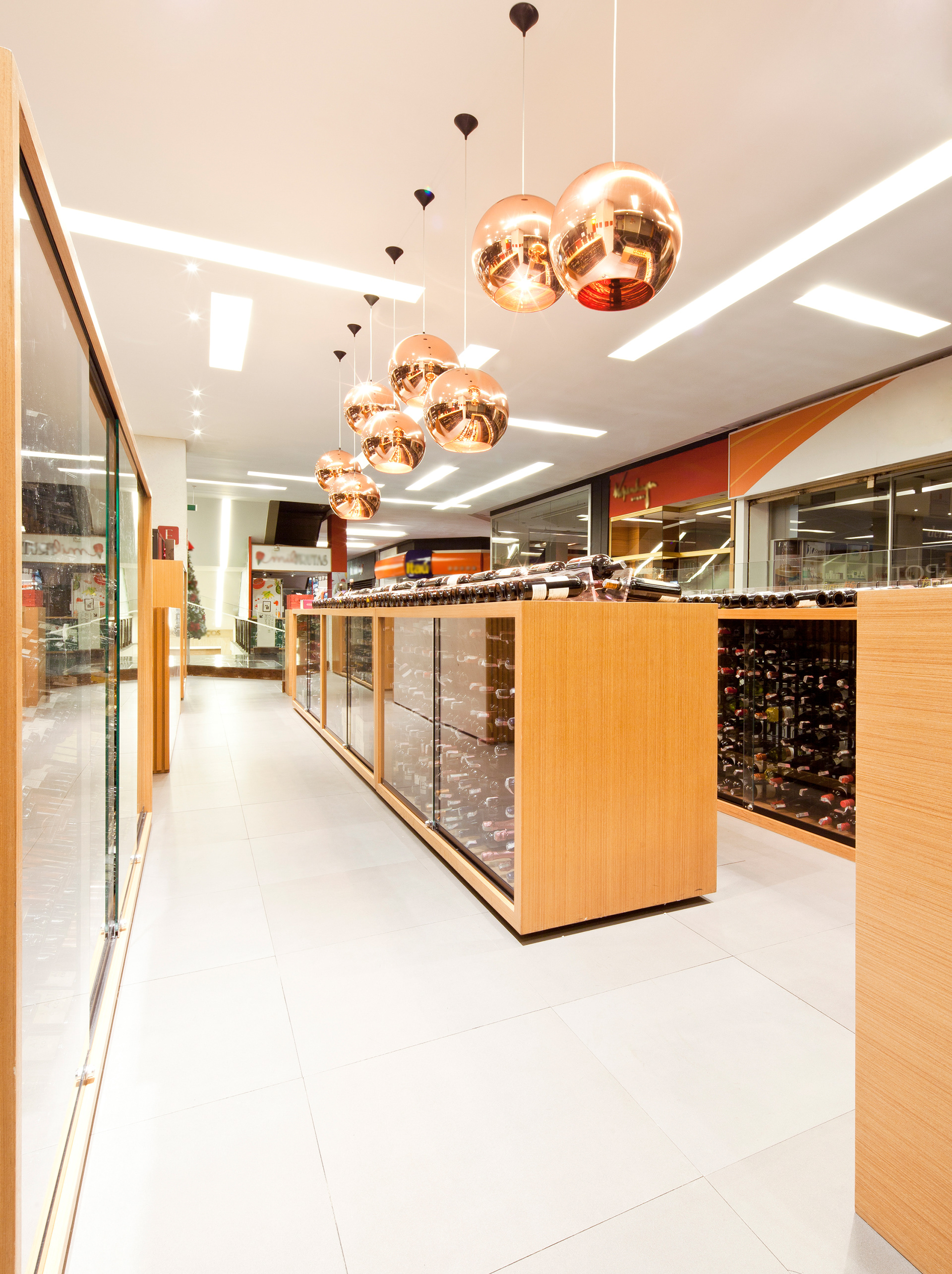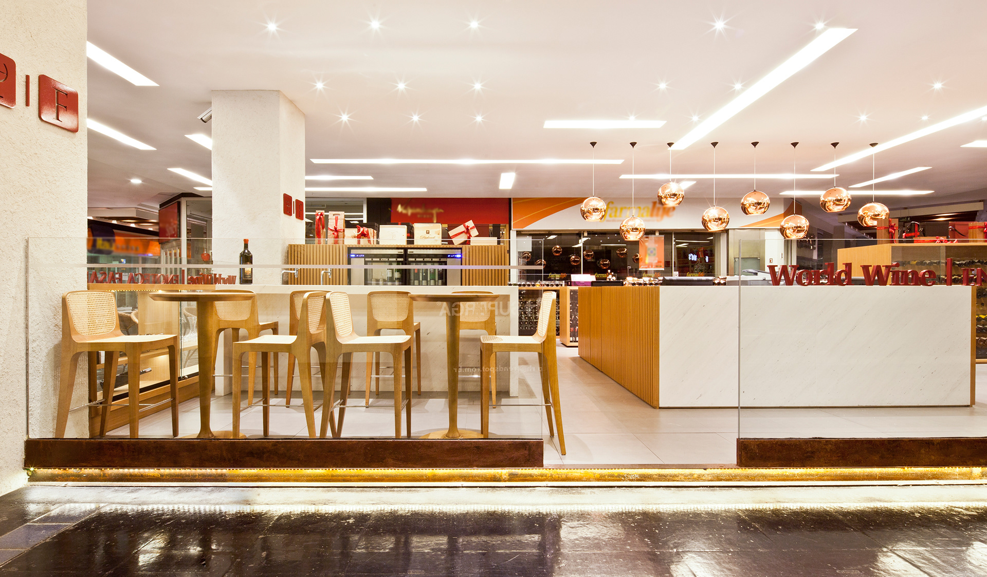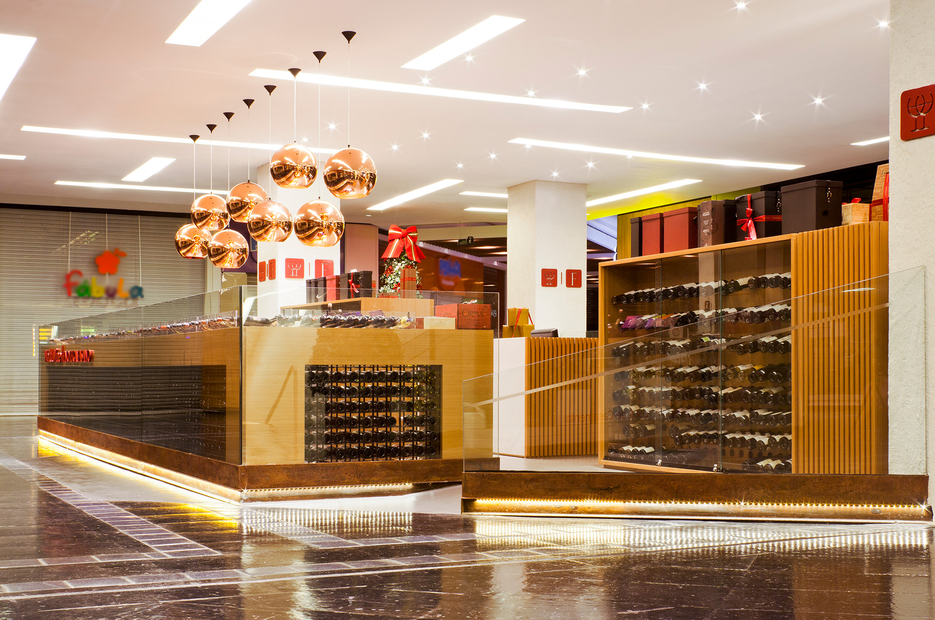 Atendendo um prazo curtíssimo de projeto e obra, o resultado desta loja de 90m2 aberta no meio do Shopping Fashion Mall no Rio de Janeiro foi inovador. O quiosque da World Wine Enoteca Fasano se transformou em um belo espaço de venda e degustação de vinhos, através do uso de materiais transparentes e uma marcenaria e serralheria desenhada sob medida, convidando os consumidores a entrar por qualquer lado da loja.